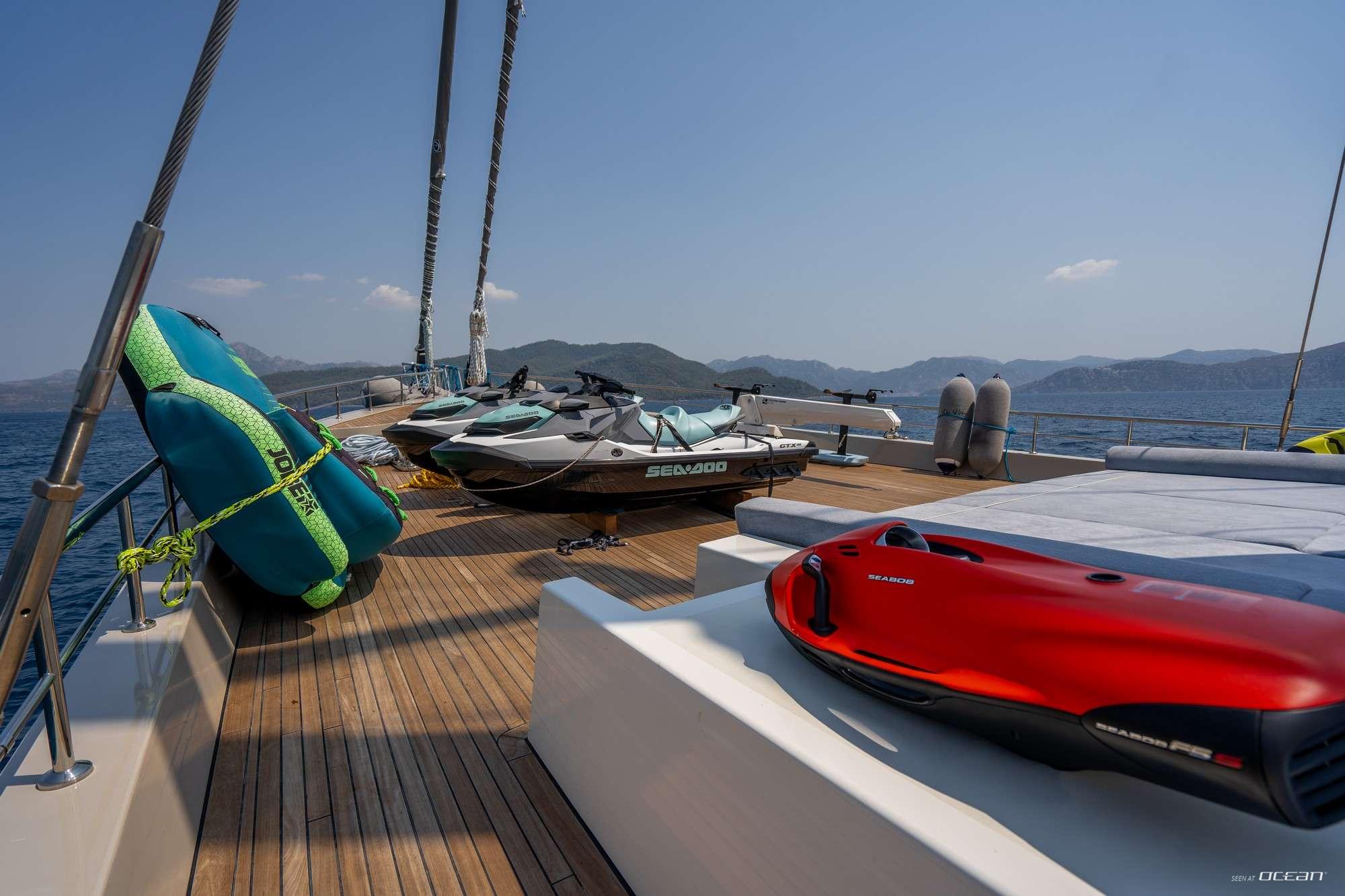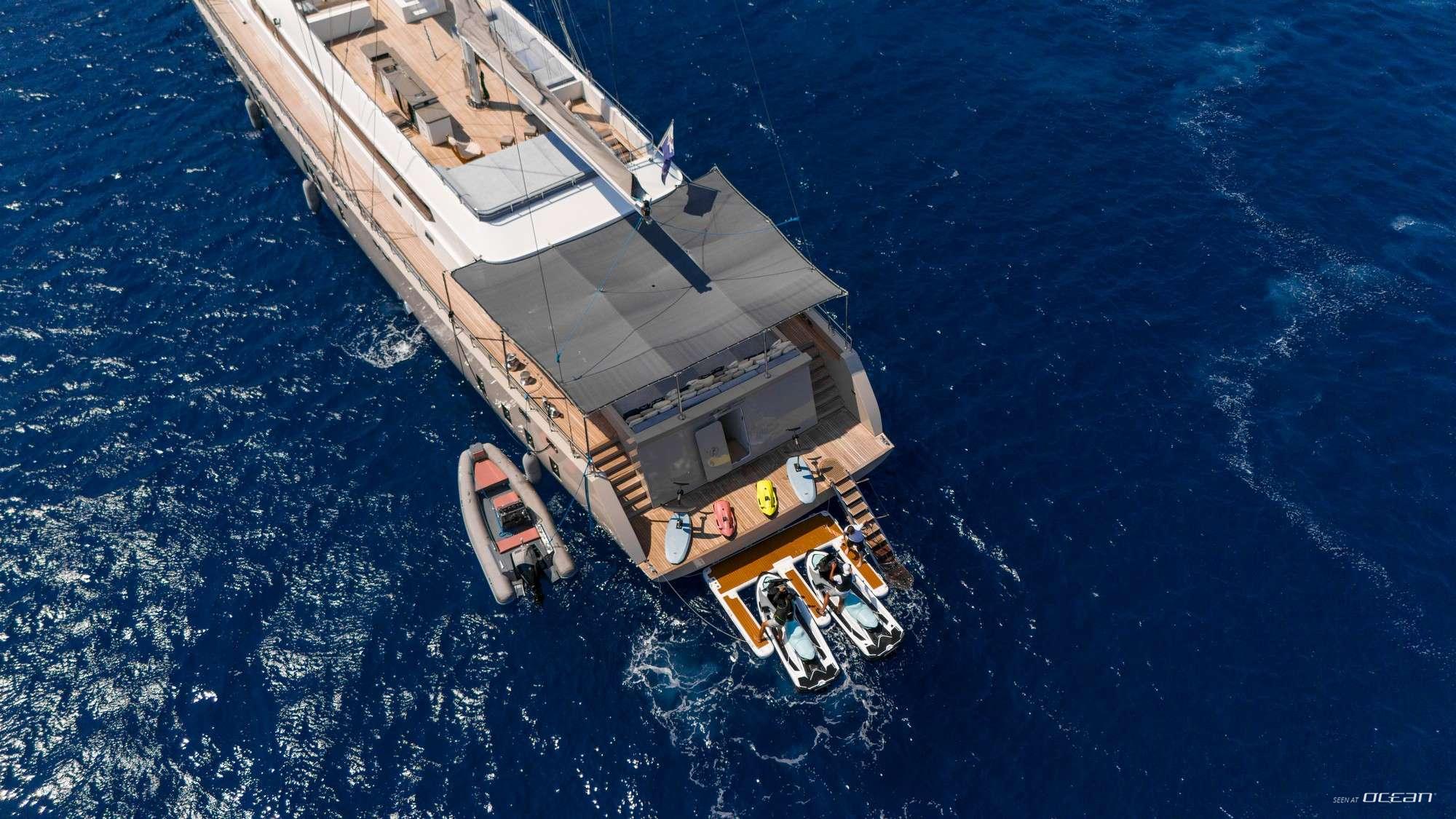 Sport tender 34' Ribco with 2x300hp Mercury engines, service tender Axis 480 with 90hp Mercury engine, 2 jet skis, 2 Seabobs, stand-up paddleboards, kayaks, waterskis, wakeboard, towable sofa, and snorkeling gear
