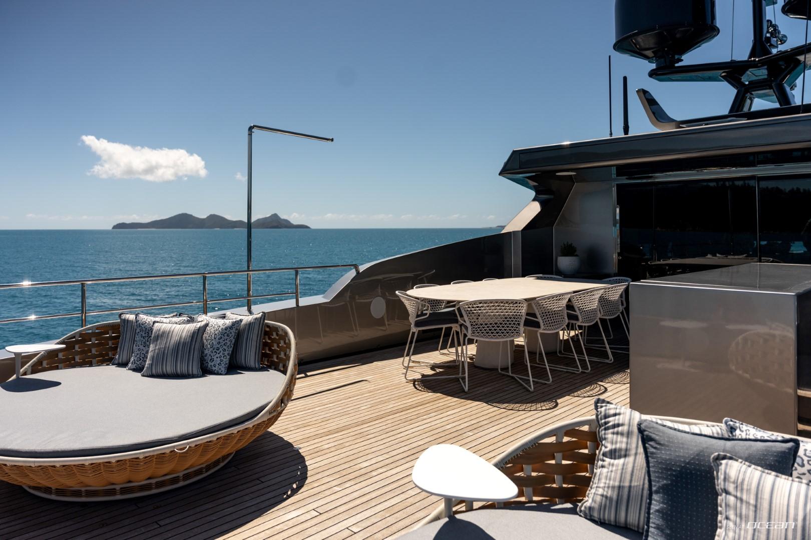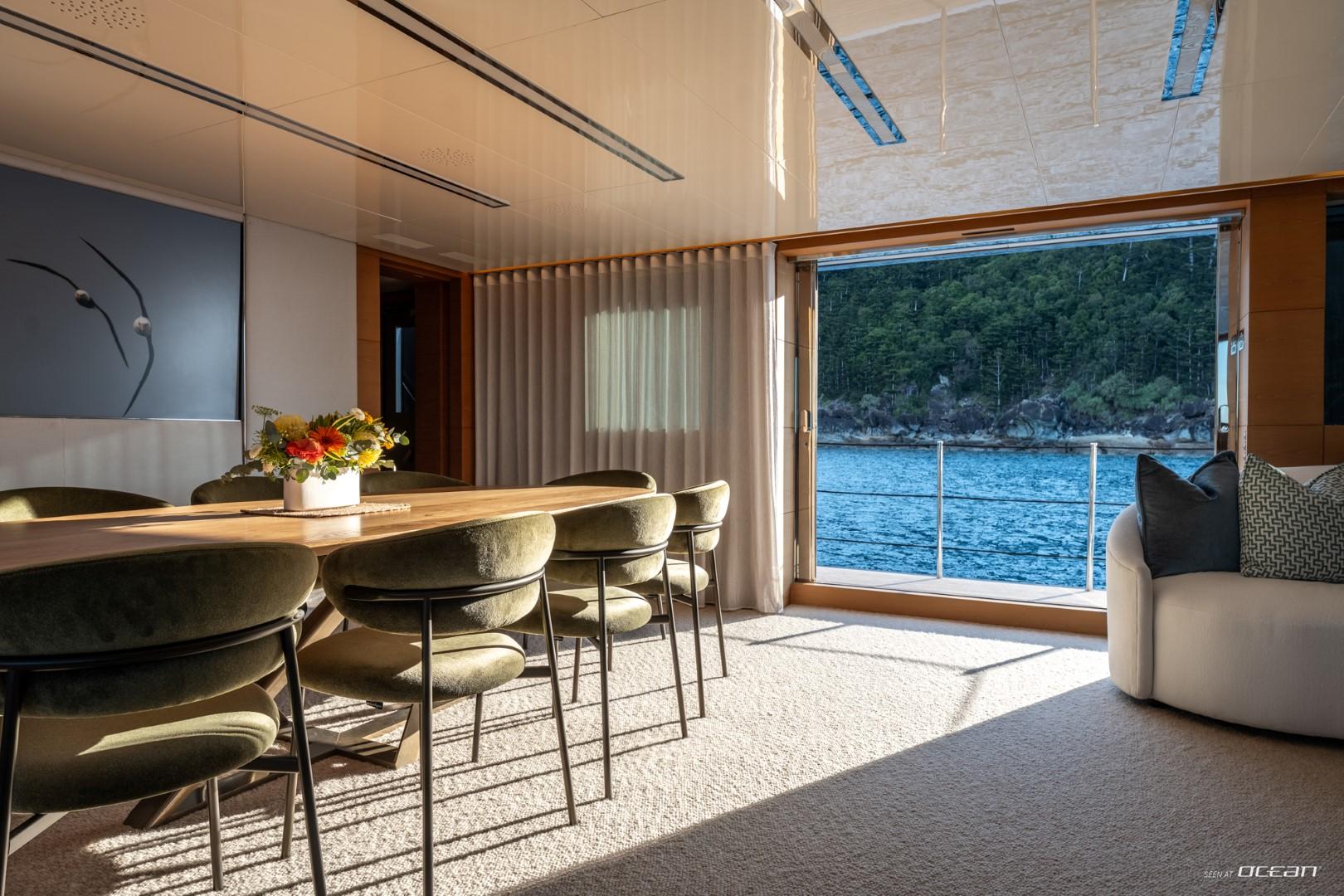 Accommodating 10 guests in five ensuite cabins, 4A offers fold-down balconies, a full-beam aft deck Beach Club, and a sun deck with wet bar, daybeds, BBQ, and shaded areas. Every space is designed to connect with the ocean, delivering comfort, privacy, and relaxation.