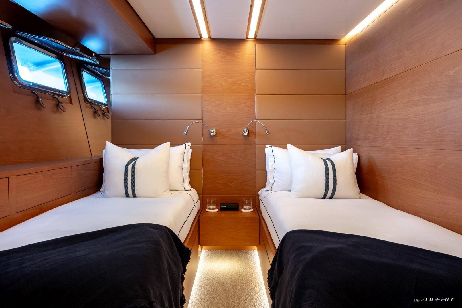 All cabins with en-suite bathrooms, air condition throughout, generators, watermakers, stabilizers underway and at anchor, Starlink Wi-Fi internet, smart TVs in salon and cabins, Sonos sound system, gym gear, swimming platform, and a variety of water toys.