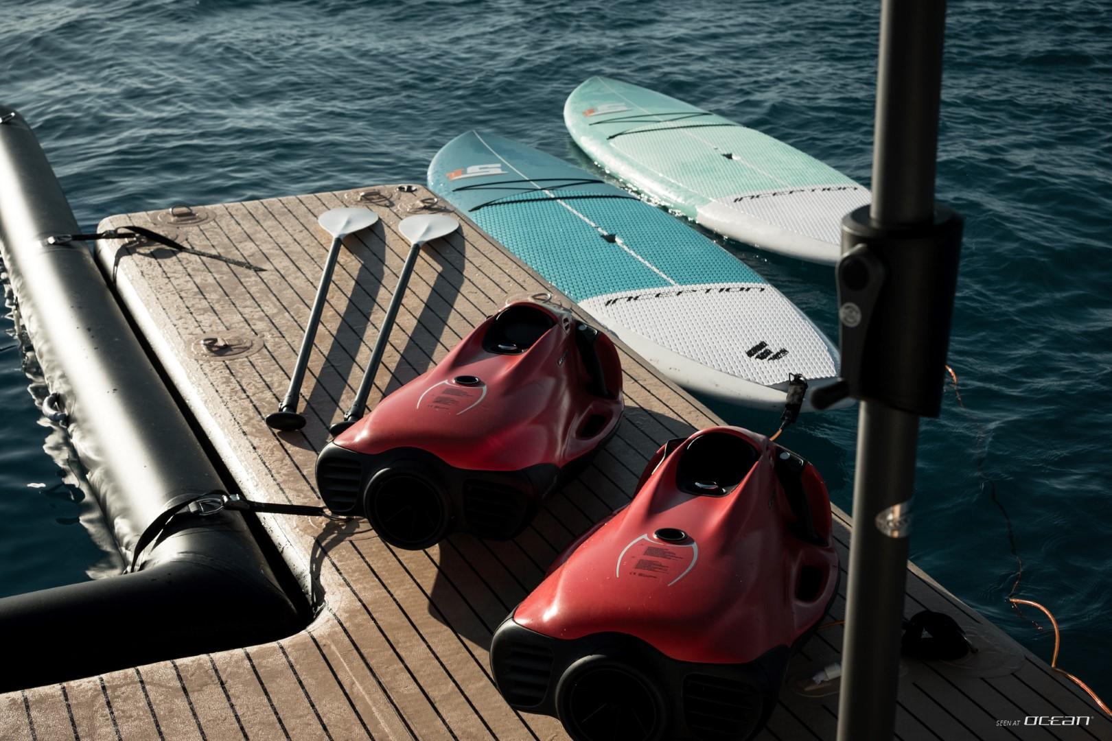 5.3m Novurania tender, 2 Seabobs SR5, 4 stand-up paddleboards, float dock with swimming pool and jellyfish net, spear guns, beach toys, fishing and snorkeling gear