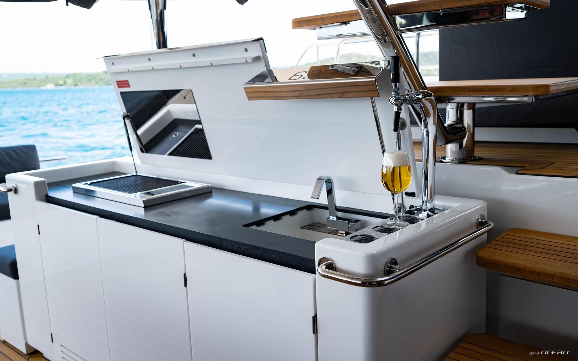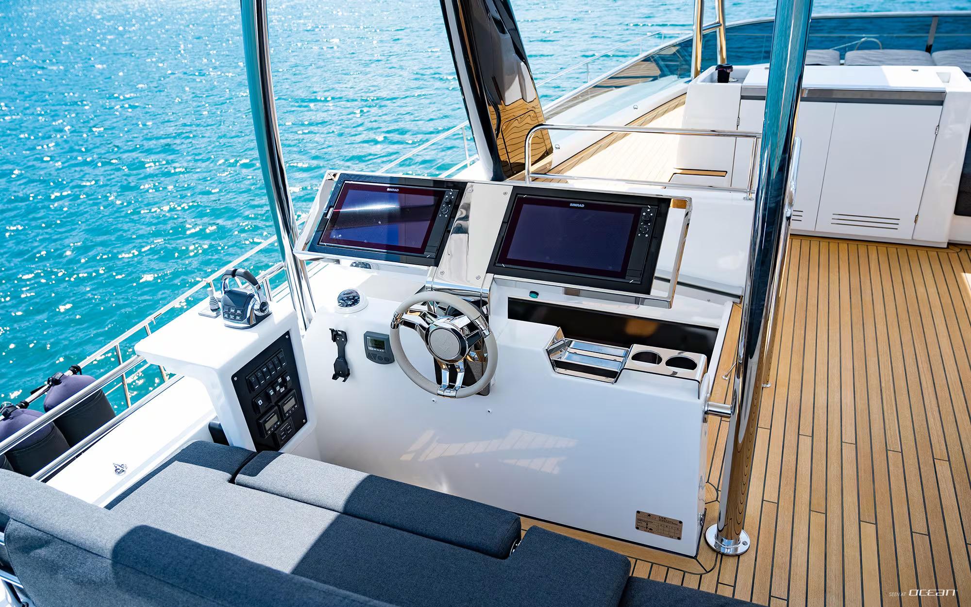The flybridge is one of AEGIR’s standout features, offering panoramic views, a retractable hardtop bimini and generous seating for dining or lounging. Guests can enjoy shaded relaxation, sunbathing or refreshing drinks from the flybridge fridges while cruising the islands. The cockpit and foredeck add further alfresco options, creating multiple zones for outdoor enjoyment. AEGIR power catamaran carries a 3.85 William jet tender with a 125hp engine, 2 seabobs, an electric surfboard and a Tiwal 3 sailboat for active days on the water. This blend of comfort, equipment and crew hospitality ensures a stylish and memorable charter experience across the Adriatic.