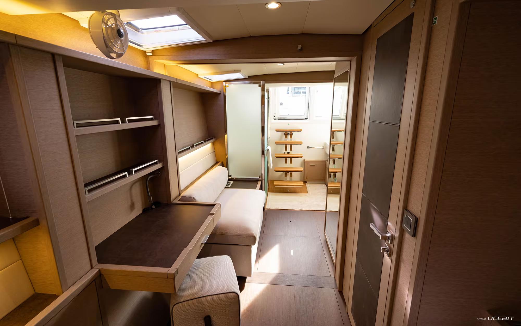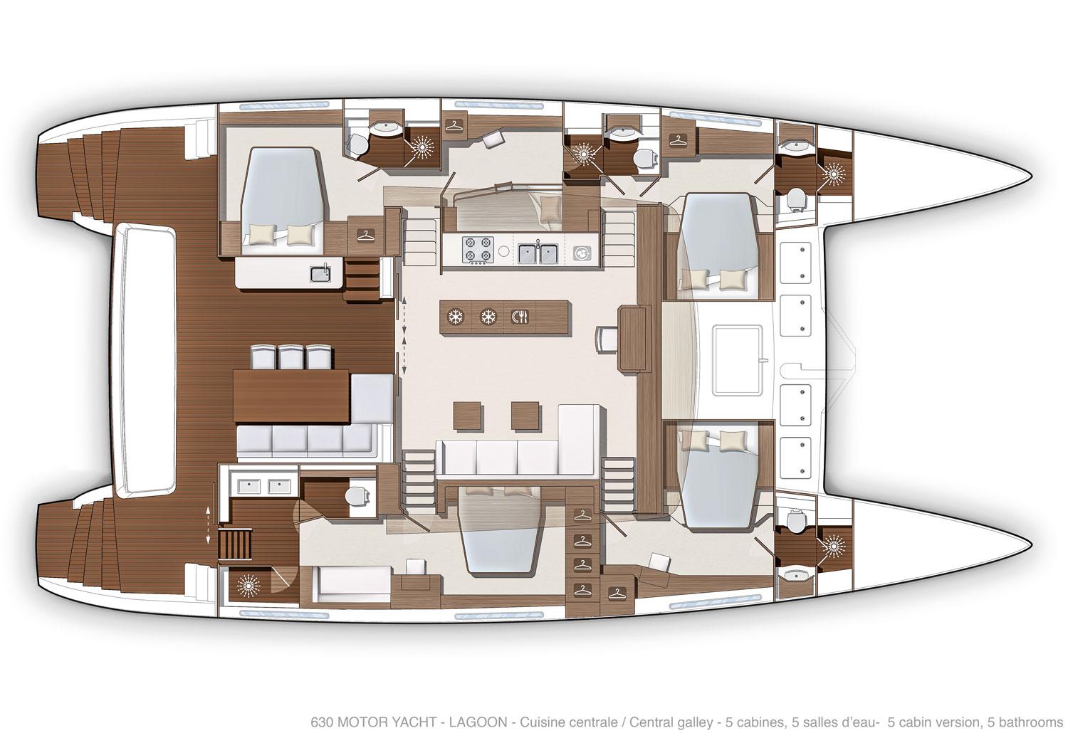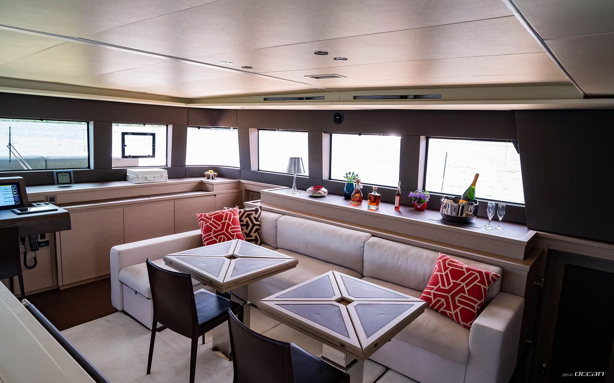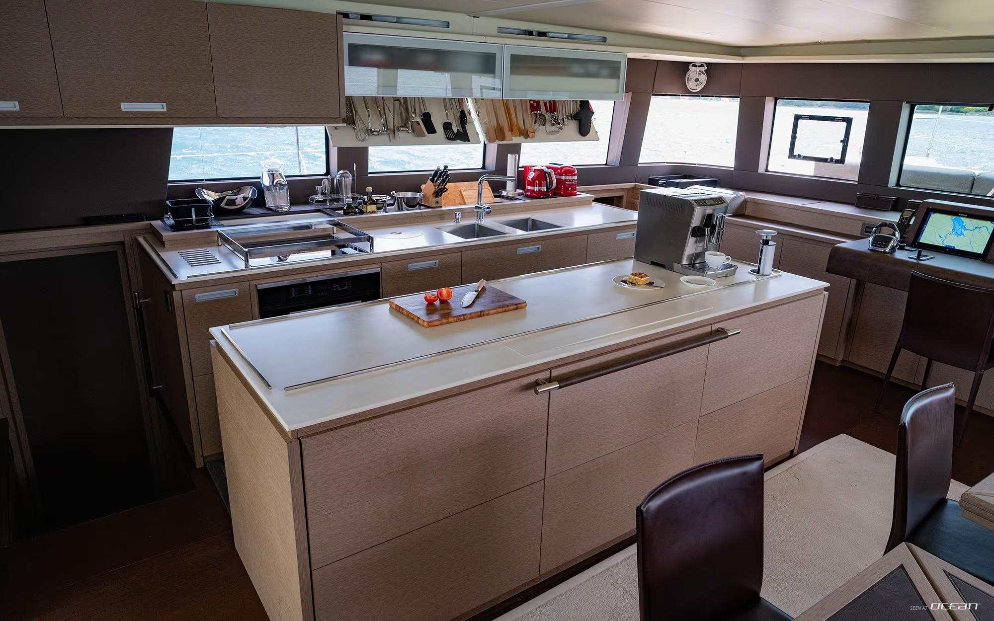 The salon is bright, full-height and arranged around a central galley to enhance flow and maximise cabin volume. Large windows bring in natural light, while the refined decor maintains a clean, contemporary mood. Guests appreciate the seamless transition between lounge, dining and helm areas, all designed for effortless circulation on board. AEGIR Lagoon 630 for charter delivers a comfortable and inviting interior that suits both families and groups of friends. Every space feels curated yet relaxed, ideal for extended cruising.