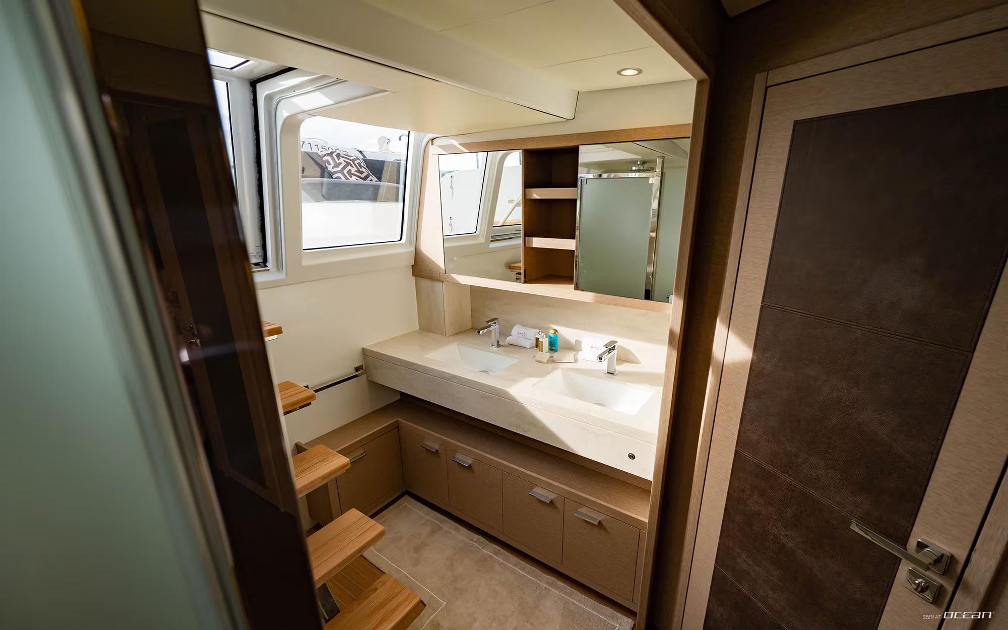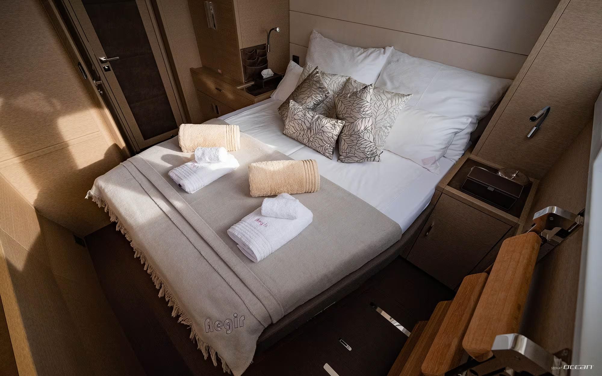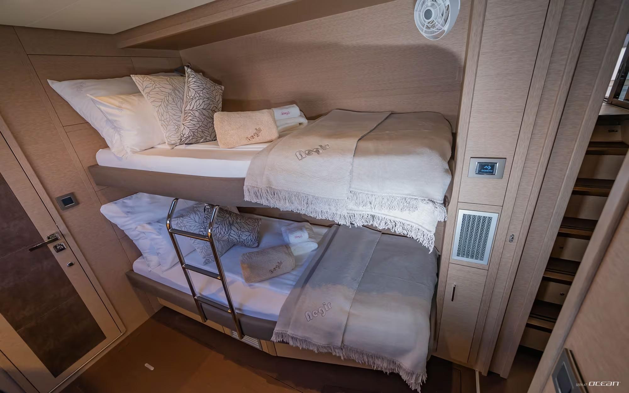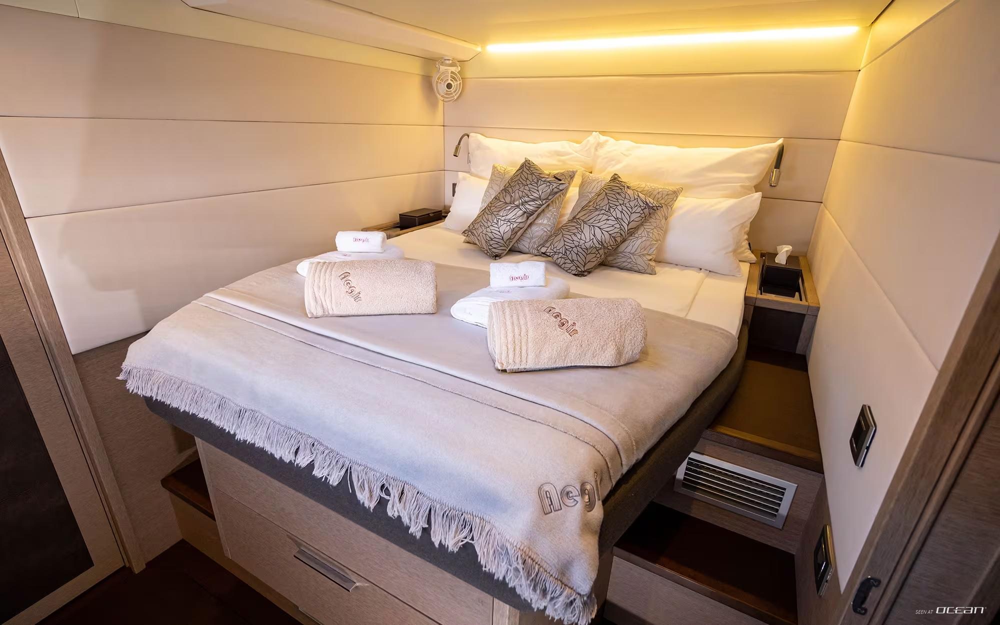 AEGIR crewed power catamaran for charter in Croatia accommodates up to 10 guests in 5 ensuite cabins arranged as 4 doubles and 1 bunk cabin. The central galley configuration allows a spacious master suite and optimised guest areas throughout both hulls. Two single bow cabins provide private quarters for the captain and hostess with direct deck access, ensuring minimal movement through guest zones. This thoughtful layout supports a calm onboard atmosphere and excellent privacy. Each cabin benefits from natural light, practical storage and a refined finish.