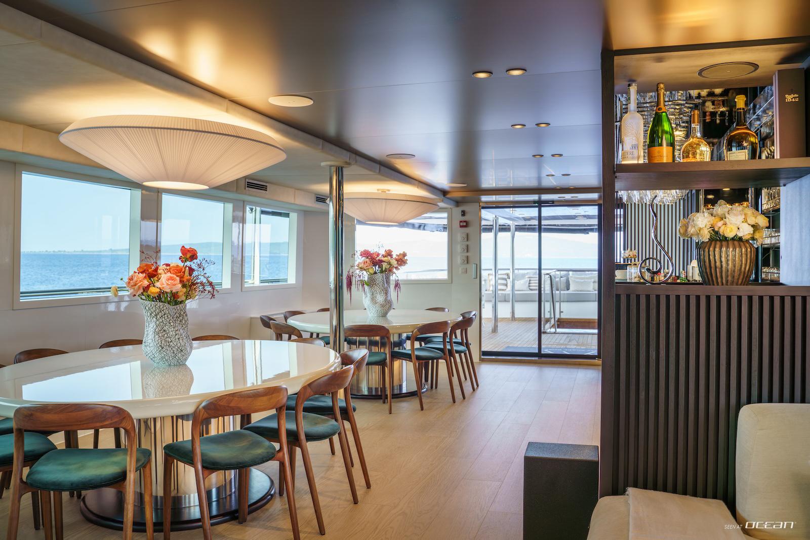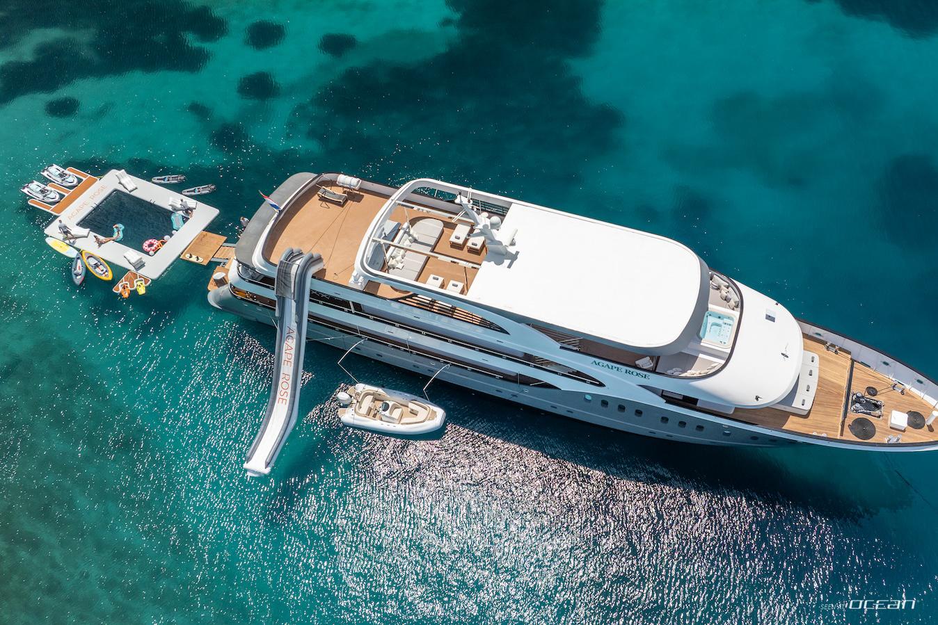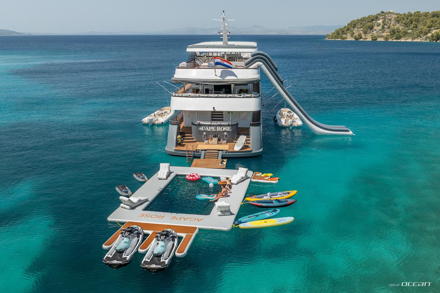 APAPE ROSE luxury yacht for charter boasts 4 decks and spacious, relaxing areas spreading over her sun deck and the upper deck. Beach villa is the theme for the design, and fun is the motto when it comes to entertainment on board. Water toys carried on board include a 150hp strong tender for guest transfers and water sports, jet-skis, seabobs, an efoil fliteboard, a slide, kayaks, four stand-up paddleboards, towables, water-skis for children and adults, wakeboards and an inflatable swimming platform with netted pool. Other notable highlights include fully-equipped gym, sauna, massage and cinema rooms.