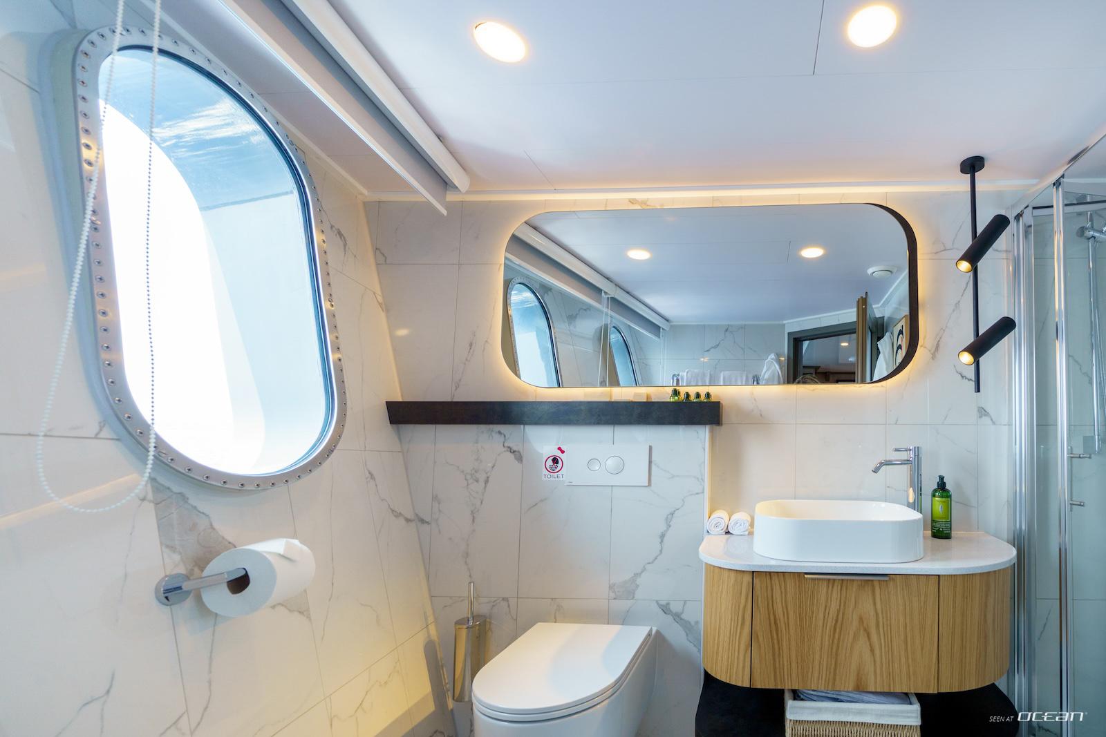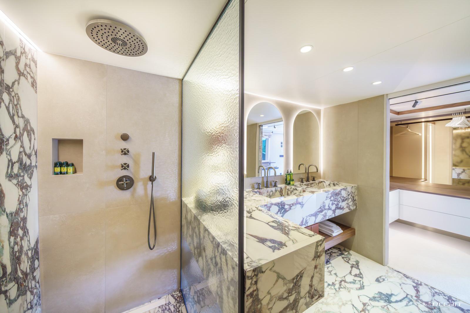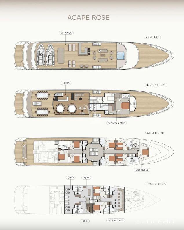 All cabins with en-suite bathrooms, air condition throughout, generators, watermakers, deck jacuzzi, Wi-Fi internet, each cabin with TV, sound system and safe, state-of-the-art NOHRD gym room, sauna and massage rooms, full home movie theatre room, all outside cushions and sun pads for generous sunbathing areas, swimming platform, stern/cockpit shower and a variety of water toys.