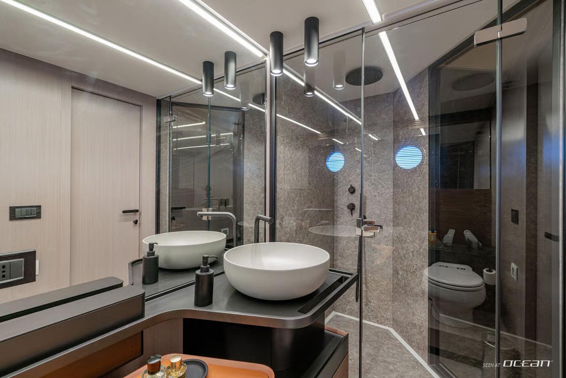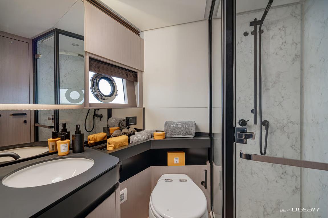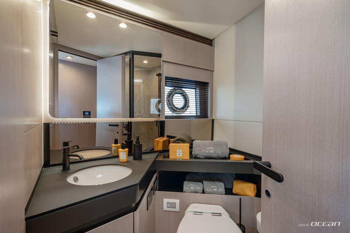 All cabins except for one twin cabin with en-suite bathrooms, air condition throughout, generator, stabilizers at anchor, stabilizers underway, watermaker, TV in salon and master cabin, Bluetooth sound system, Starlink Wi-Fi internet, and water toys