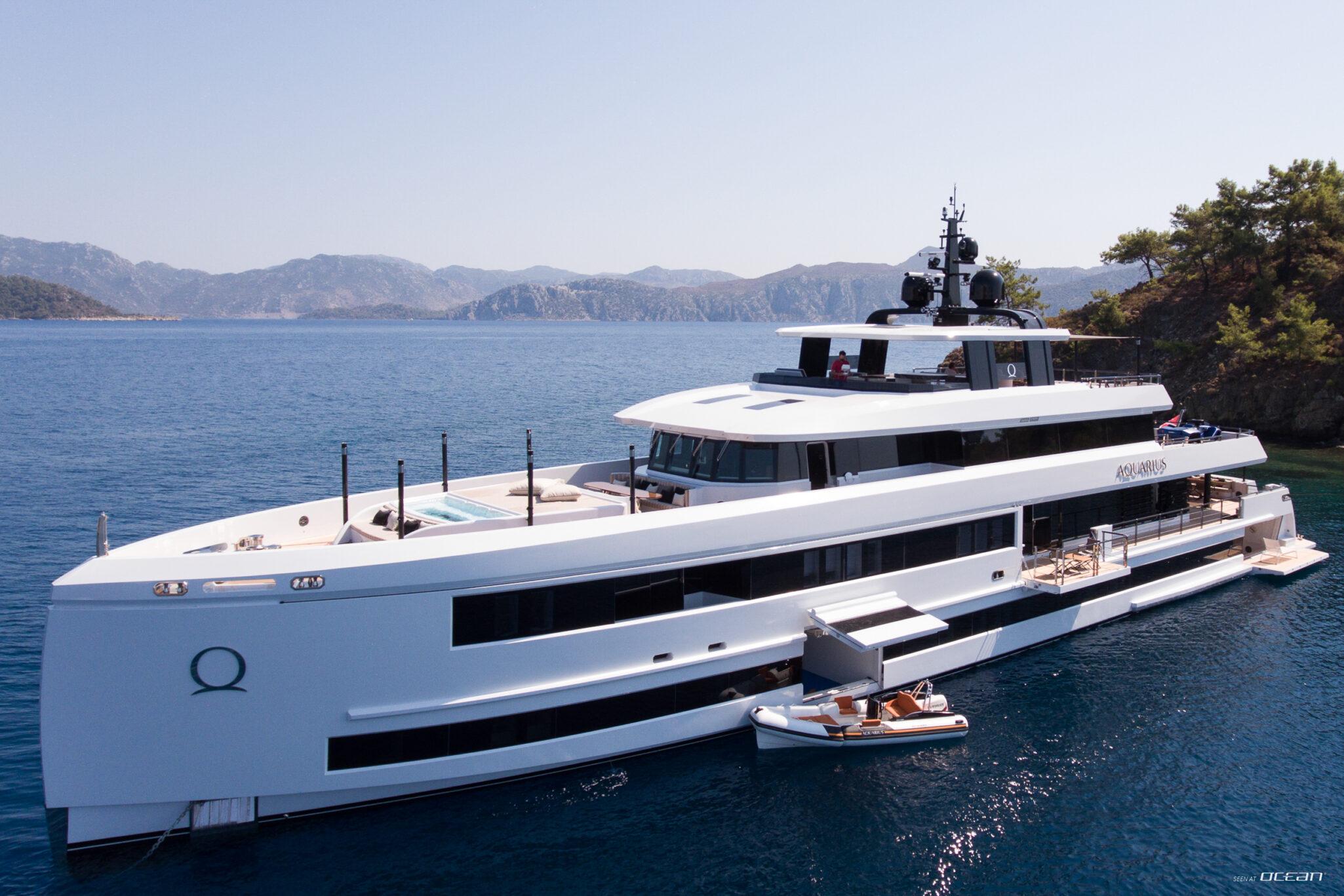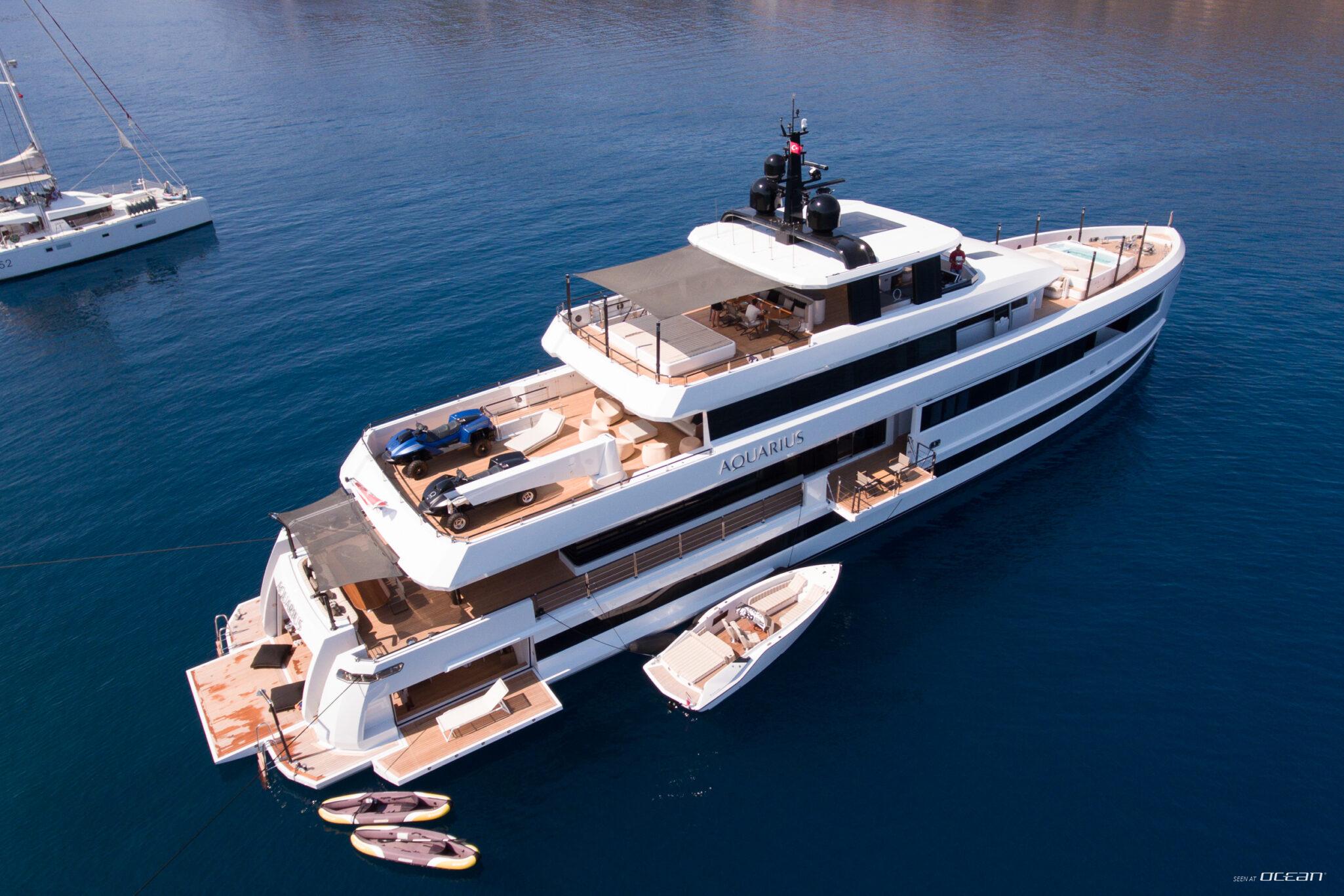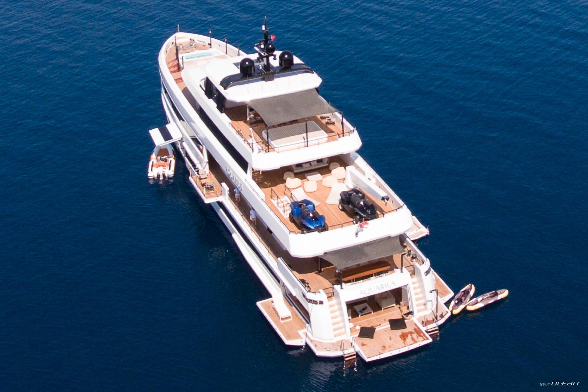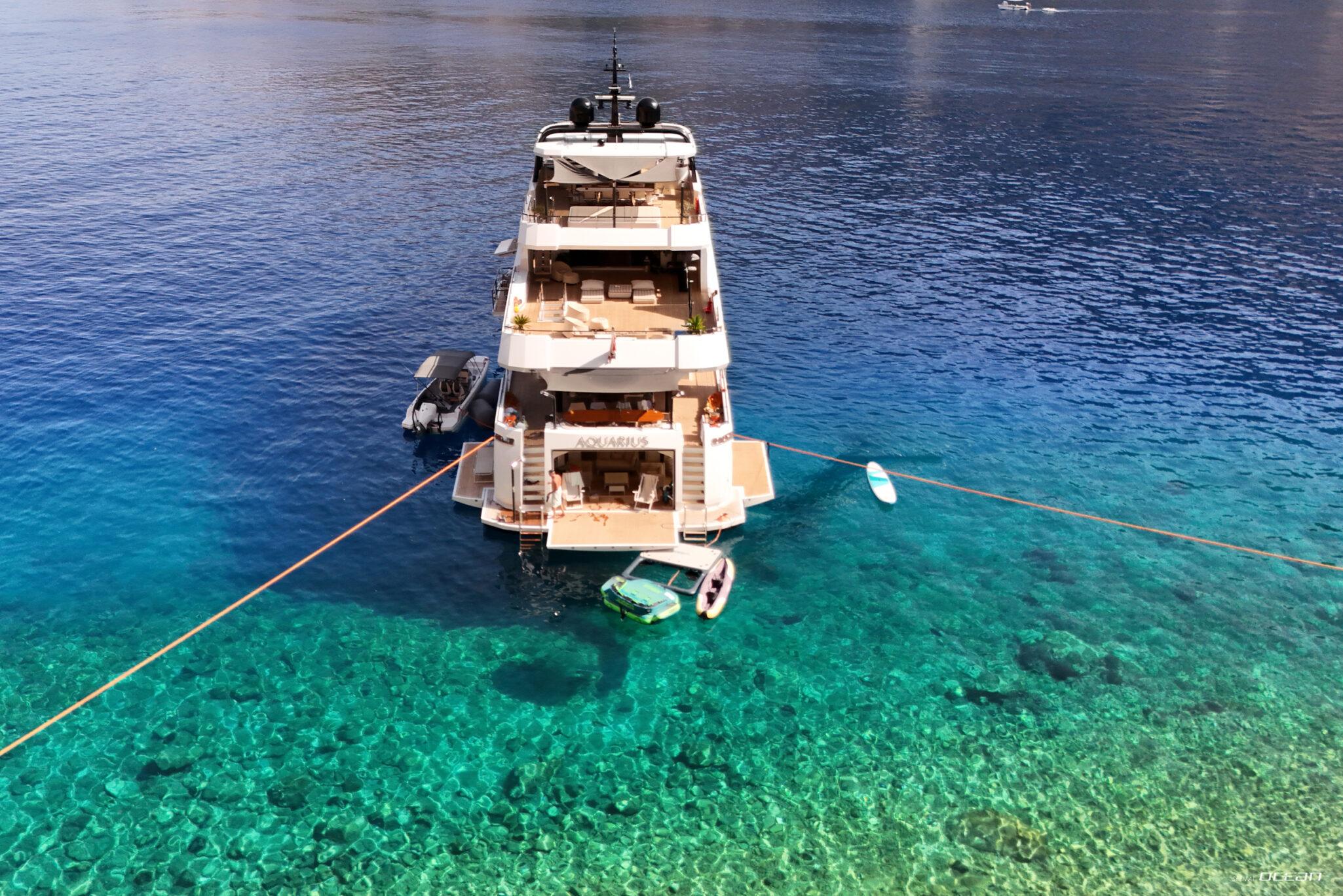 M/Y AQUARIUS for charter features multiple outdoor areas designed for everyday use, including a deck jacuzzi, skylounge, and a beach club positioned at water level for direct sea access. The yacht carries a selection of water toys, including an Axopar tender, diving scooter, towables, and boards, offering a practical setup for exploring bays and anchorages throughout the region.
