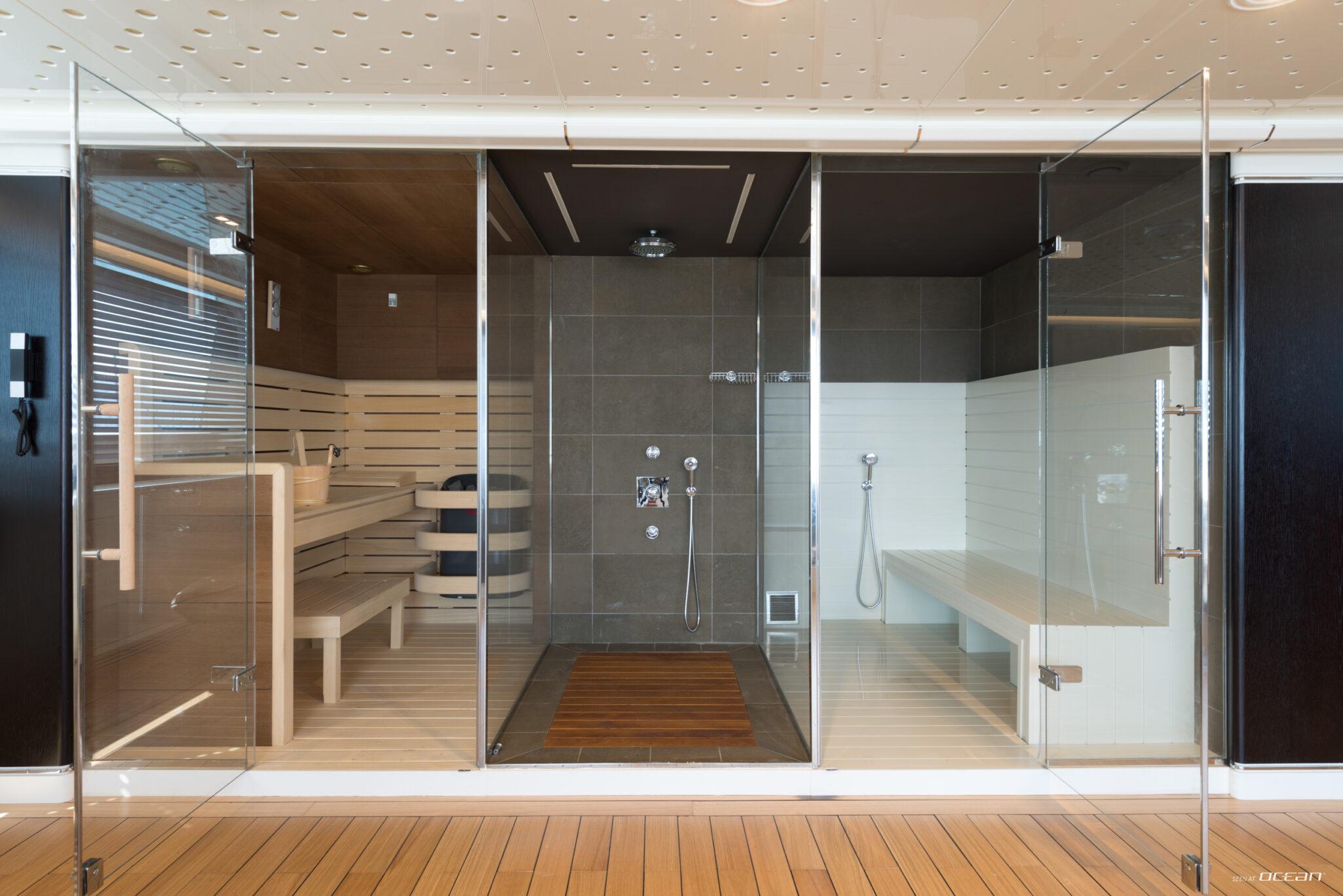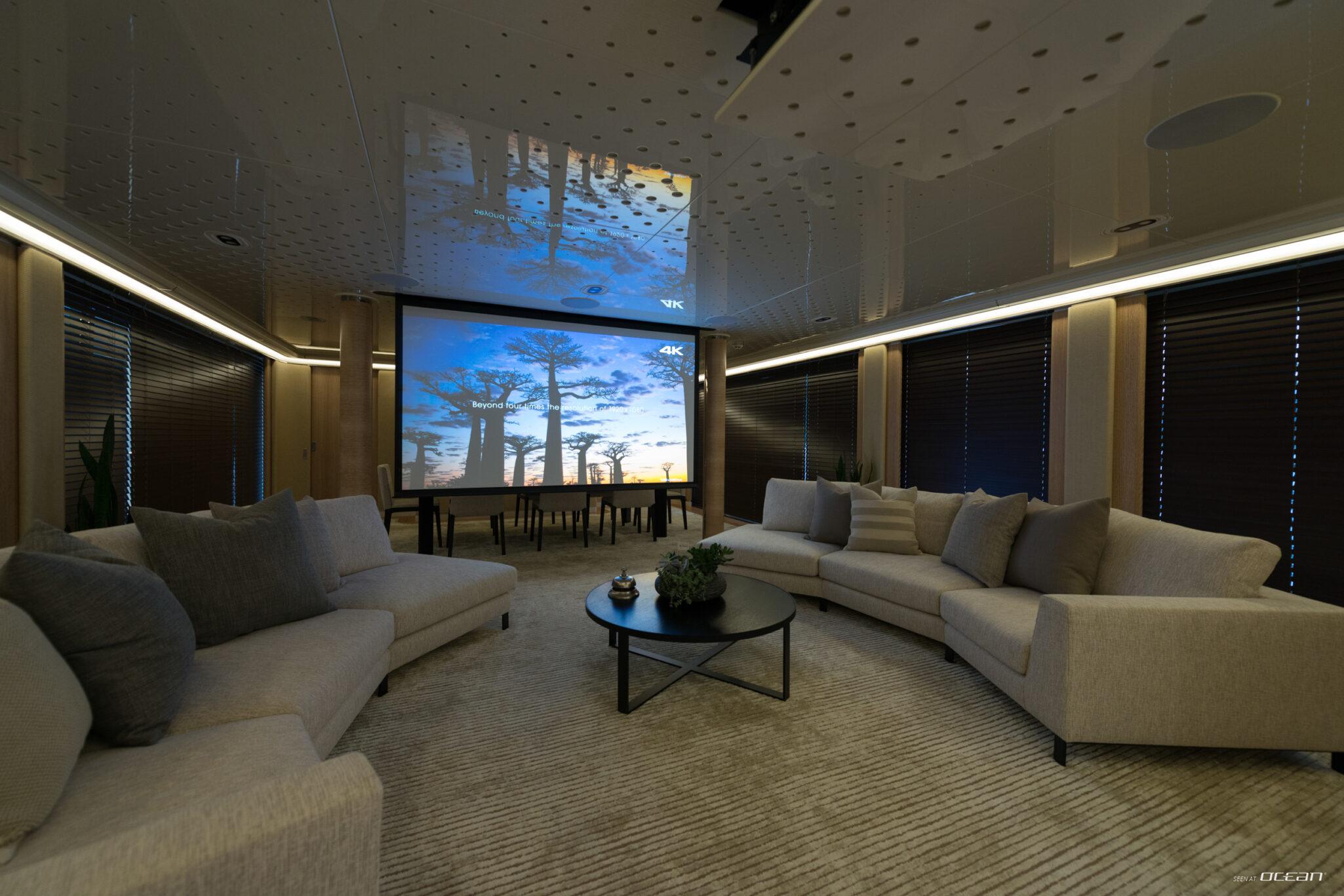 All cabins with en-suite bathrooms, private master's office, 2 private fixed balconies, air condition throughout, 2 generators, Creston music system throughout the yacht, 4K Home theatre projection screen functioning with Apple/Android TV in salon, master cabin, and skylounge, Starlink Wi-Fi internet, gym gear, jacuzzi, beach club, and a variety of water toys.