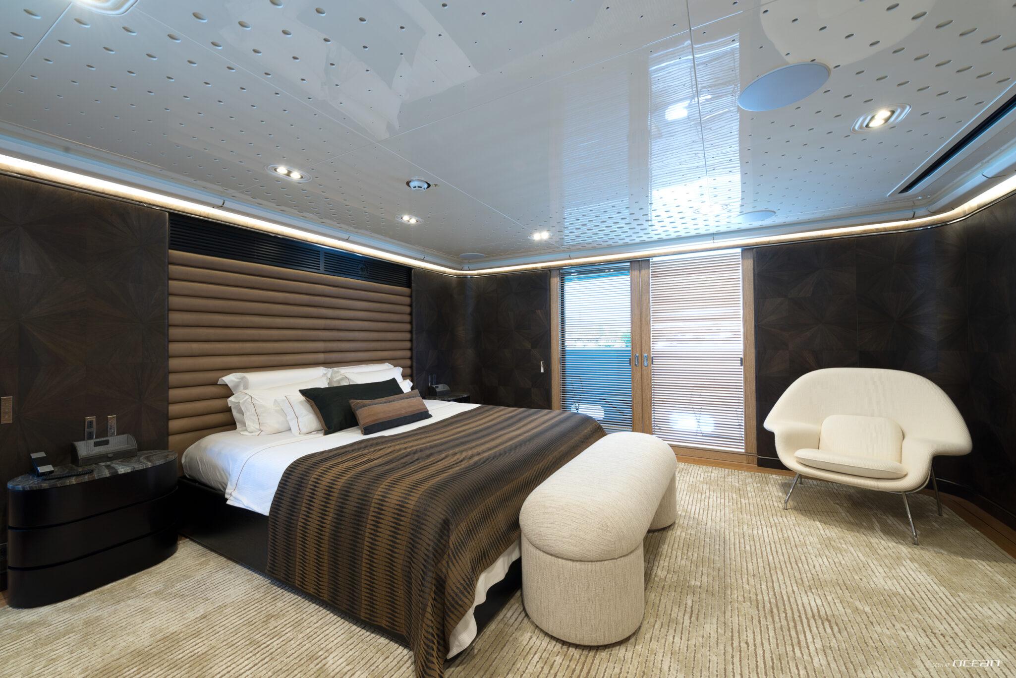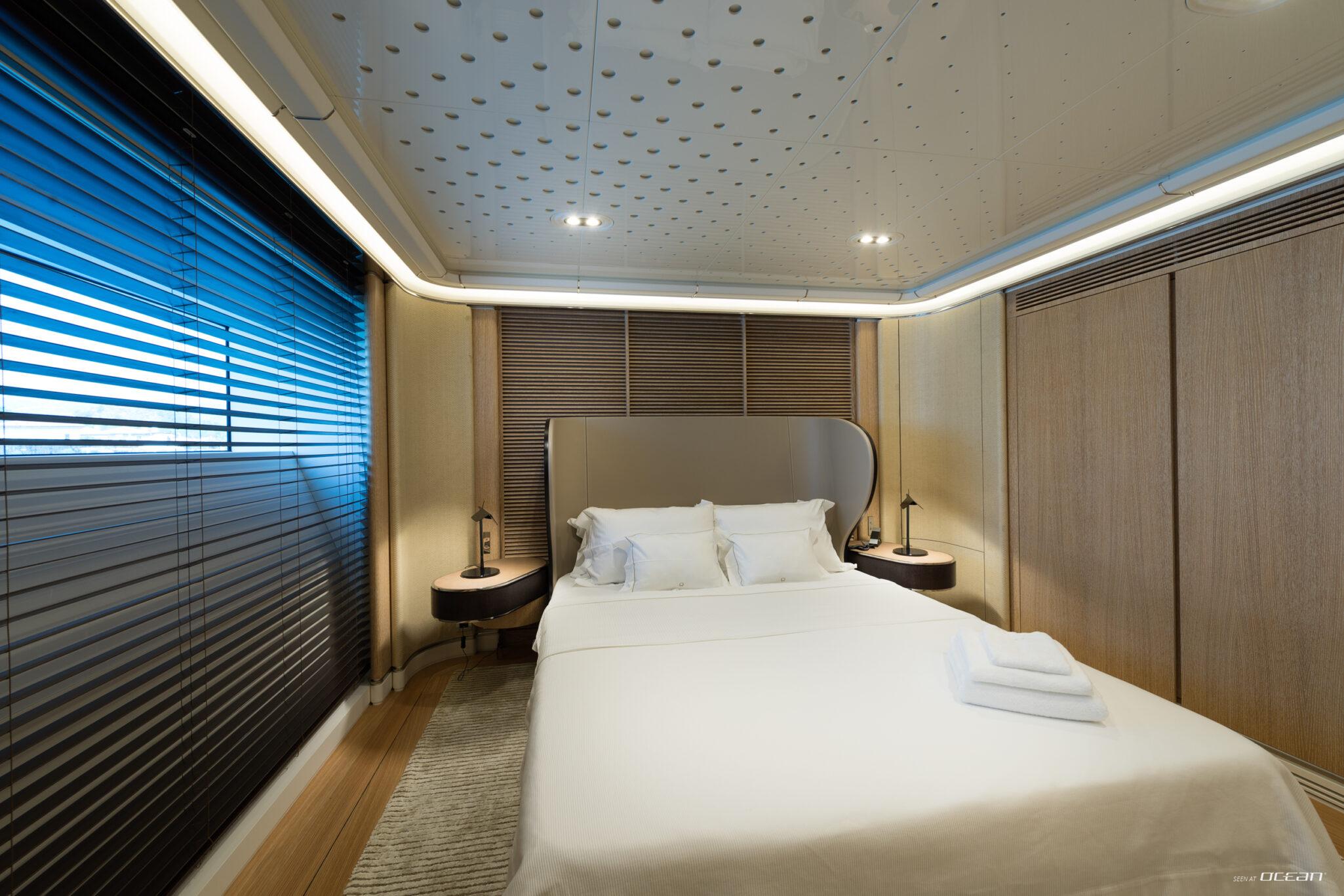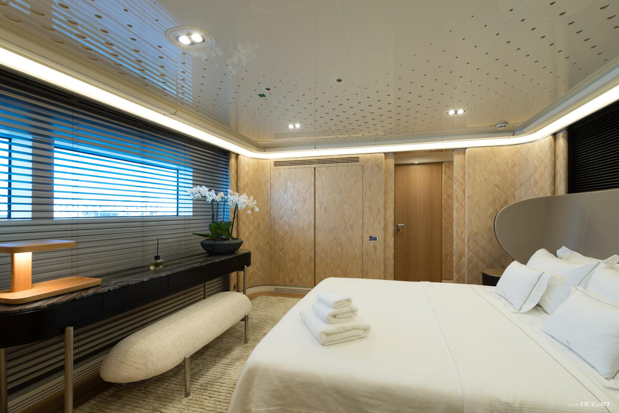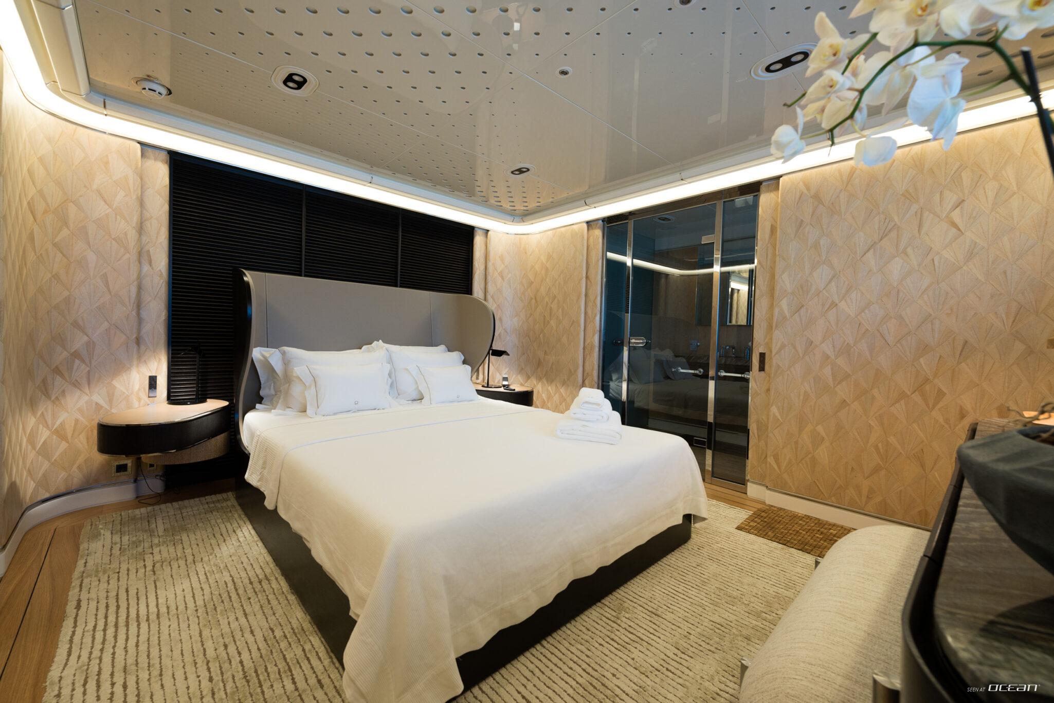 Charter Yacht AQUARIUS accommodates up to 10 guests in 5 cabins, including a main deck master suite with 2 balconies and an office, along with 4 double cabins on the lower deck, one arranged as a twin. This layout supports a variety of group configurations, from families to couples, while each cabin is equipped with ensuite facilities, smart TVs, Starlink internet, and integrated audio-visual systems for onboard entertainment.