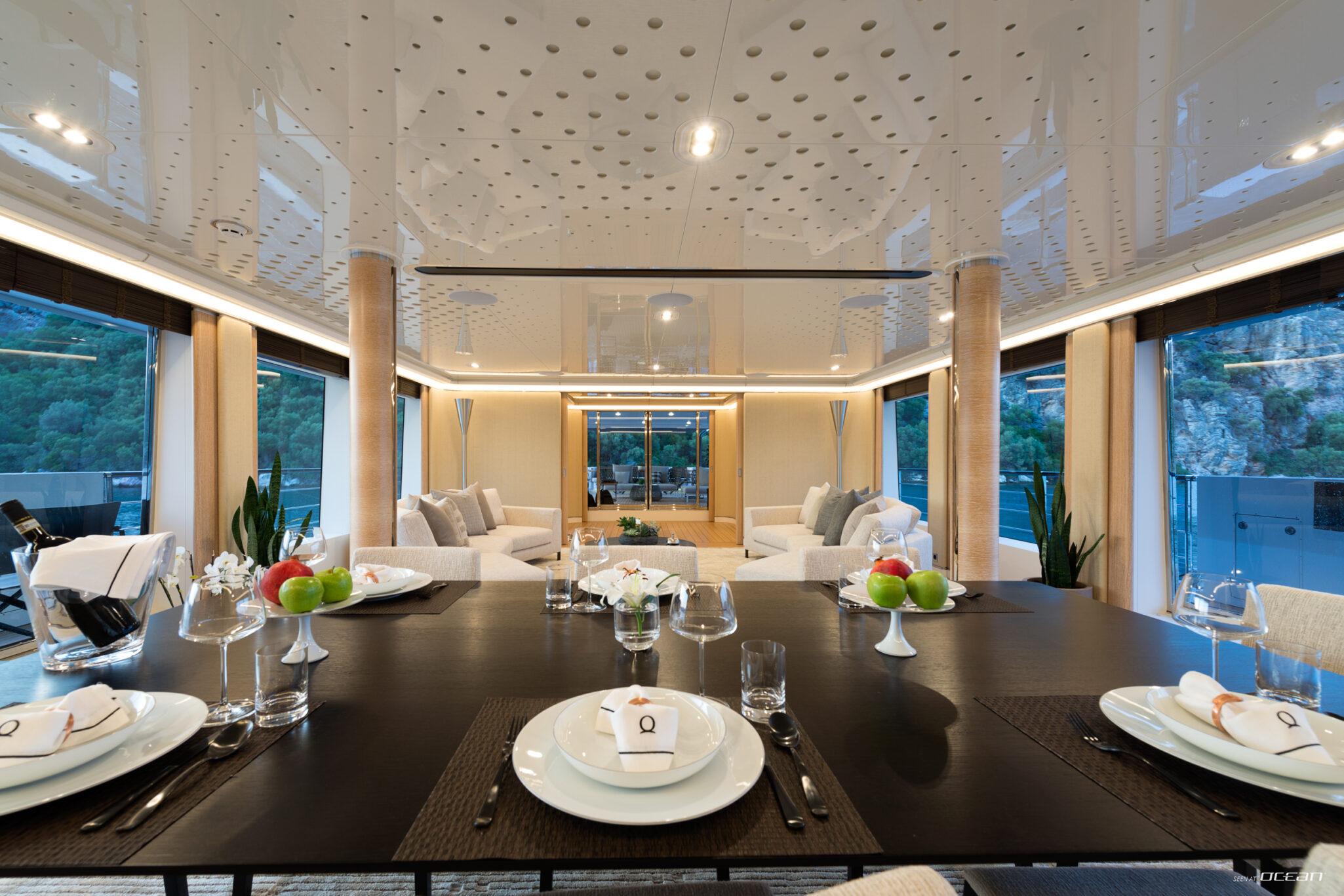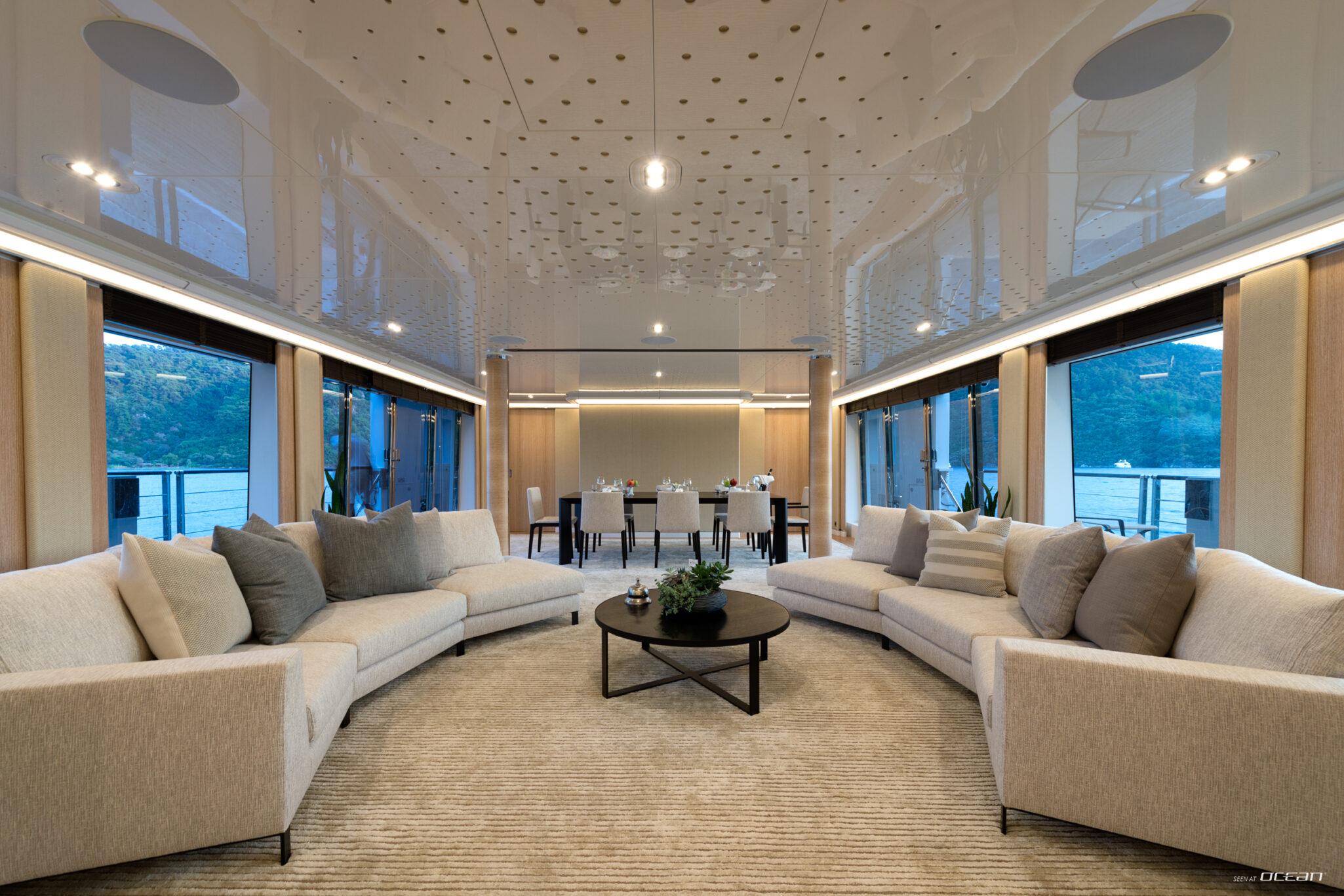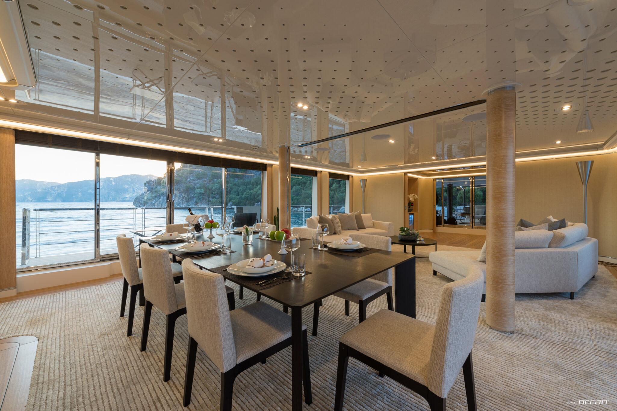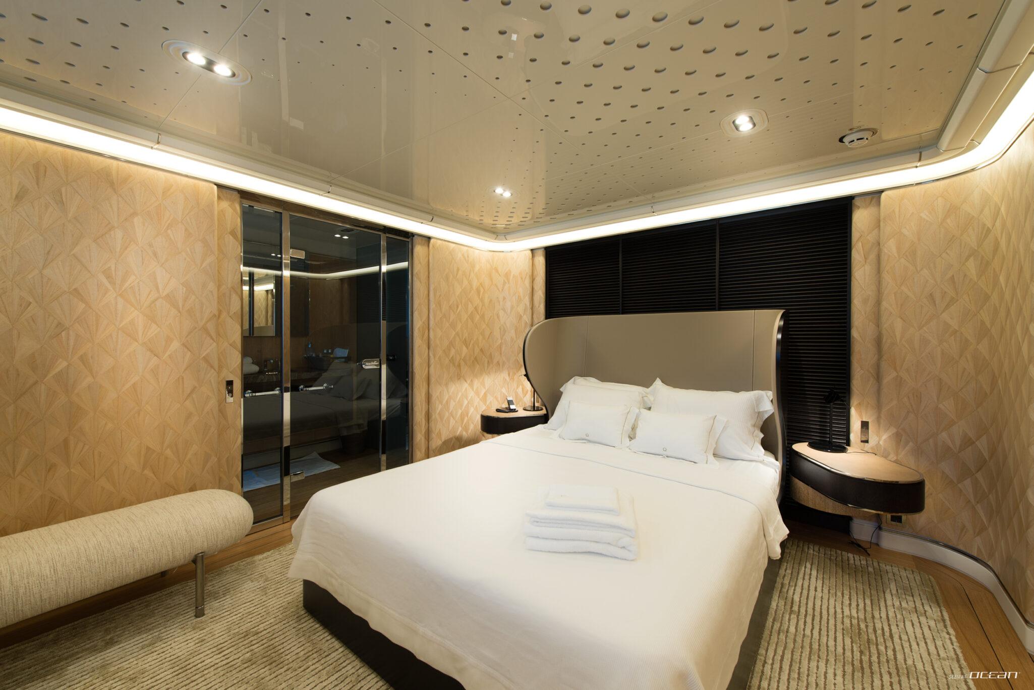 Charter Yacht AQUARIUS accommodates up to 10 guests in 5 cabins, including a main deck master suite with 2 balconies and an office, along with 4 double cabins on the lower deck, one arranged as a twin. This layout supports a variety of group configurations, from families to couples, while each cabin is equipped with ensuite facilities, smart TVs, Starlink internet, and integrated audio-visual systems for onboard entertainment.