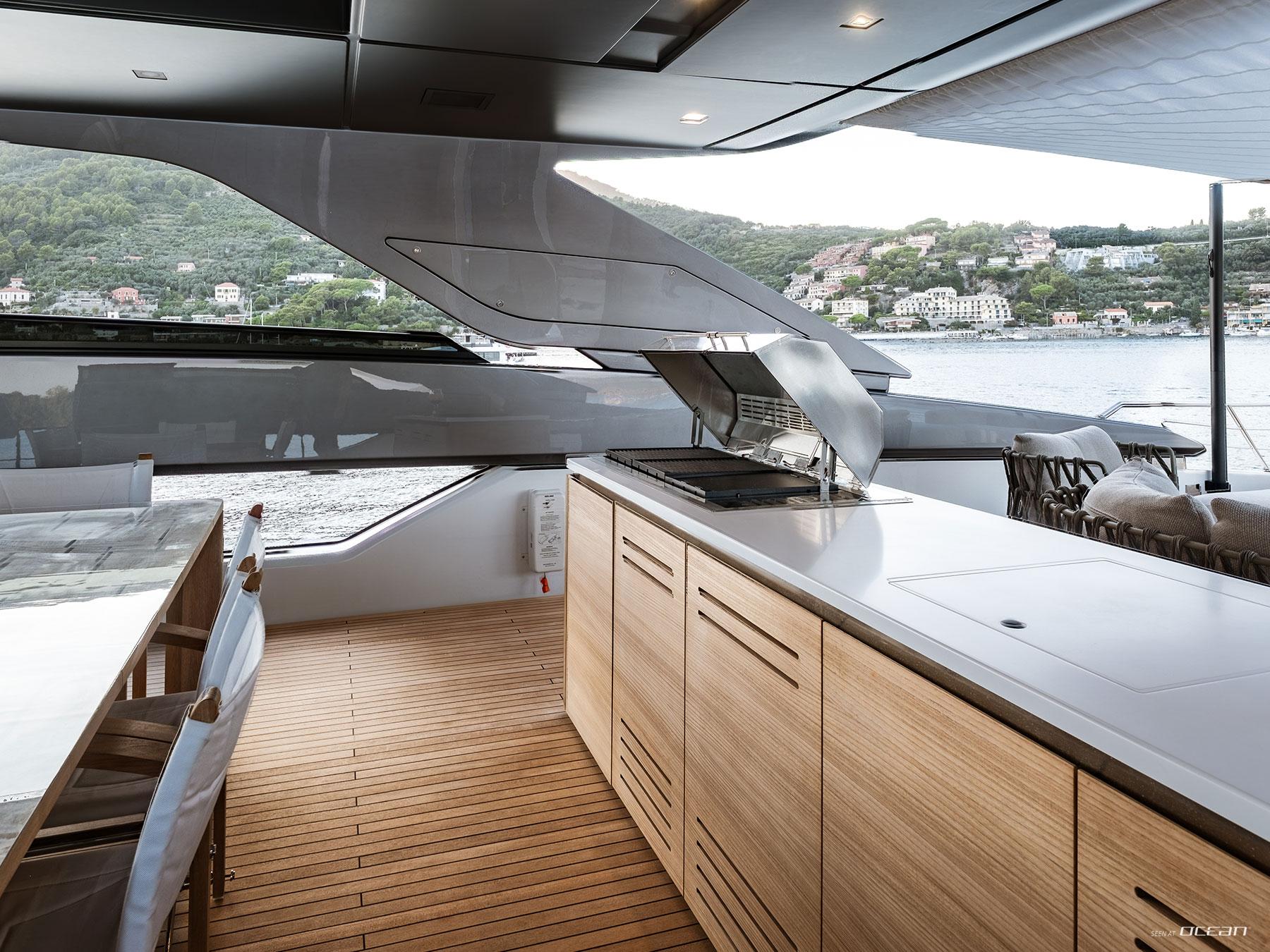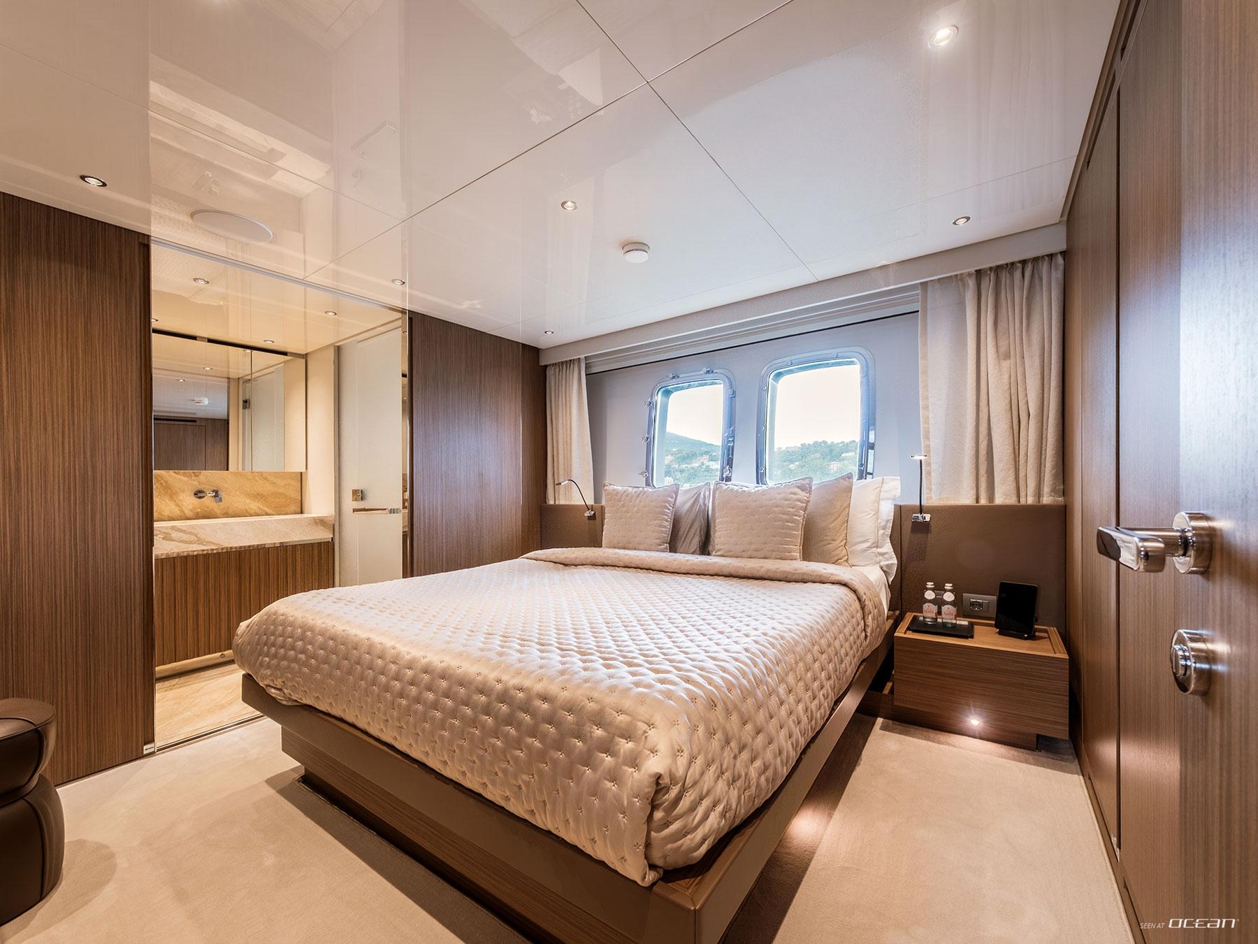 En-suite bathrooms in all cabins, air condition throughout, 2 generators, stabilizers at anchor and underway, TV in salon and all cabins, outdoor cinema and Bluetooth sound system throughout the yacht, Starlink Wi-Fi internet, large beach area with fold-down transom transforming into a sea terrace, and a variety of water toys