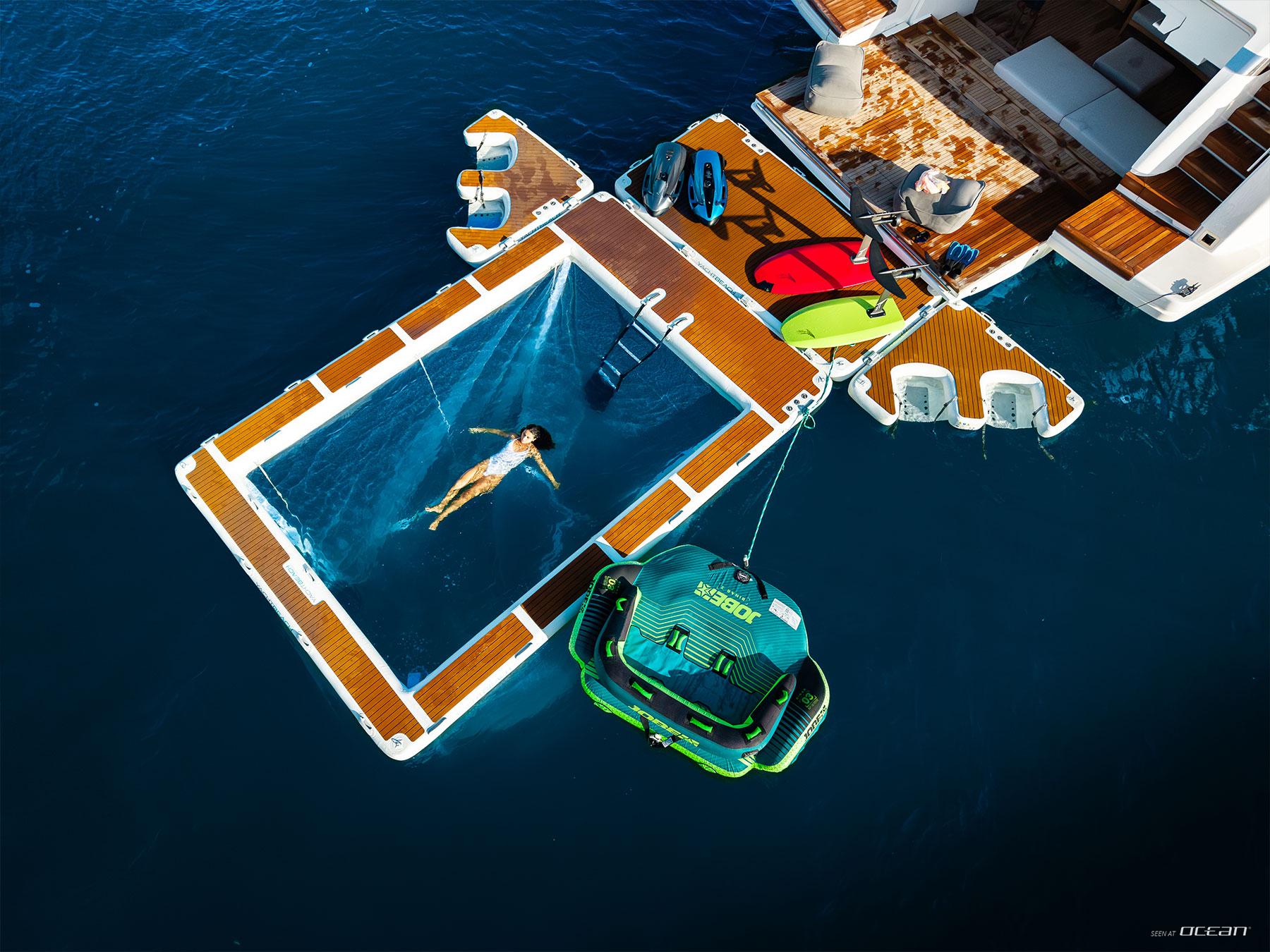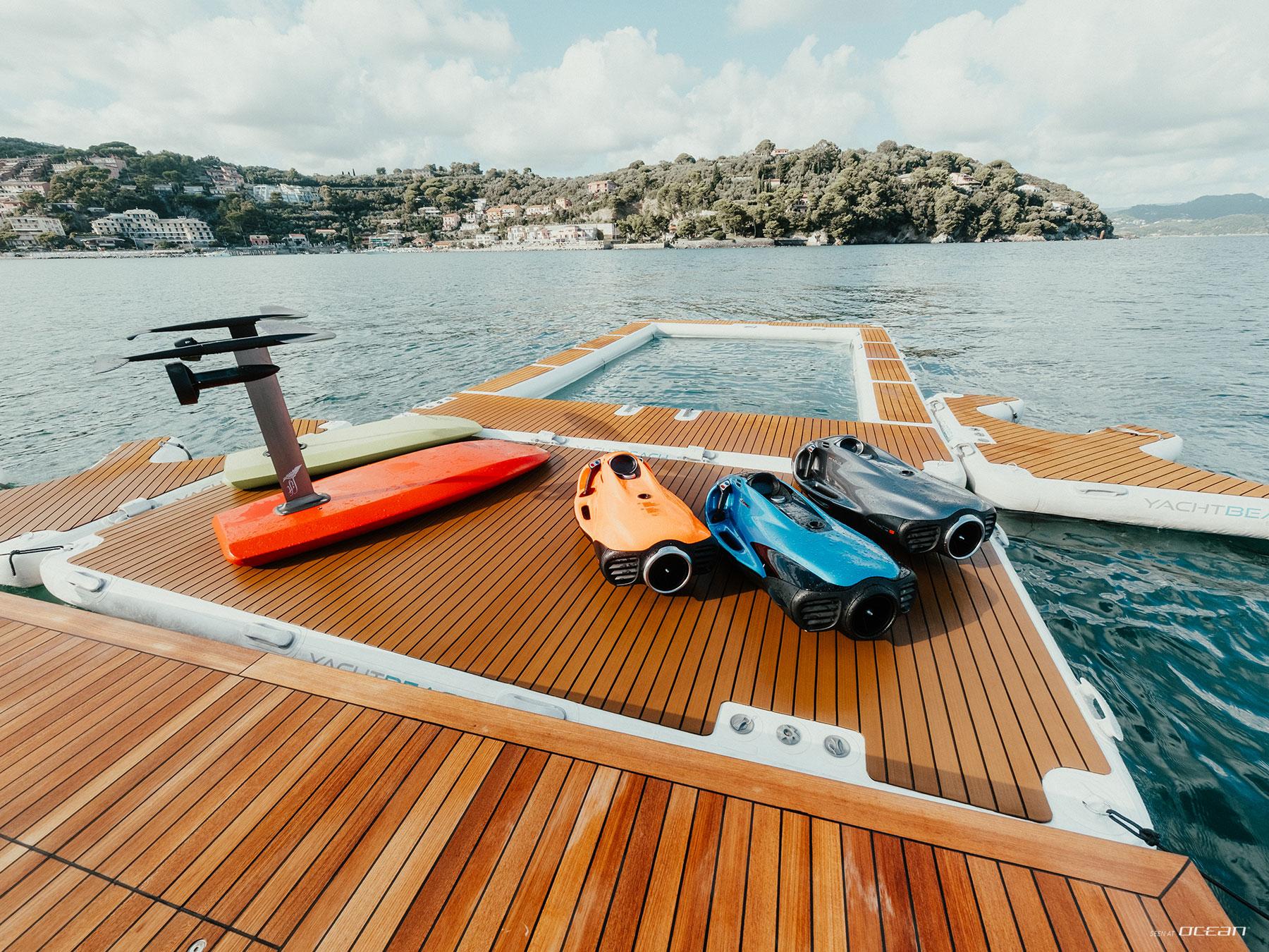 Axopar 37 chase boat, 3 SeaBobs F5S, 2 lift foils, Jobe ringo, electric scooter, yachtbeach swimming pool, and snorkeling gear