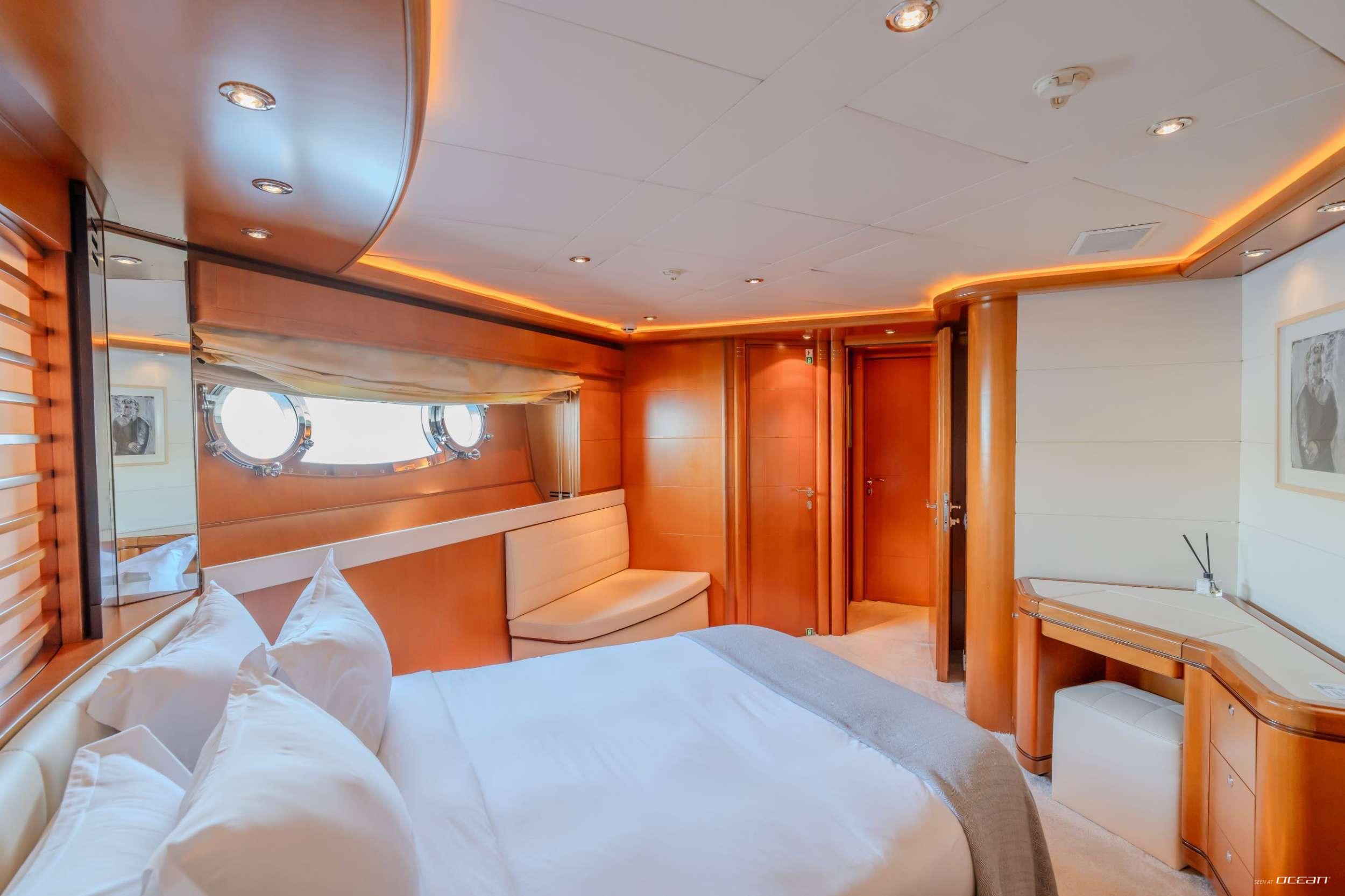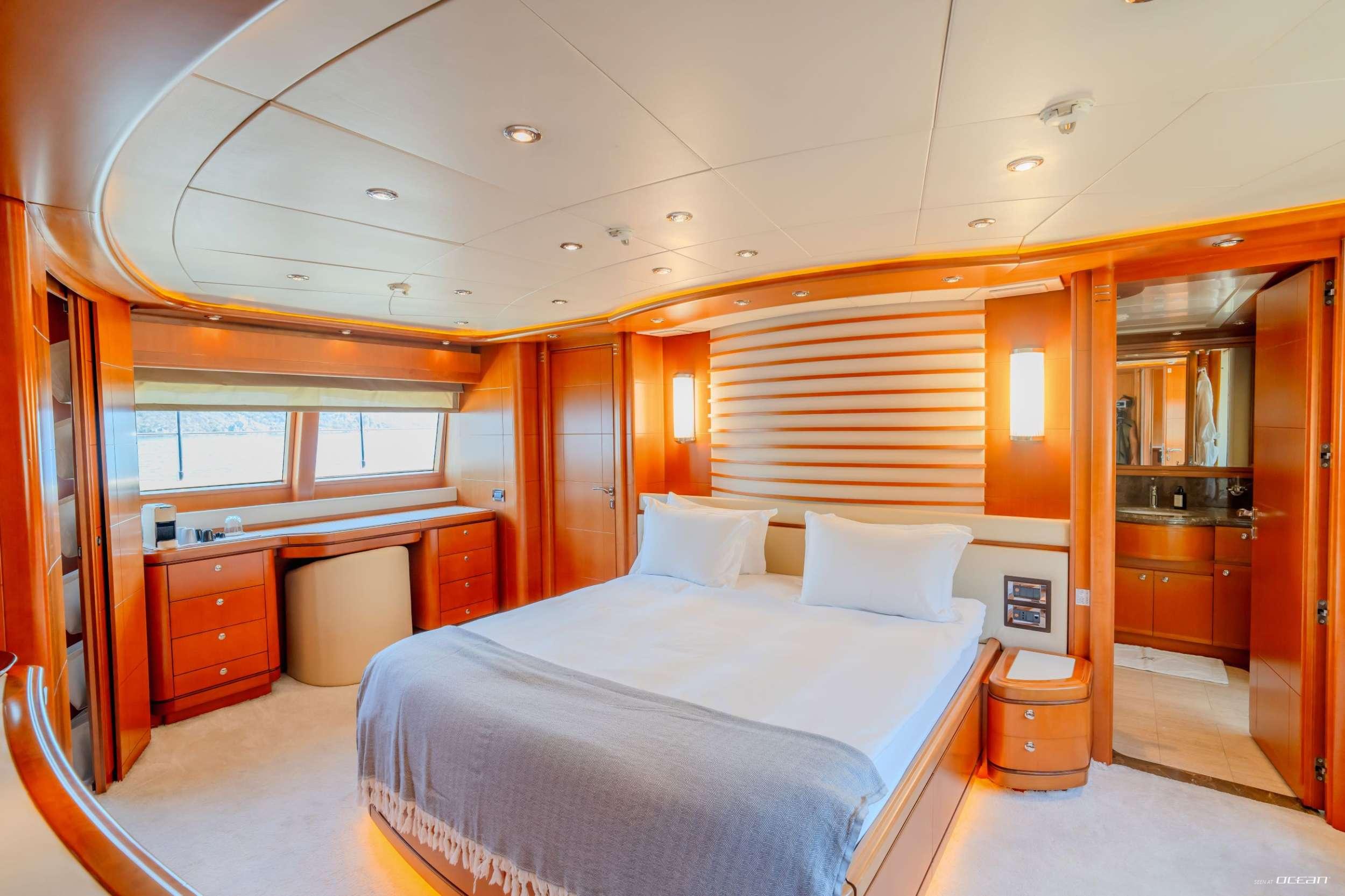 All cabins with en-suite bathrooms, air condition throughout, 2 generators, stabilizers underway, sundeck jacuzzi, LED-TVs and DVDs, Satelite TV, Hi-Fi sound system throughout, Wi-Fi internet, iPad/iPod/mobile docking stations, garage with aft, port and starboard hydraulic opening, swimming platform, stern/cockpit shower, and a variety of water toys