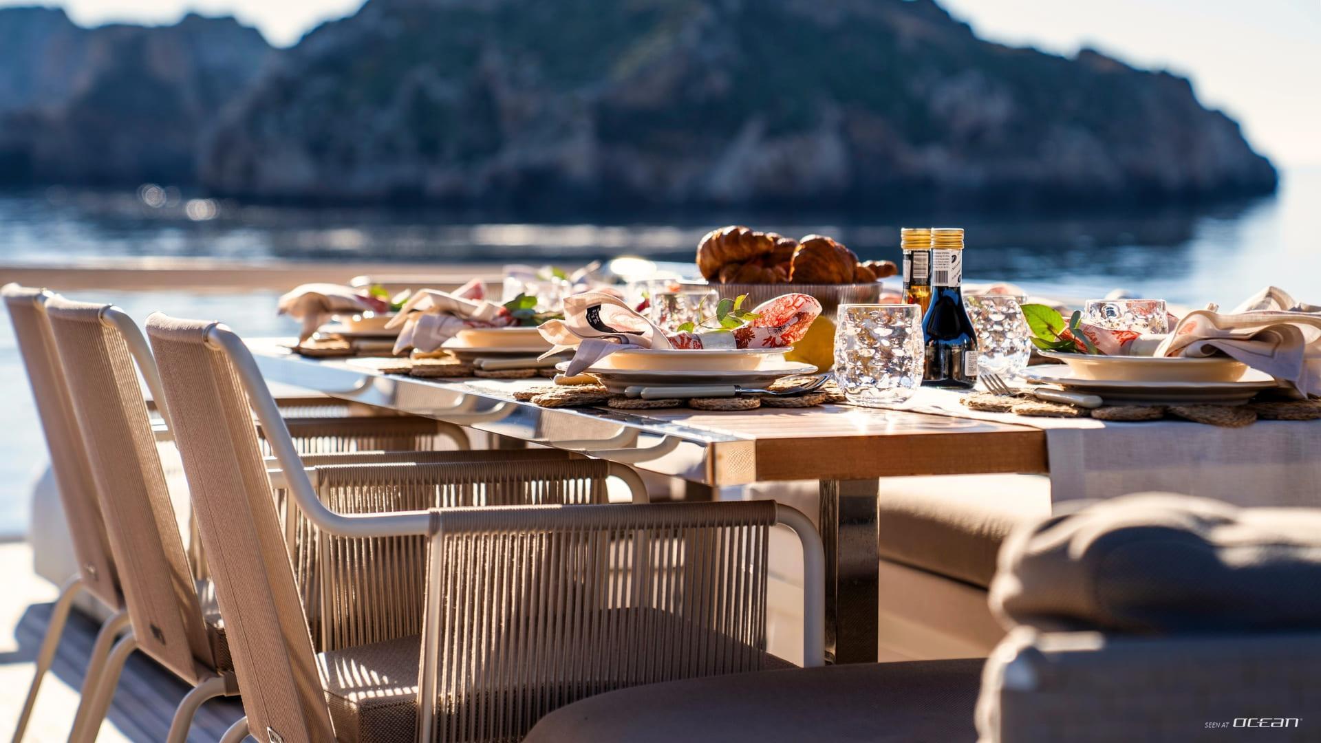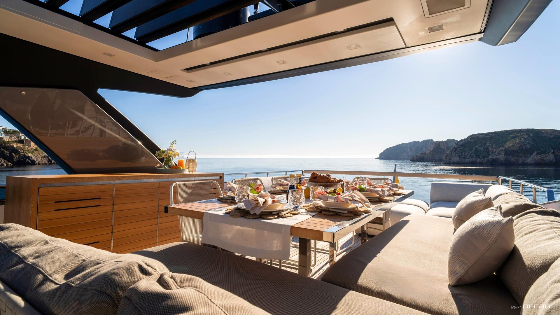 On board, Charter yacht AURA I presents a layout designed for relaxed days under the sun. The flybridge features a generous dining area beneath a sleek hardtop, complemented by comfortable lounge seating and a bar. The foredeck offers an additional space for sunbathing and unwinding, while the aft cockpit provides a cozy setting close to the water, ideal for casual meals or evening drinks.
