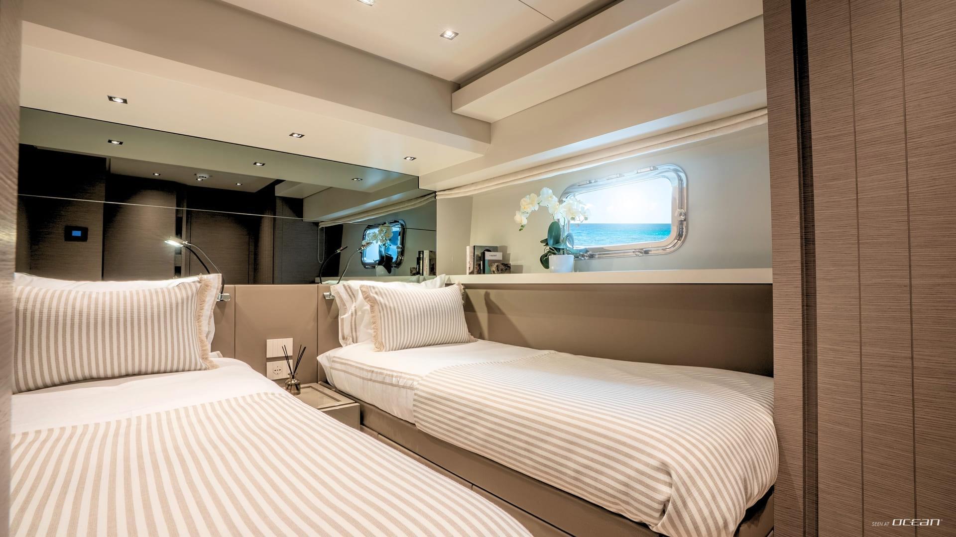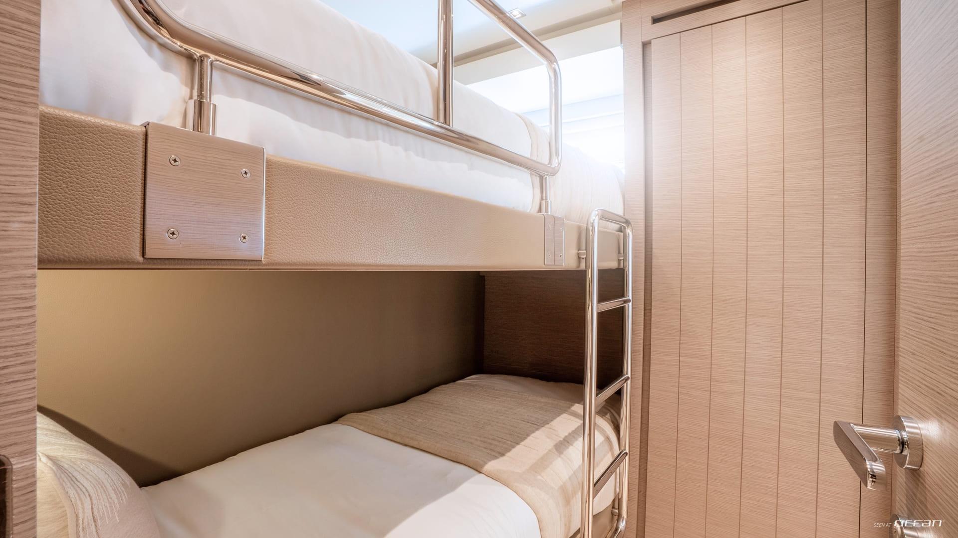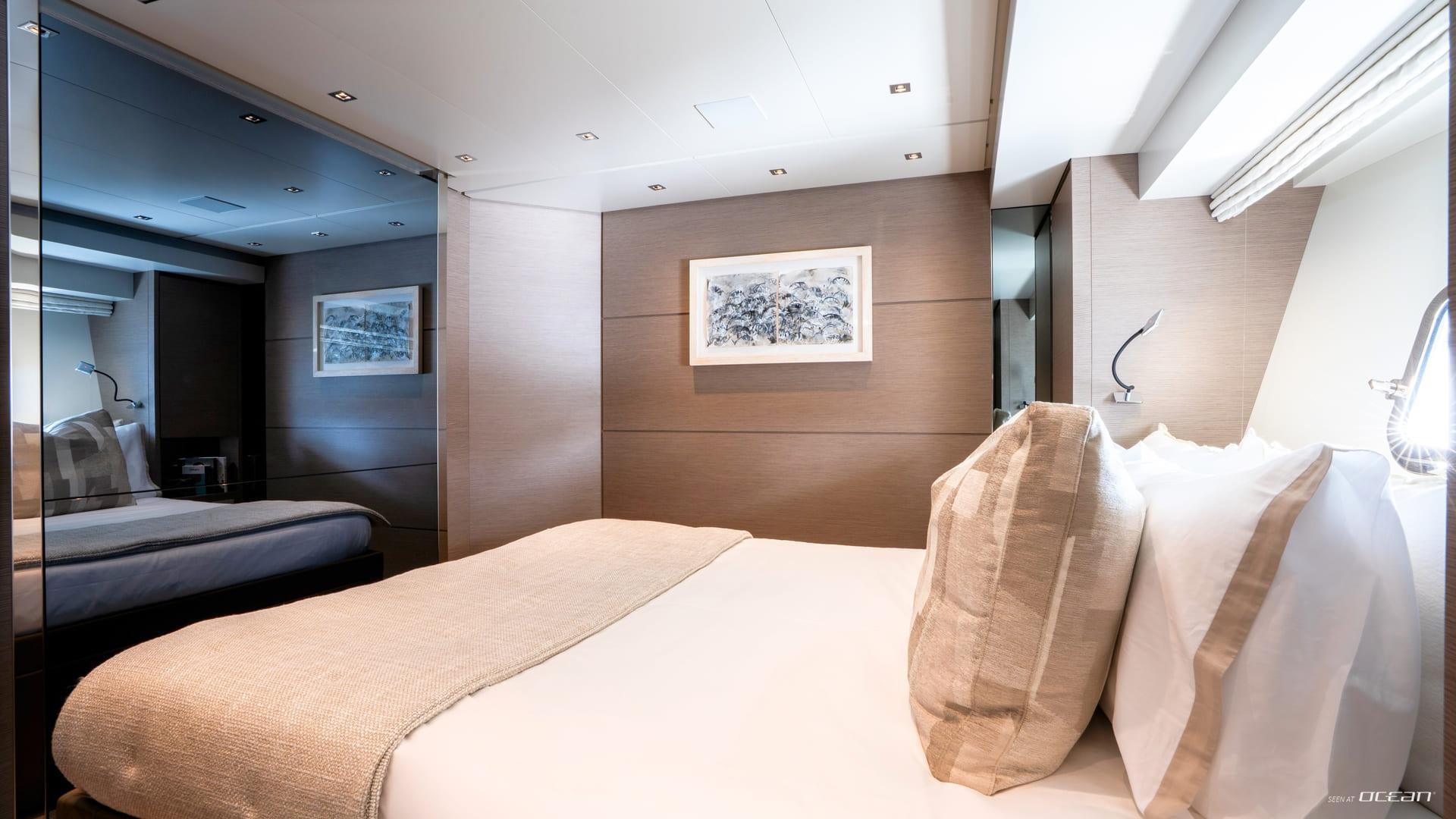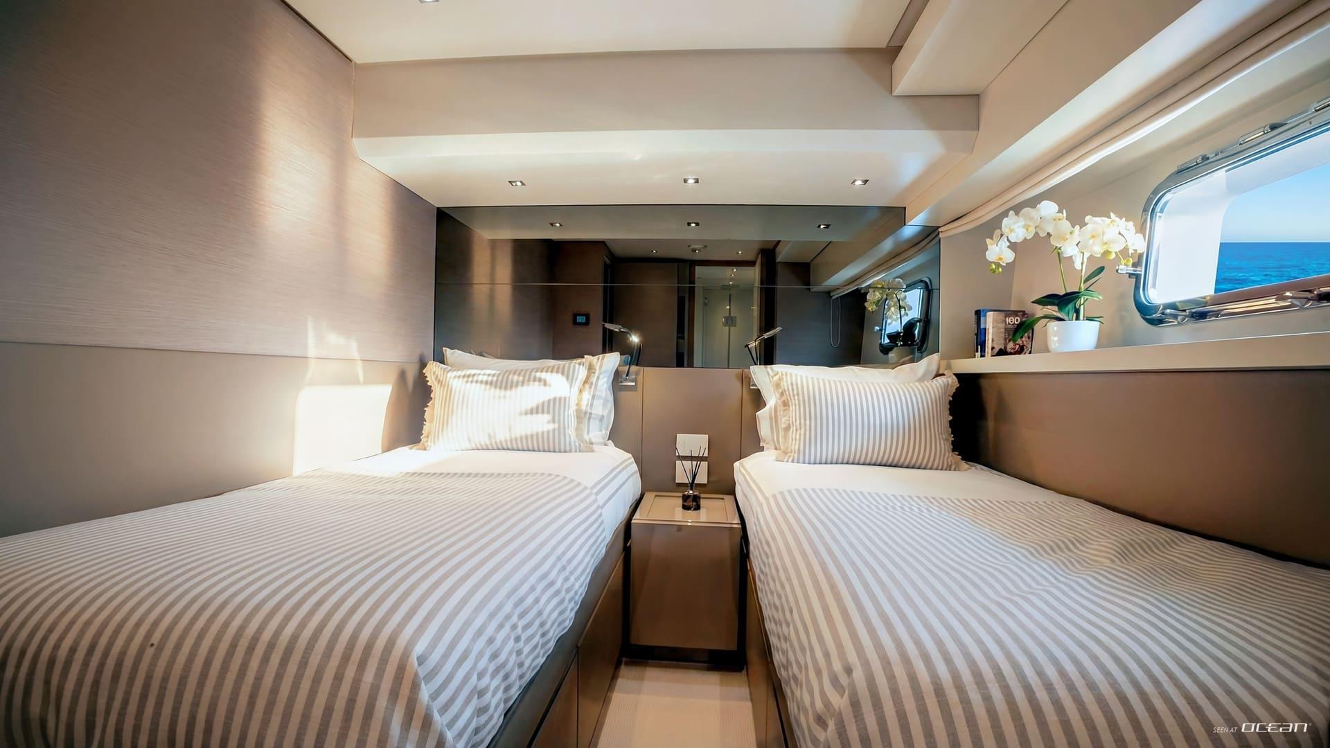 Inside, M/Y AURA for charter welcomes up to 8 guests across 4 well-designed cabins, each with ensuite facilities. The configuration includes a spacious full-beam master cabin, a VIP cabin, a twin cabin, and a bunk cabin, making AURA particularly suitable for families or groups of friends. The interior features soft tones and warm finishes, creating a calm and contemporary onboard atmosphere.
