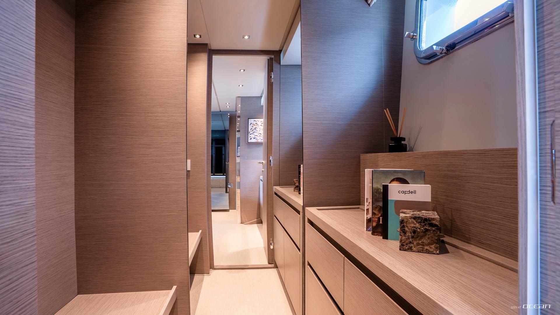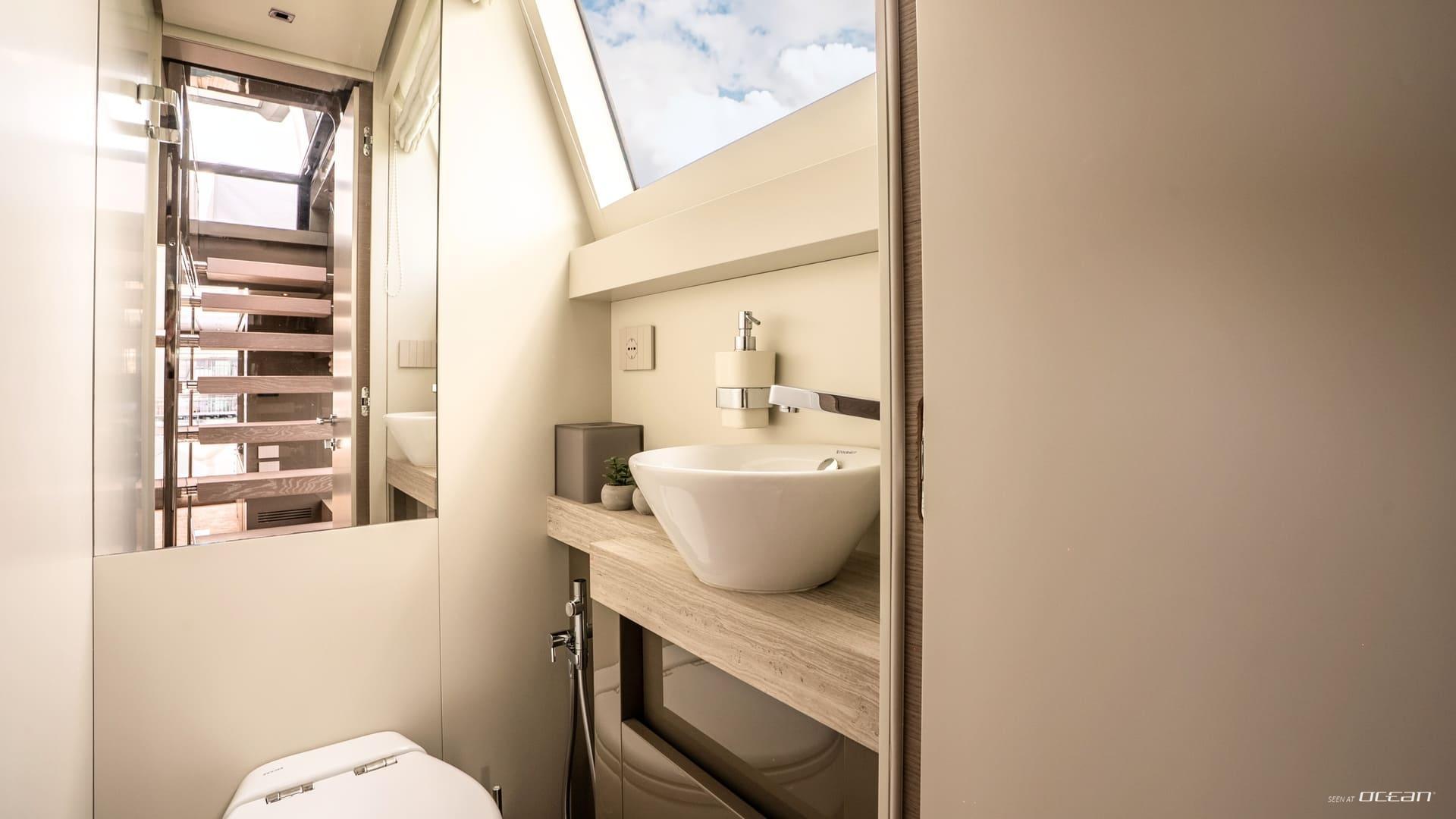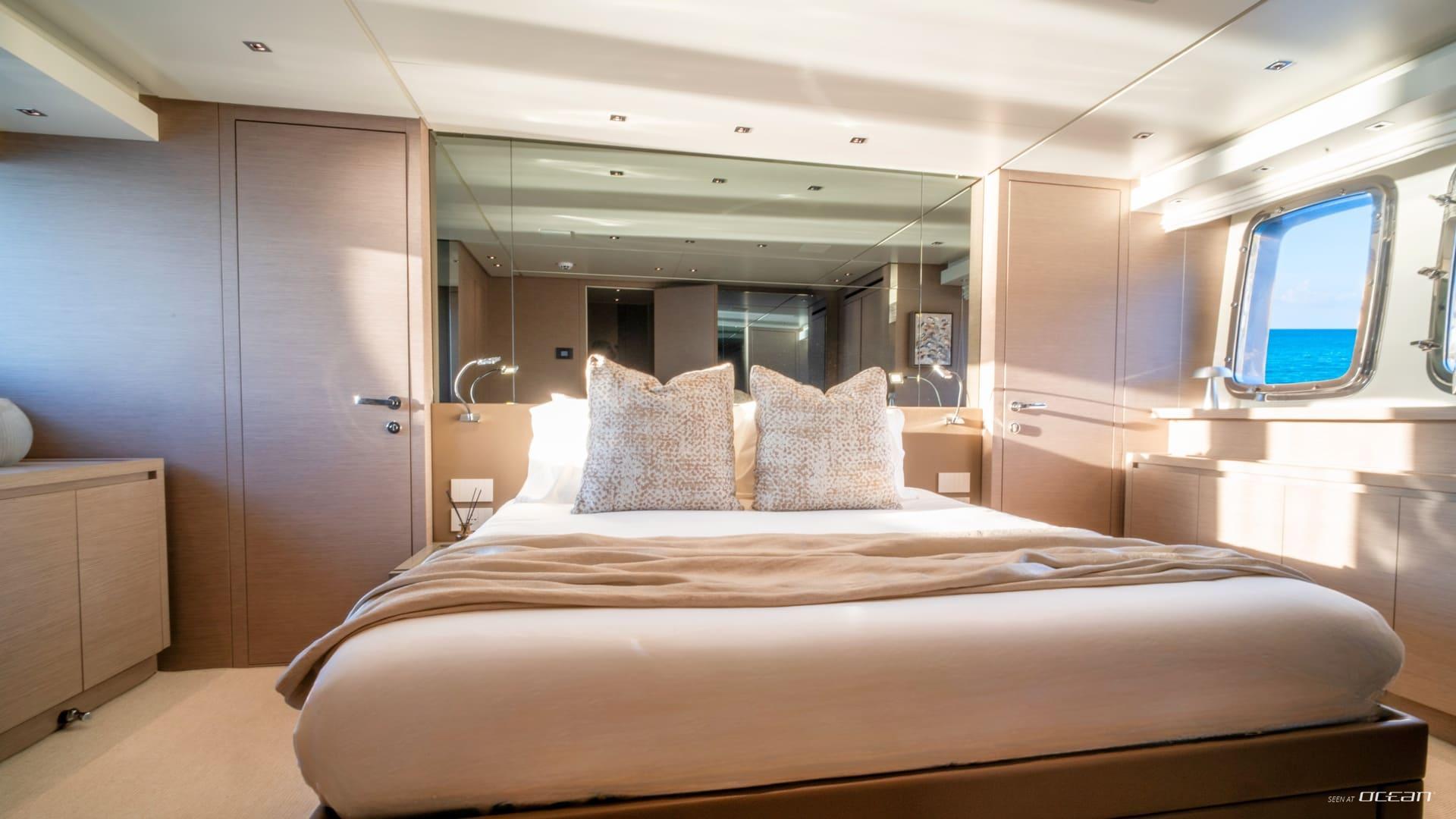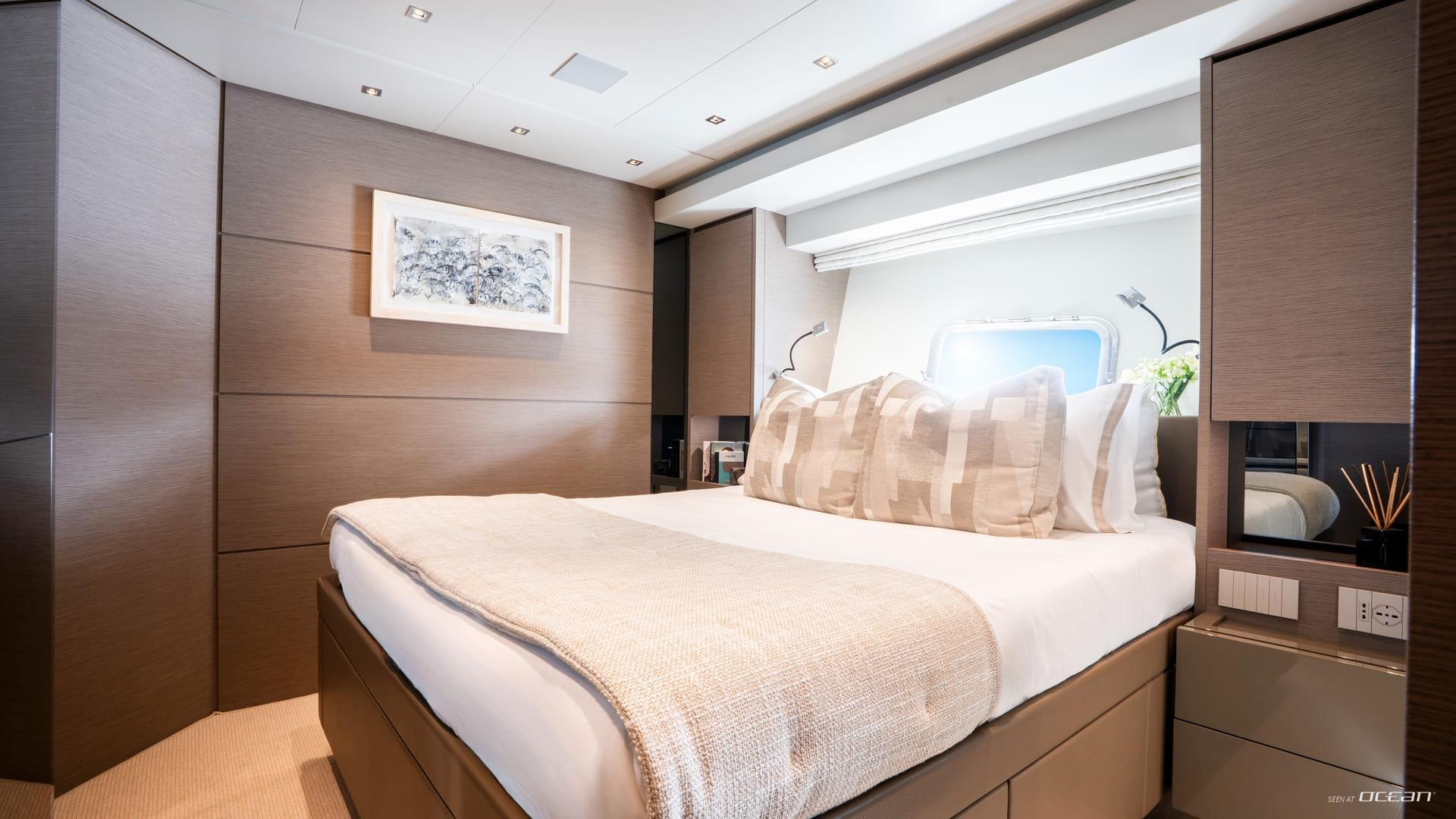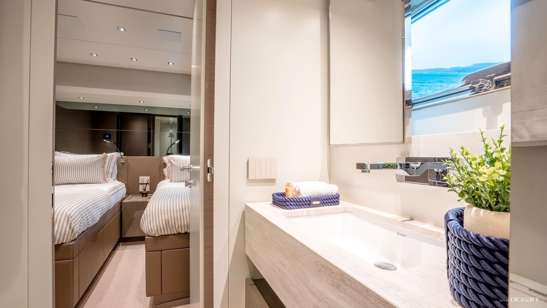 Inside, M/Y AURA for charter welcomes up to 8 guests across 4 well-designed cabins, each with ensuite facilities. The configuration includes a spacious full-beam master cabin, a VIP cabin, a twin cabin, and a bunk cabin, making AURA particularly suitable for families or groups of friends. The interior features soft tones and warm finishes, creating a calm and contemporary onboard atmosphere.