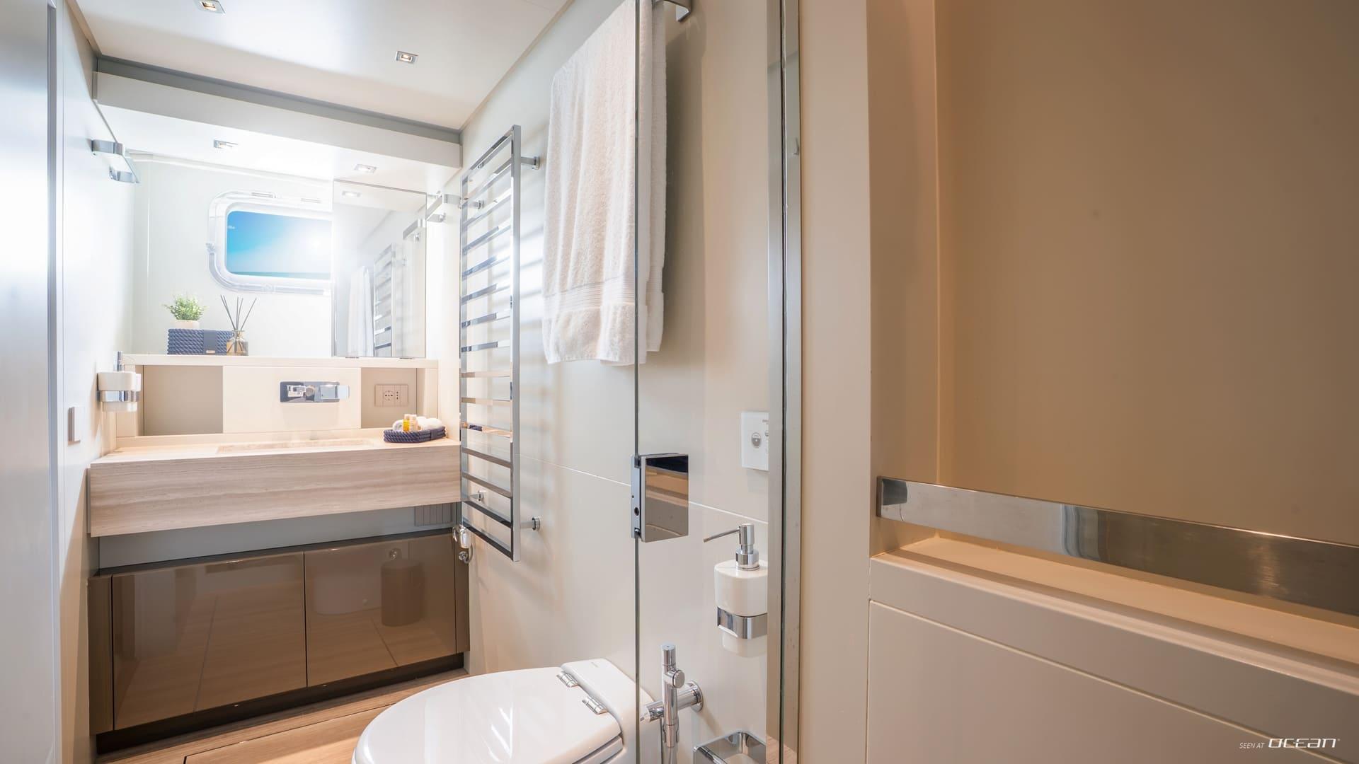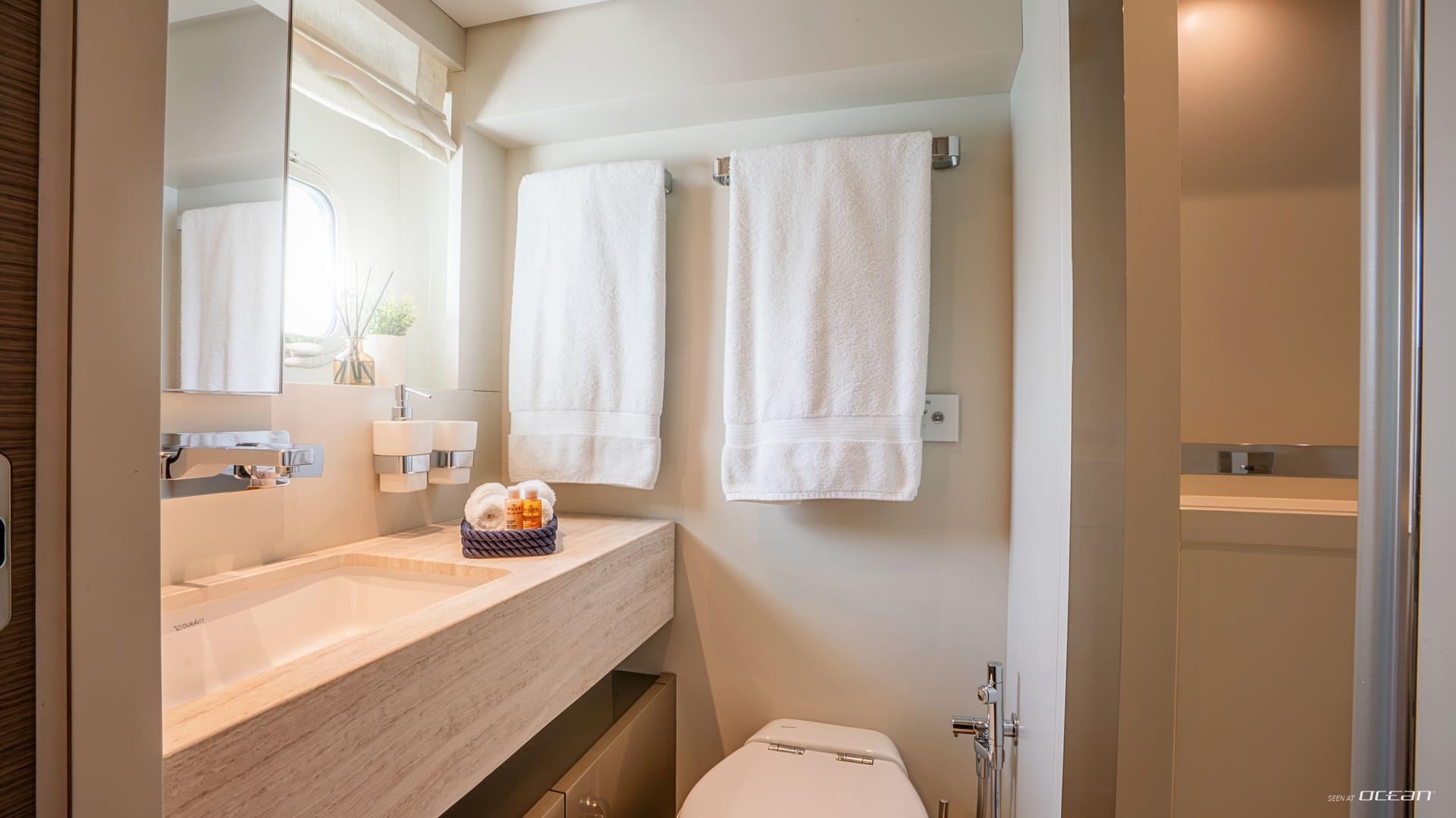 All cabins with en-suite bathrooms, air condition throughout, generators, stabilizers at anchor, stabilizers underway, hydraulic swimming platform, and water toys.