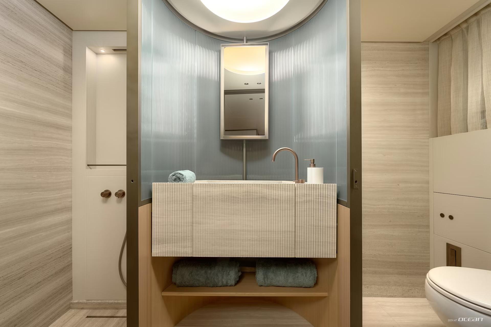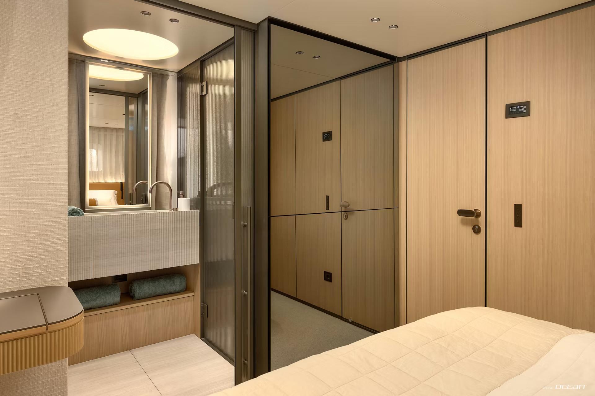 M/Y AZZURRI accommodates up to 9 guests in 4 ensuite cabins, including a main deck master suite and 3 doubles, one featuring a Pullman berth for added flexibility. Each cabin reflects the same soft, contemporary design language, combining comfort with practical elegance. Outdoor living is equally well considered, with generous sunbathing areas forward and aft, a spacious swim platform, and a selection of water toys including paddleboards, kayak, towables, and a Williams jet tender.