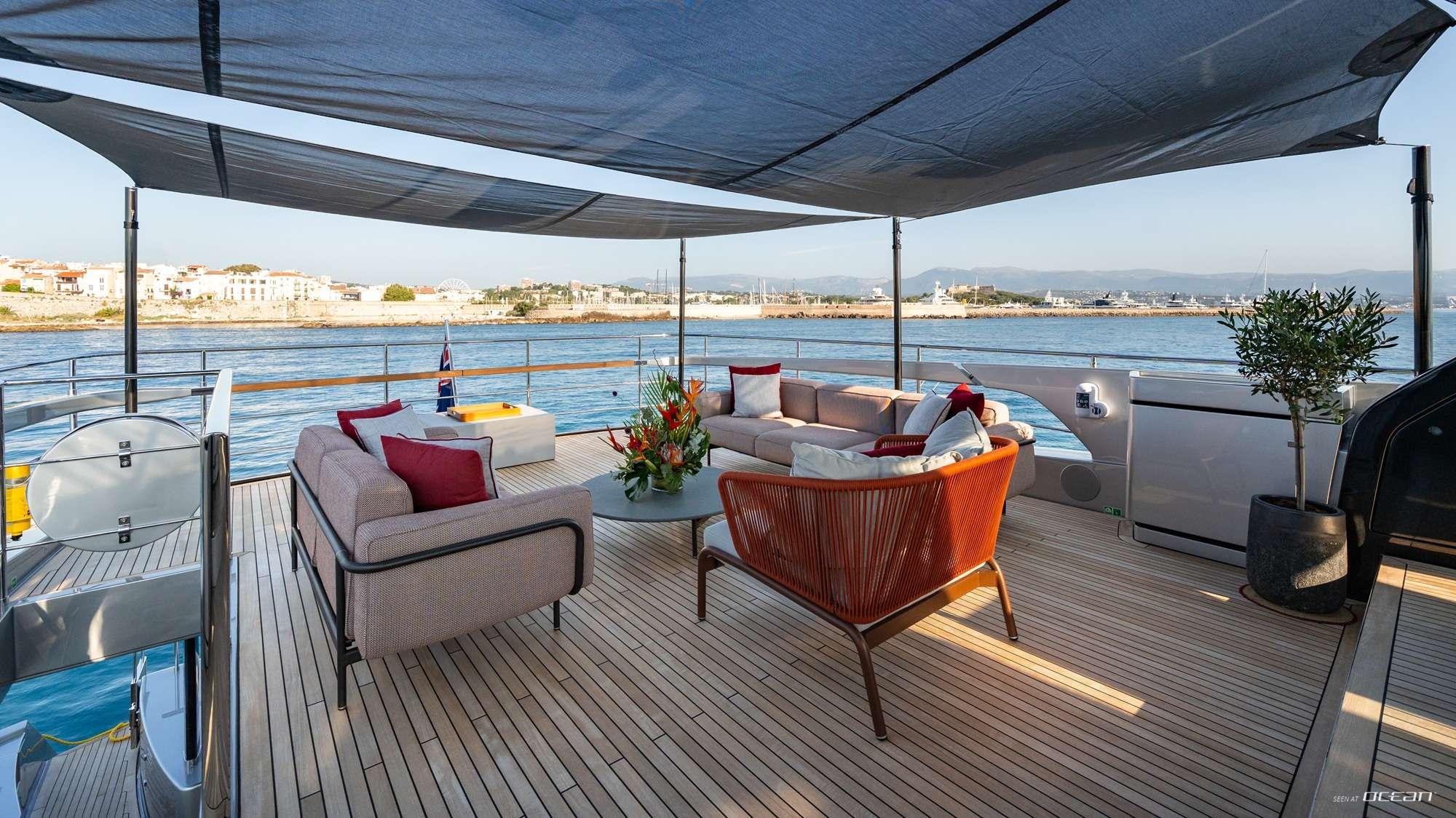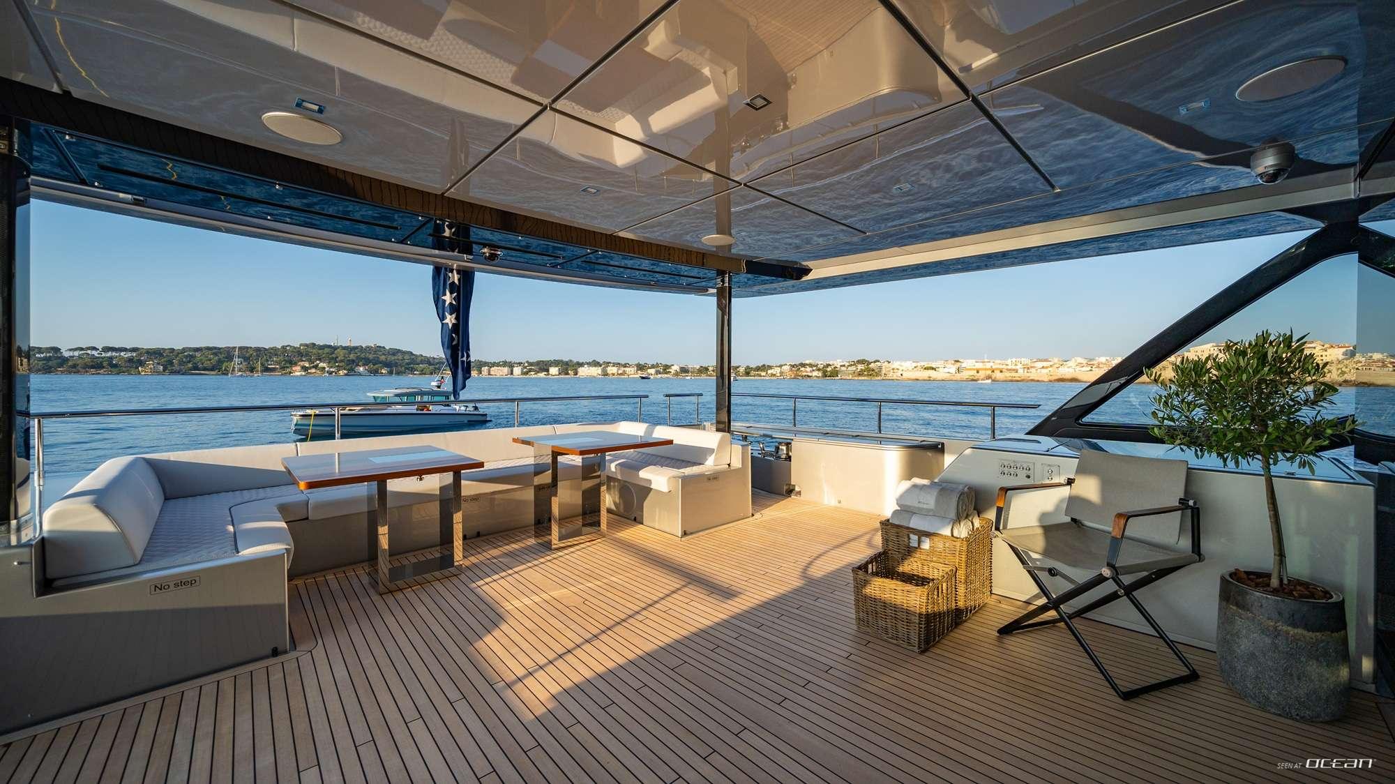 Charter Yacht BELLA DONNA offers expansive exterior areas across all decks, crafted for elegant outdoor living. The flybridge is equipped with a stylish glass-panel hardtop, a cocktail bar, a spacious dining table, and cozy loungers - perfect for entertaining or simply unwinding. At the bow, a plush C-shaped sofa and oversized sunpads invite guests to relax with panoramic views. The aft deck provides a beautiful setting for alfresco dining, seamlessly blending style and comfort with the sea always in sight.