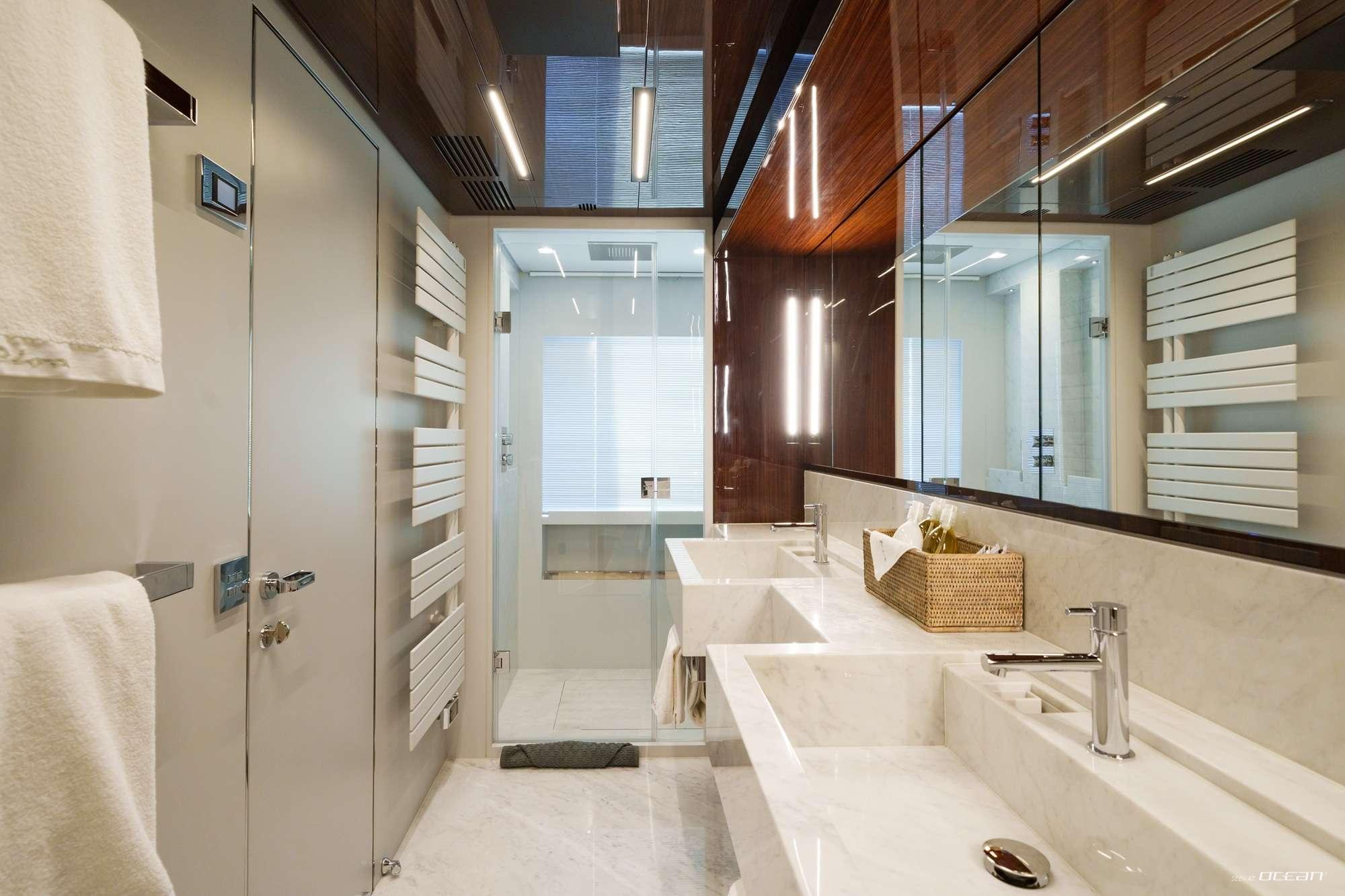 All cabins with en-suite bathrooms, air condition throughout, generators, stabilizers at anchor, stabilizers underway, watermaker, premium AV system controlled by iPads, TVs, Wi-Fi internet, gym equipment, swimming platform, and a variety of water toys.