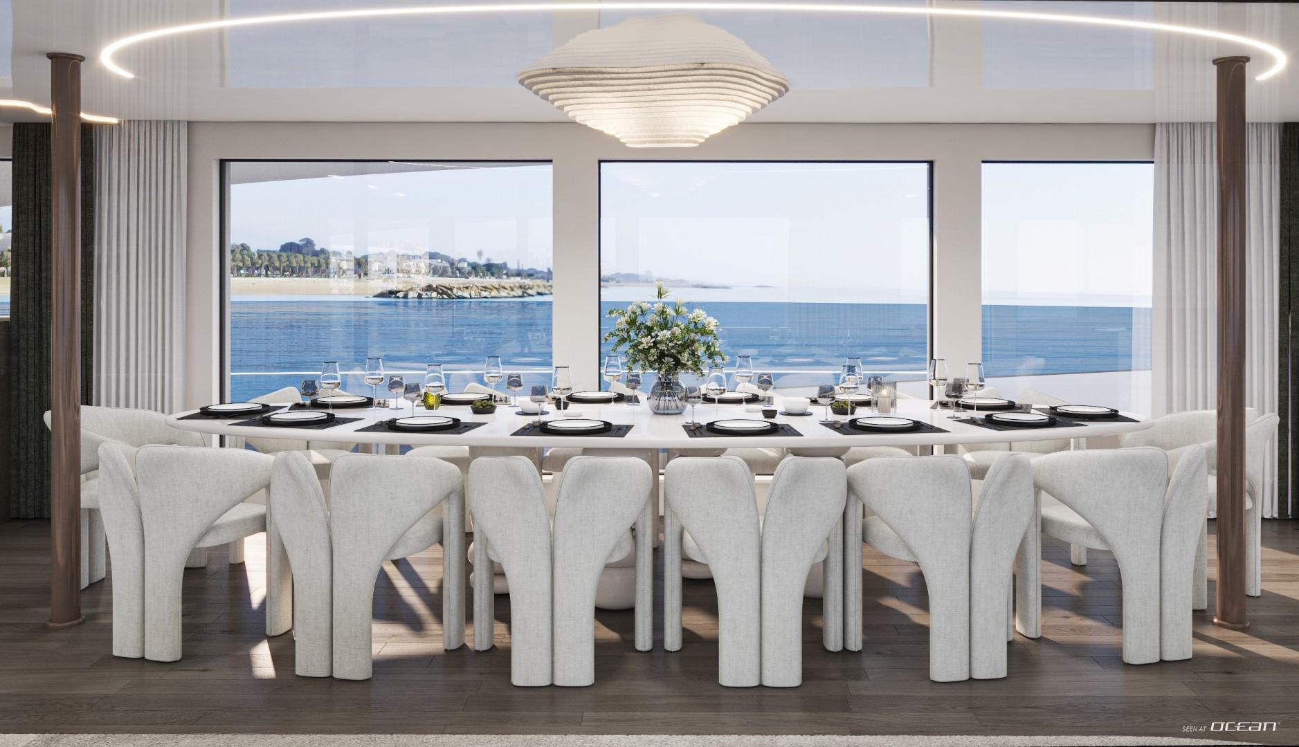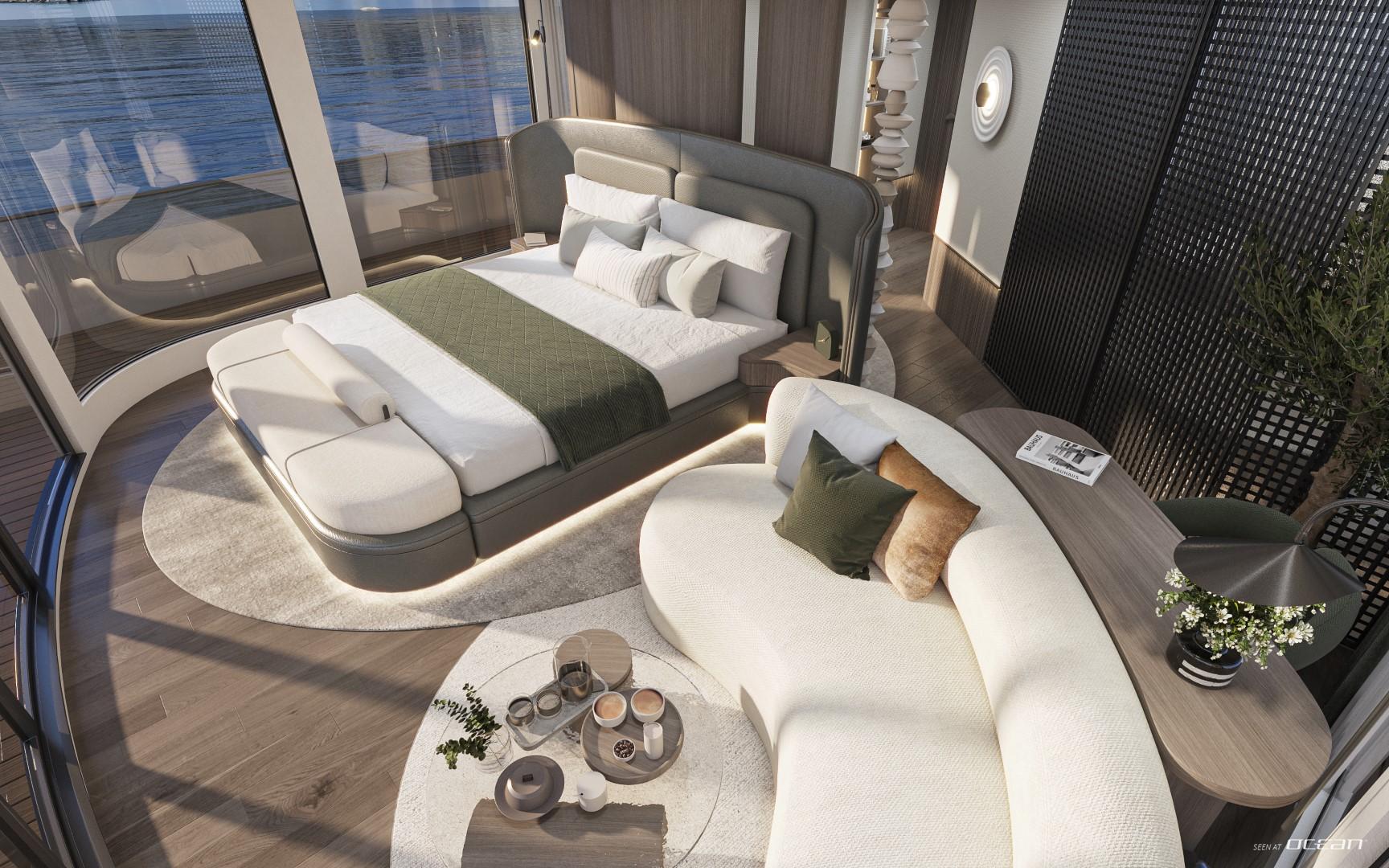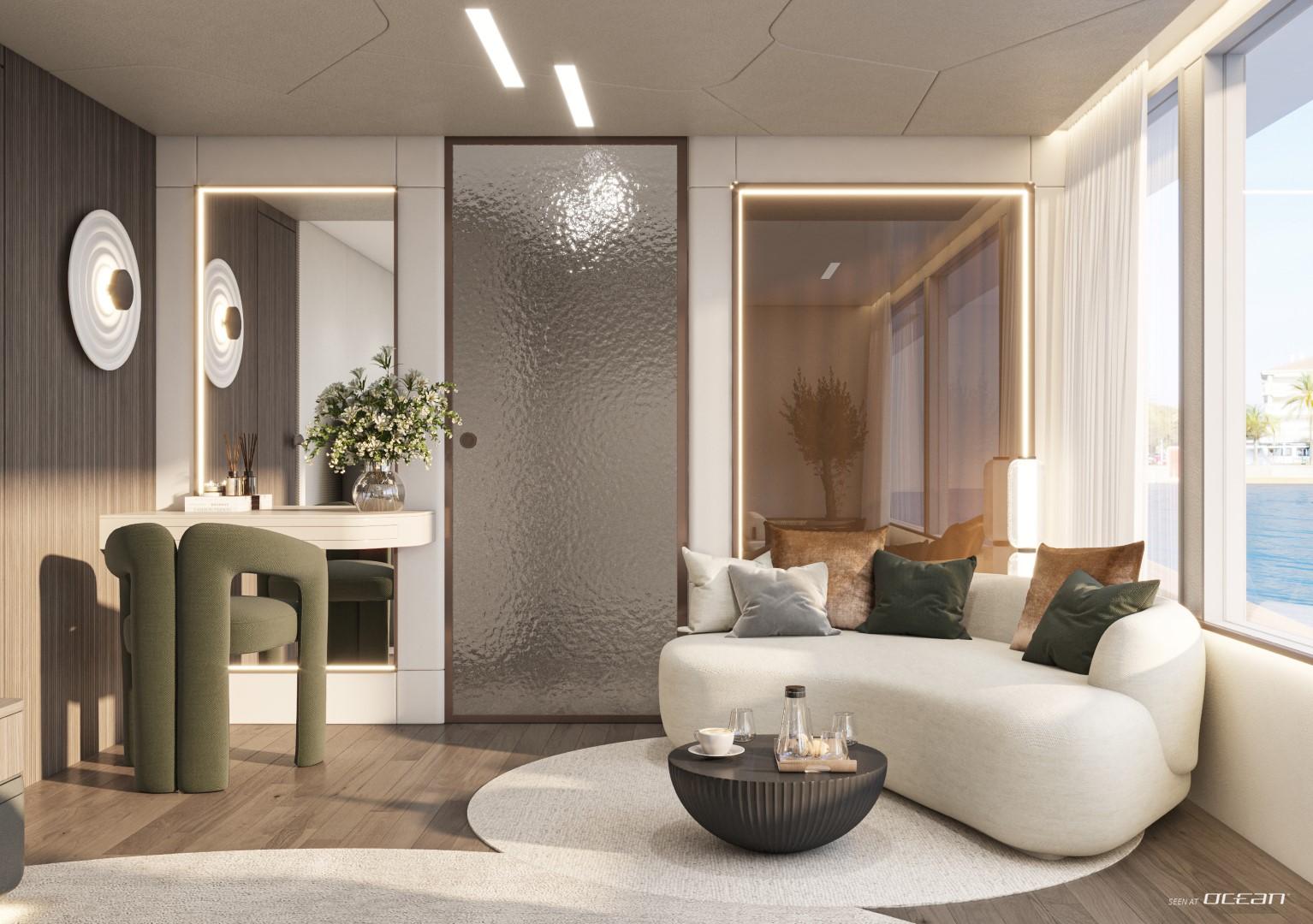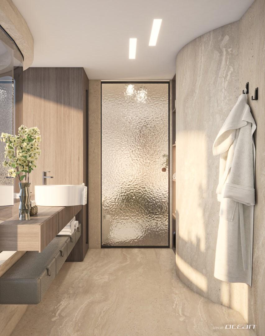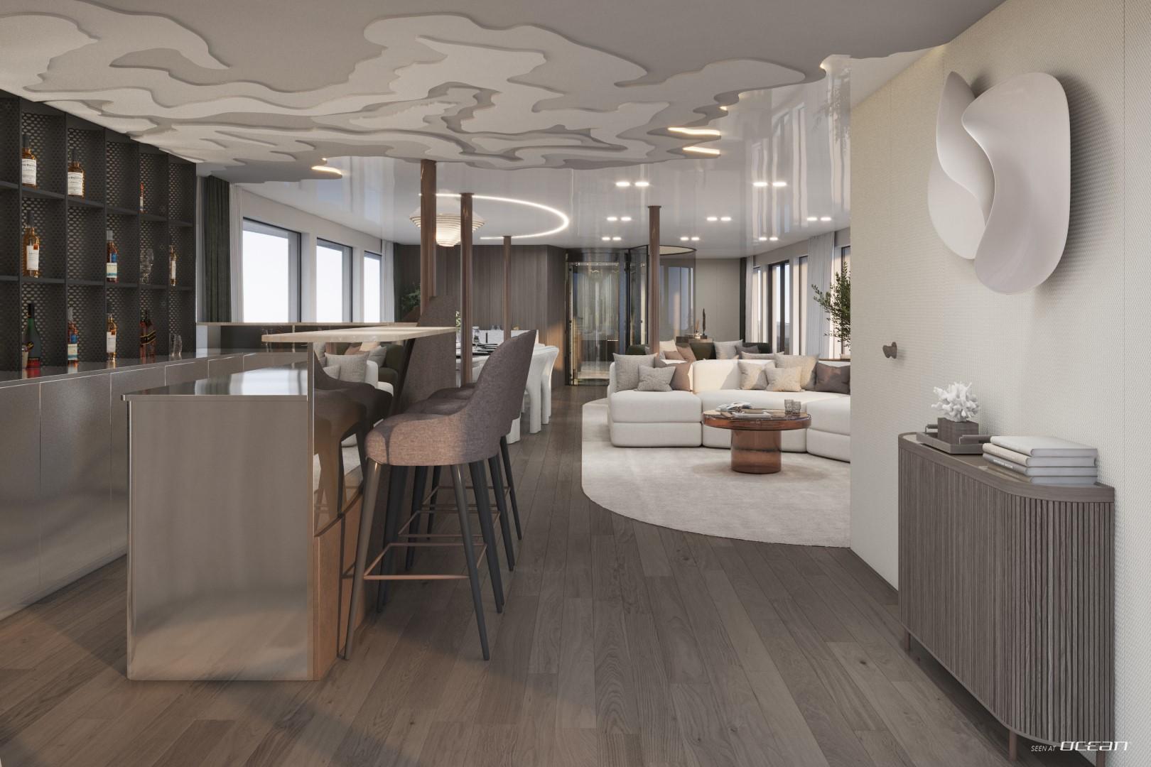 A glass elevator surrounded by a graceful spiral staircase connects every level, ensuring effortless access from the beach club to the sky deck. The spacious main saloon features a fold-out balcony and an open-plan dining area with panoramic views, creating a fluid connection between indoor and outdoor living. Wellness seekers will find complete indulgence on board - a dedicated spa with sauna, massage room, and beauty facilities complements an expansive whirlpool with waterfall and a fully equipped gym.