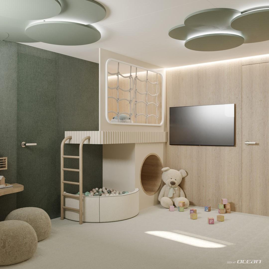All cabins with en-suite bathrooms, 1 master with a private jacuzzi, air condition throughout, generator, glass elevator, fold-out balcony in salon, children’s playroom with Pullman beds, sauna, massage room, beauty facilities, expansive whirlpool with a soothing waterfall, fully equipped gym, integrated pool at the beach club, jacuzzi, and water toys