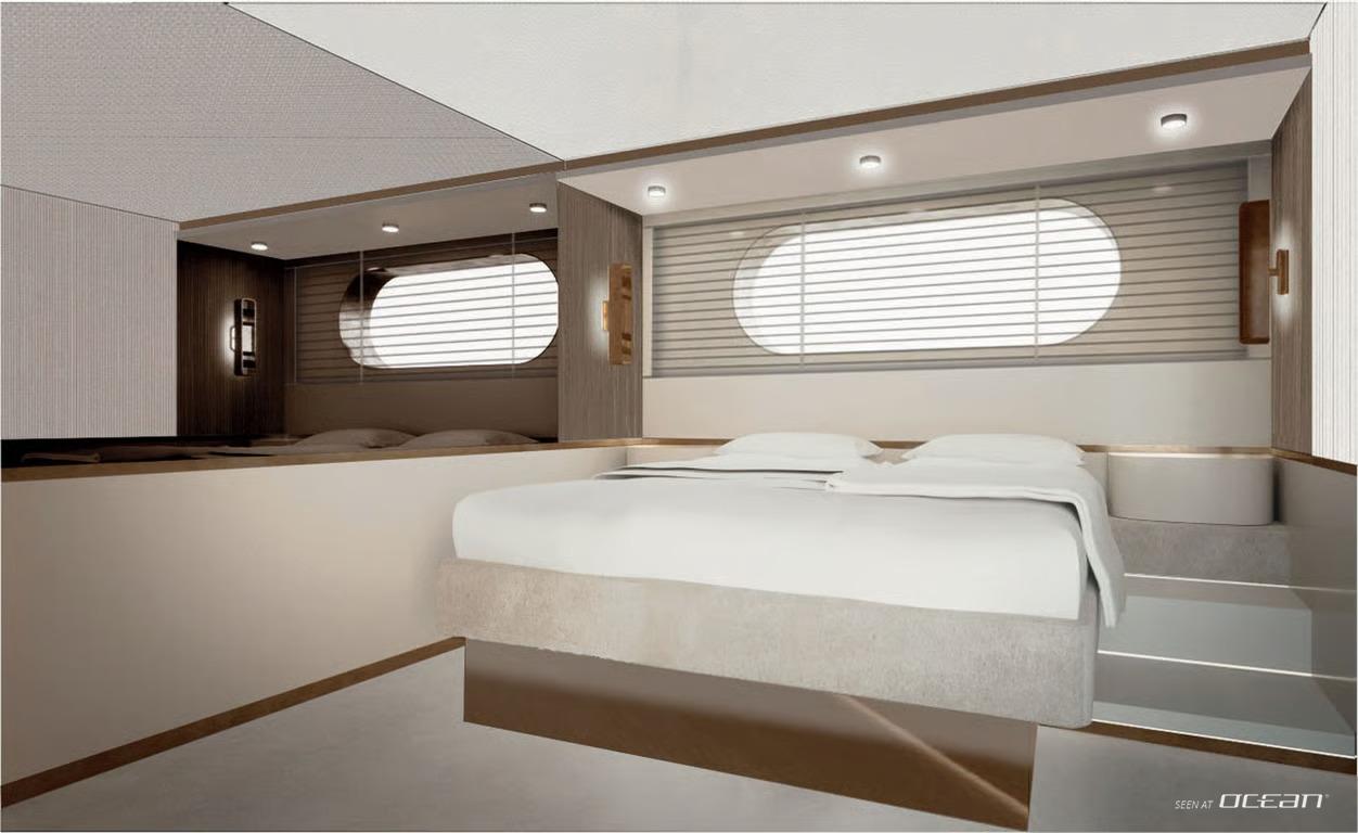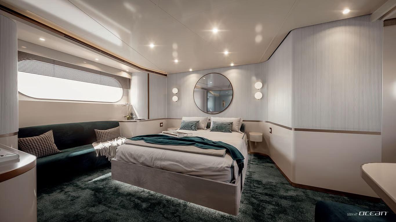 M/Y BLUE EYES for charter accommodates up to 9 guests in a versatile 4-cabin layout, comprising a master cabin, a VIP cabin, and 2 twin cabins convertible into doubles with an optional pullman. Each cabin is equipped with smart TVs, audio-visual entertainment systems, Bluetooth sound, Starlink internet, and access to a curated media library, ensuring seamless comfort and connectivity throughout the yacht charter.