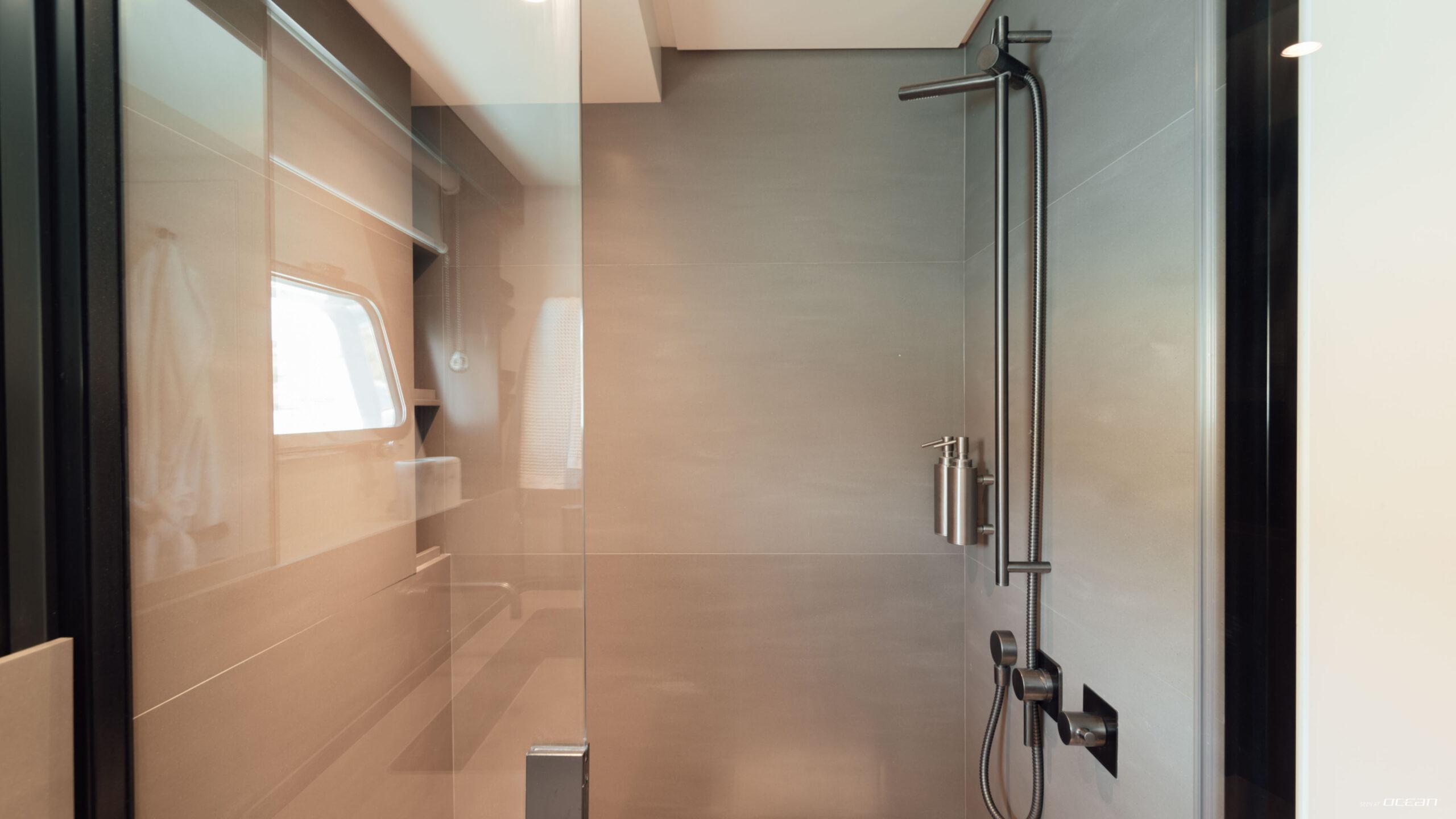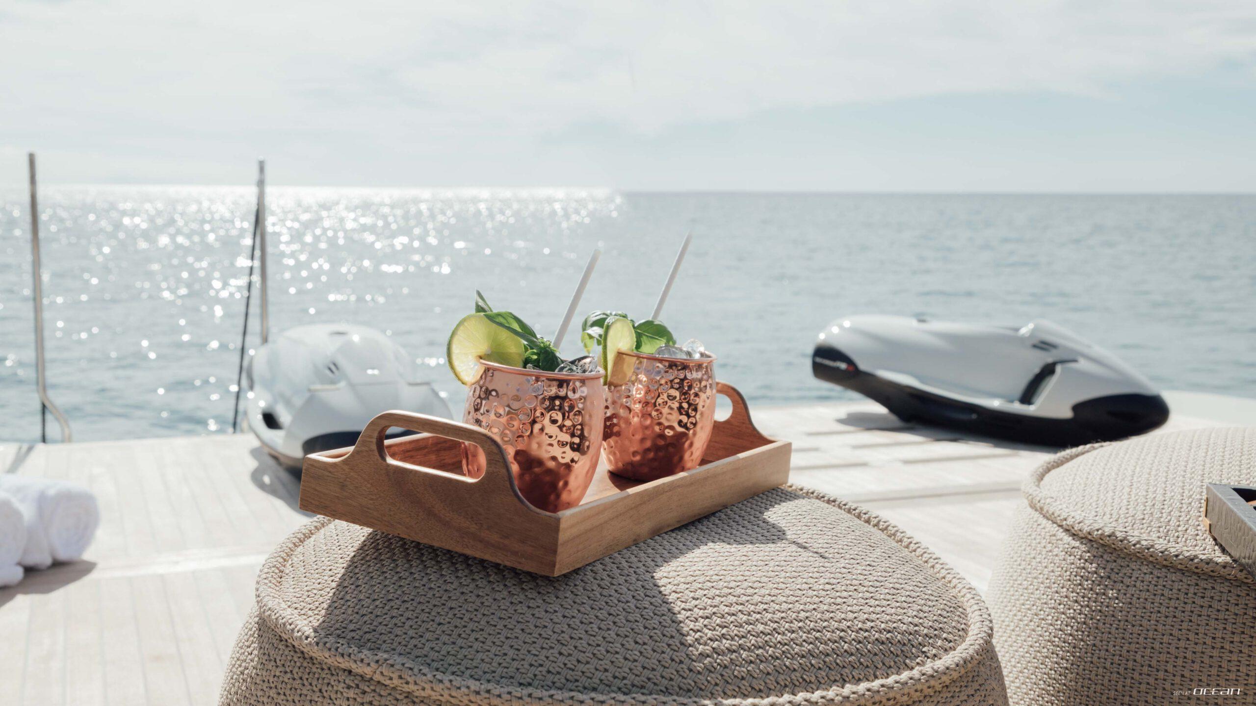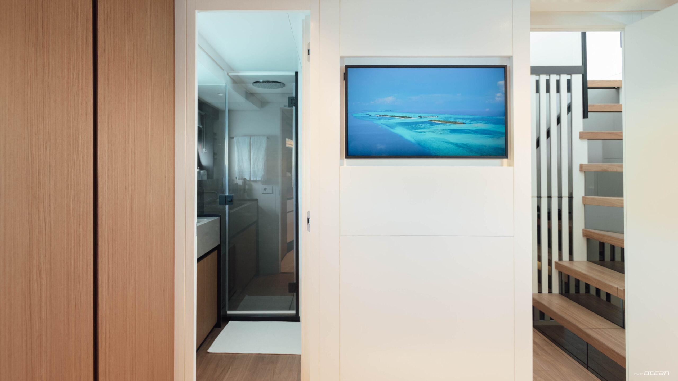 En-suite bathrooms in all cabins, air condition throughout, generator, watermaker, stabilizers at anchor, stabilizers underway, smart TV in salon and all cabins, Fusion Bluetooth music player, Netflix, Starlink Wi-Fi internet, gym gear, BBQ grill, huge beach club, and water toys.