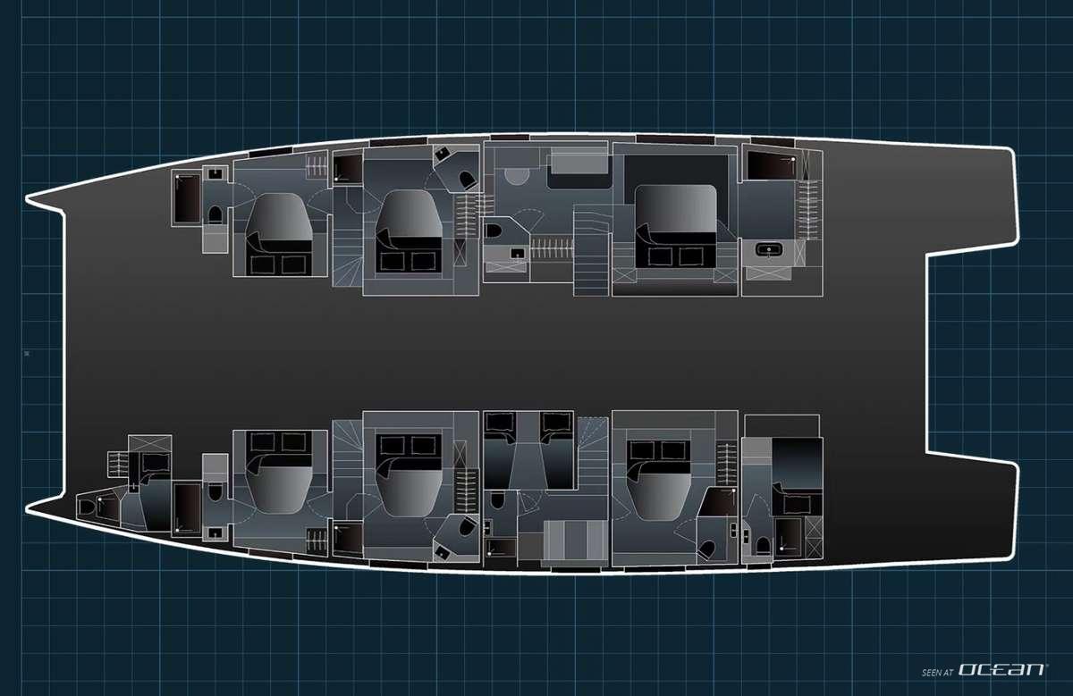 All cabins with en-suite bathrooms, air condition throughout, generator, watermaker, deck jacuzzi, TV, outdoor sound system, Wi-Fi internet, BBQ, gym gear, ice maker, hydraulic swimming platform and a variety of water toys.