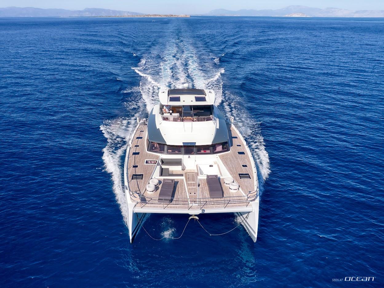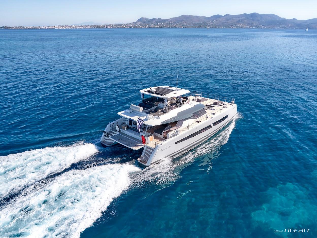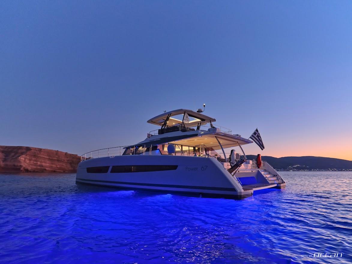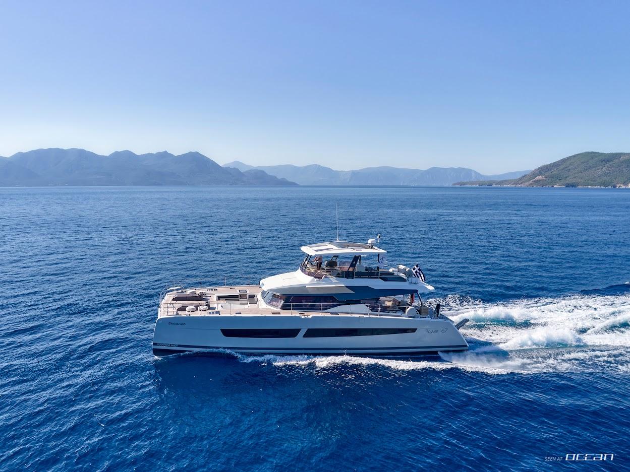 Step aboard 20m CHRISTAL MIO, a luxurious Fountaine Pajot Power 67 catamaran built in 2020, offering a unique blend of motor yacht speed and catamaran stability. With expansive interior and deck spaces, she delivers comfort, freedom, and style for an unforgettable Greece luxury power catamaran charter. Featuring a 36m² cockpit and 32m² flybridge with Jacuzzi, guests enjoy sunbathing, socializing, and panoramic views across the Greek islands.