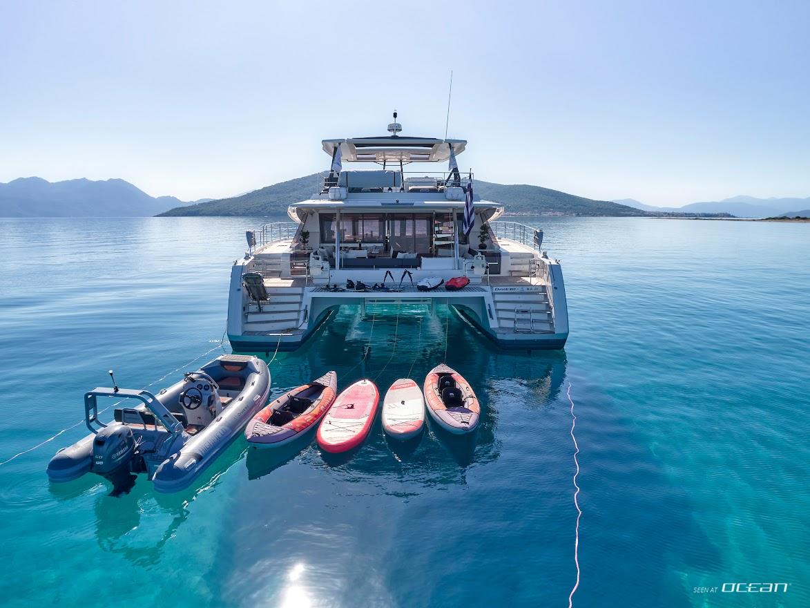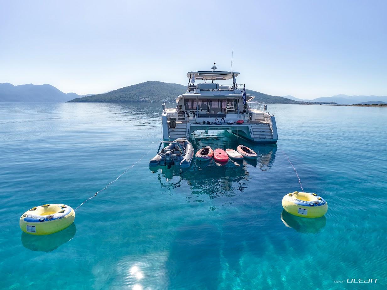 Highfield 4.20 tender with 60hp engine, 2 stand-up paddleboards, 2 SeaBobs, waterskis for adults and children, 2 kayaks, wakeboard, inflatable donuts, snorkeling and fishing gear.