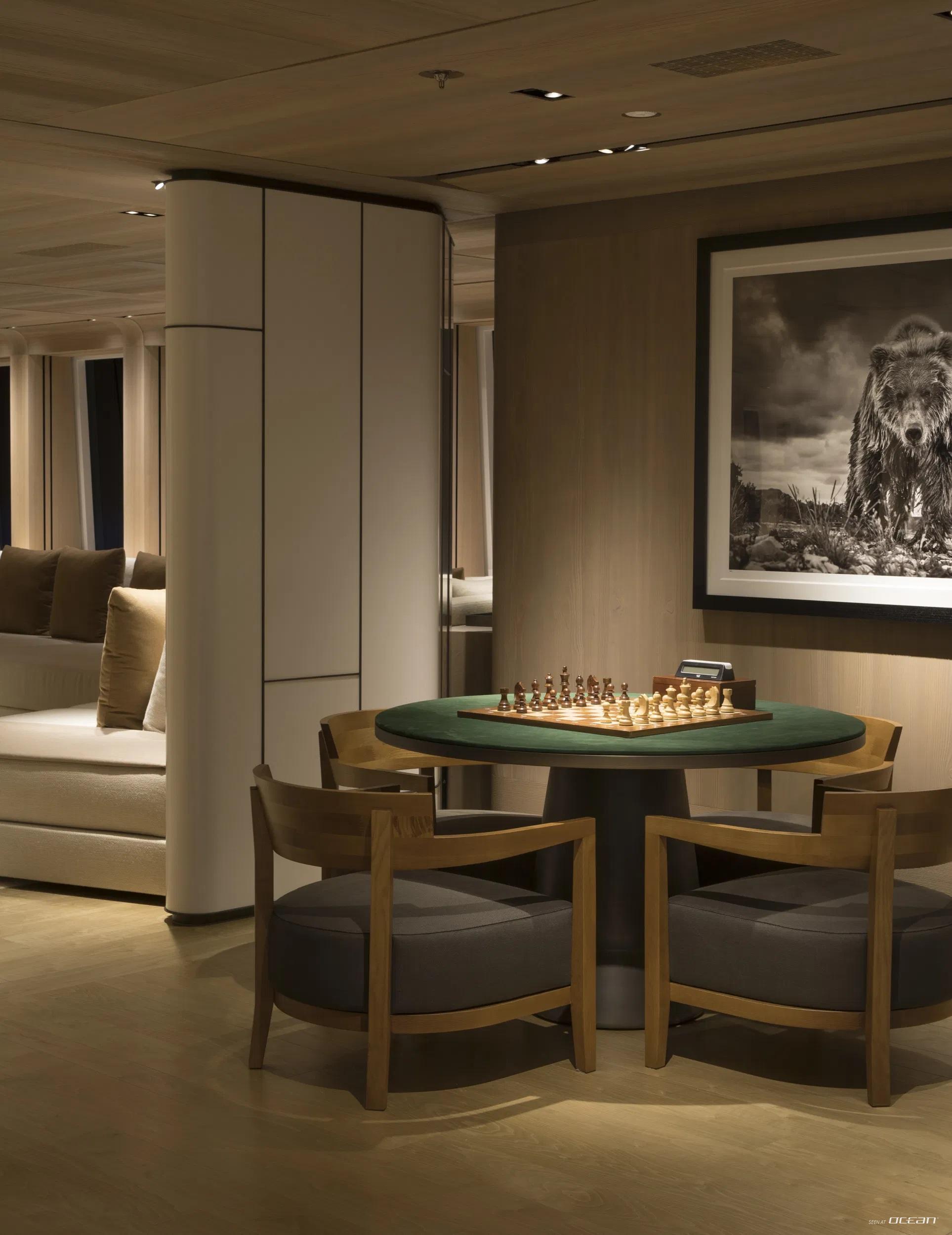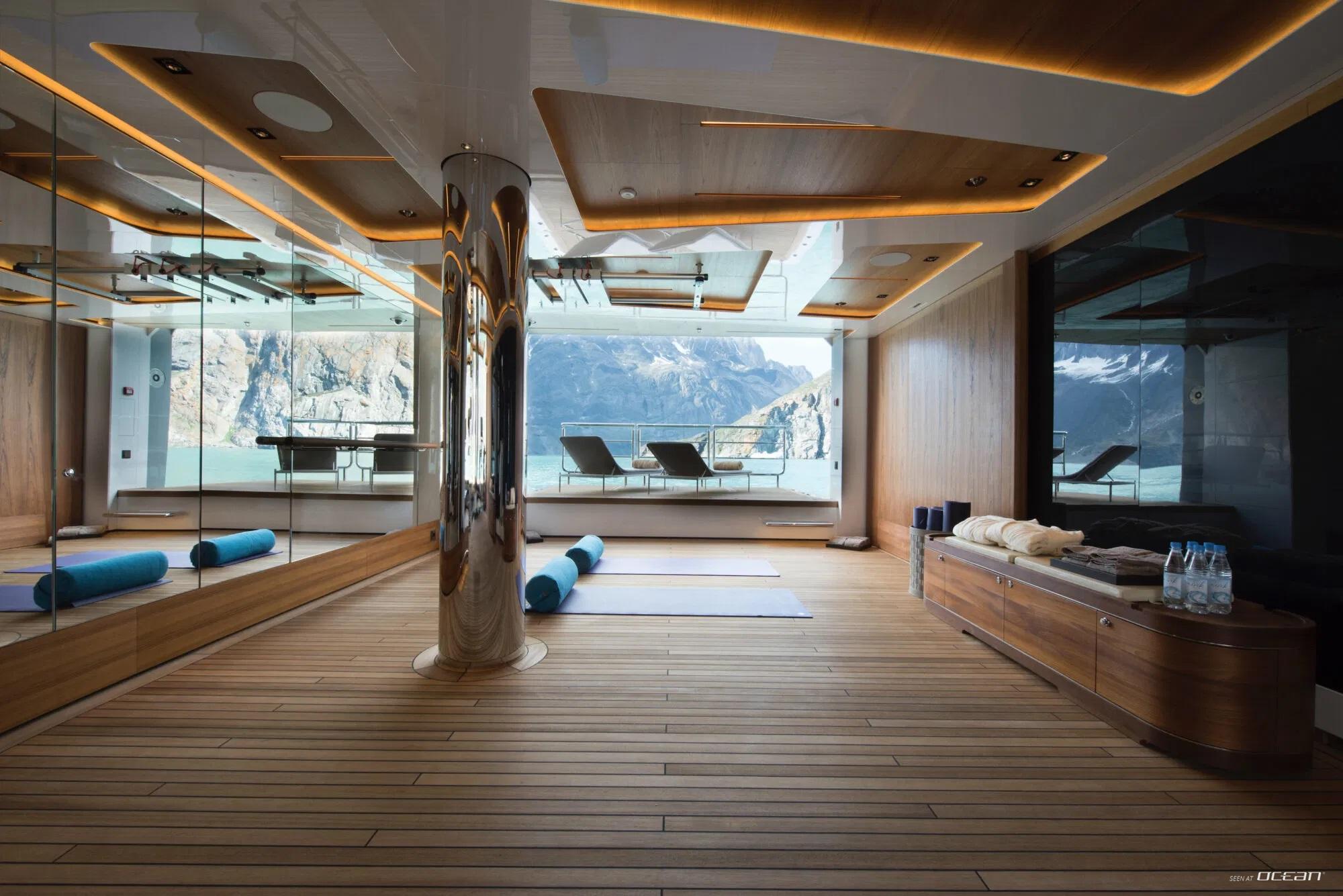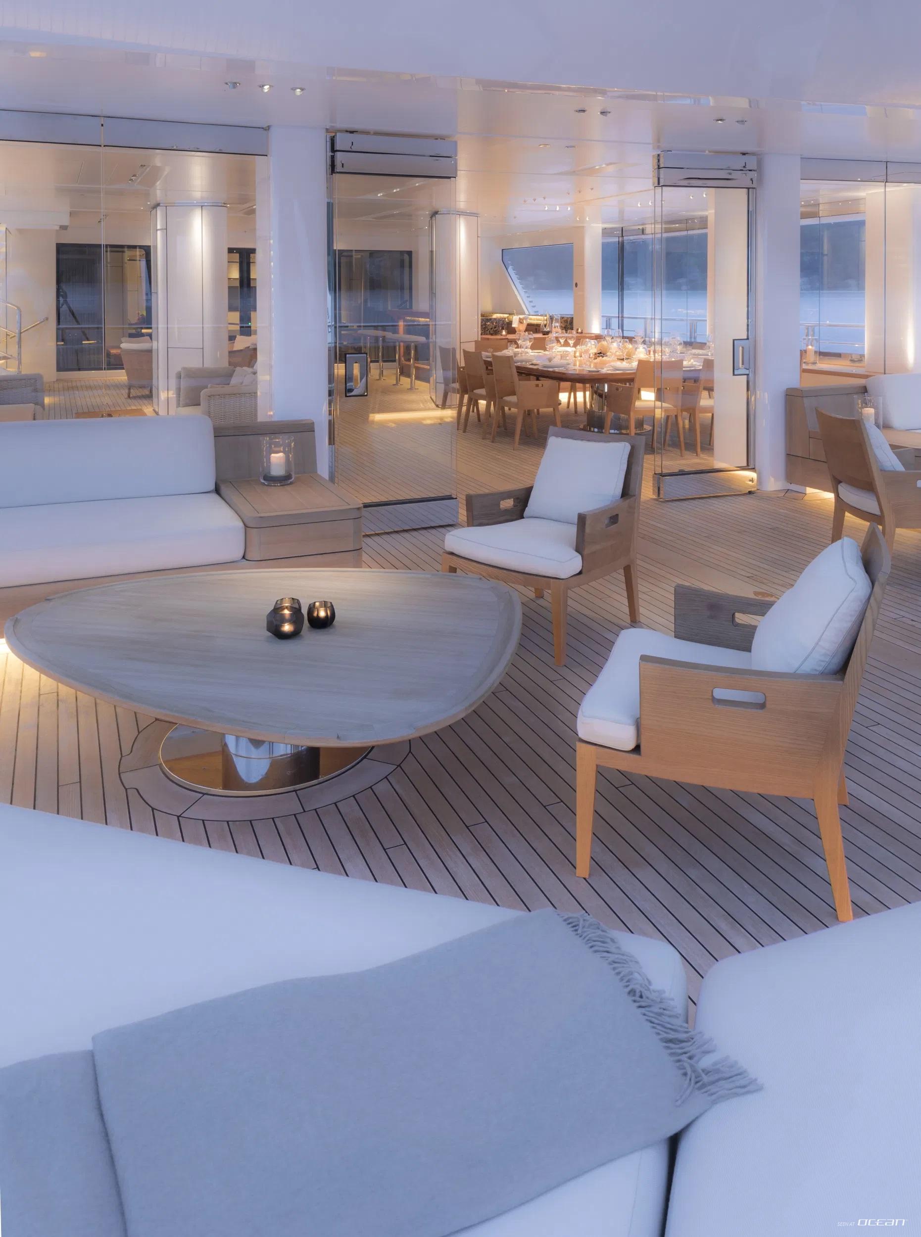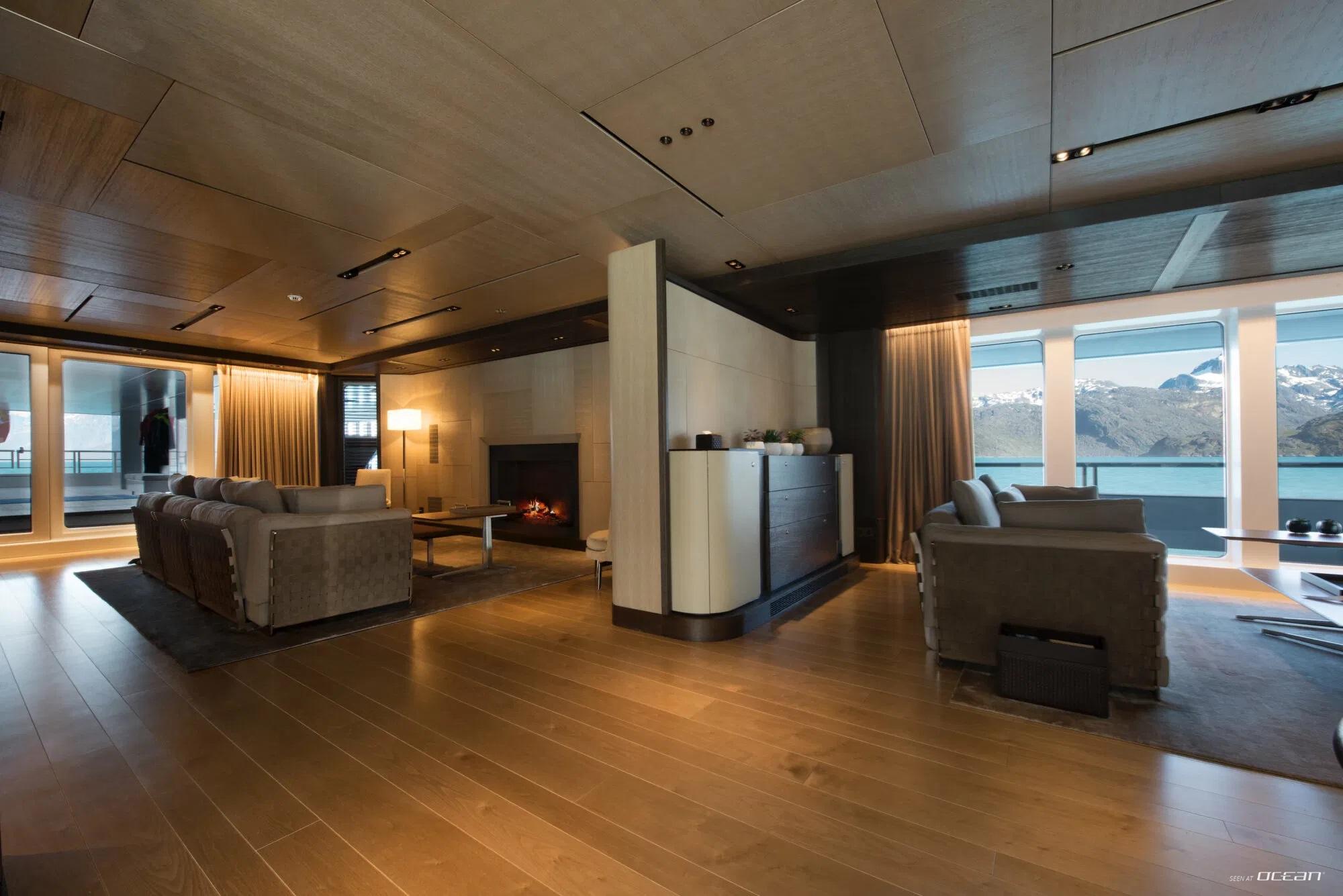 CLOUDBREAK presents a serene, full-height interior with natural textures, expansive windows, and an inviting mountain lodge ambiance. The main salon features a signature fireplace for cosy evenings after a day of exploration. A winter garden on the bridge deck provides a tranquil retreat in all climates, while the eagle nest observation tower offers panoramic views during navigation. Her wellness center and gym open to a generous balcony for fresh-air workouts and relaxation. Every area has been designed to enhance the guest experience across seasons and destinations.