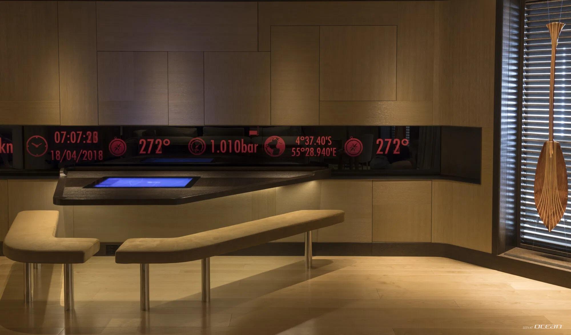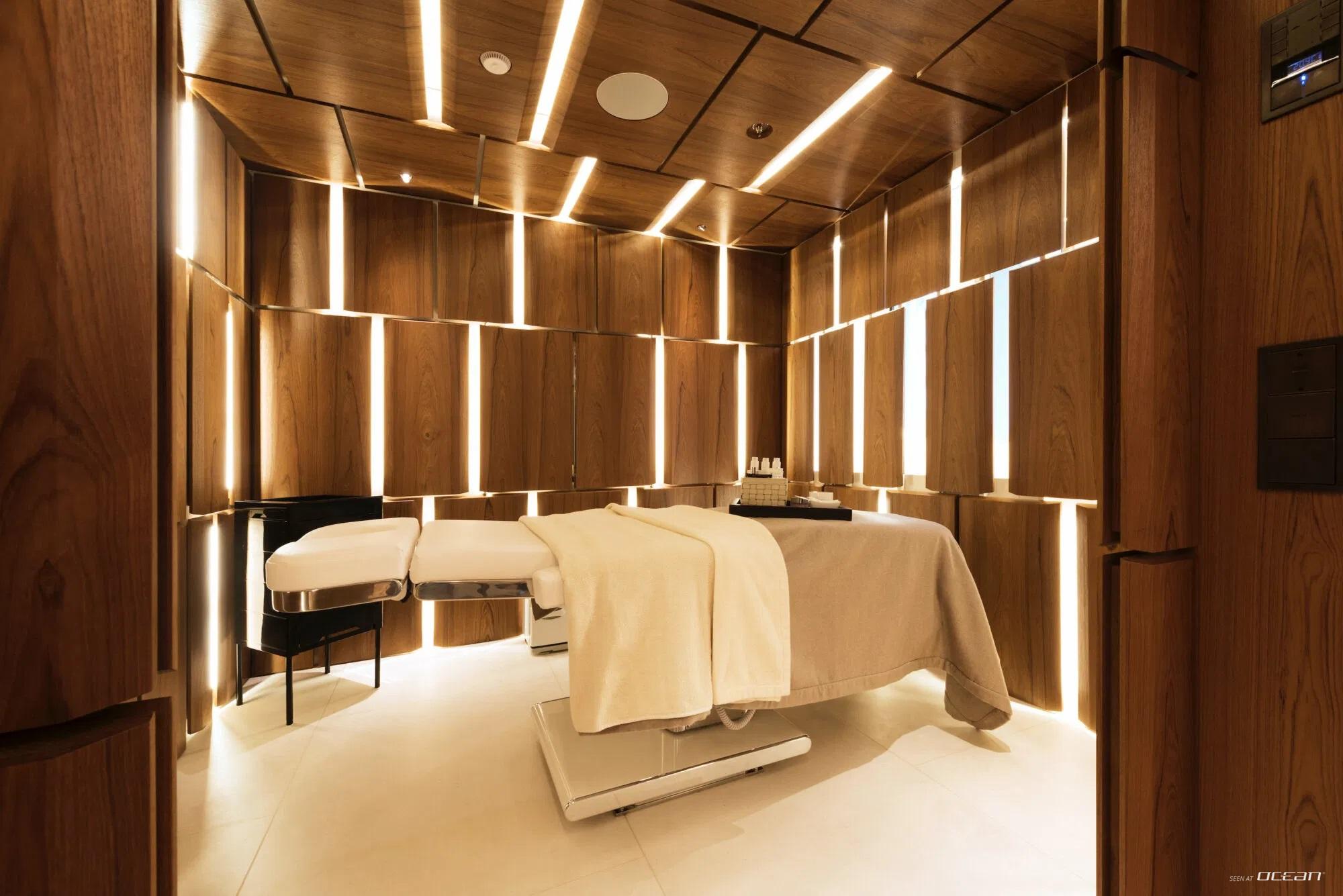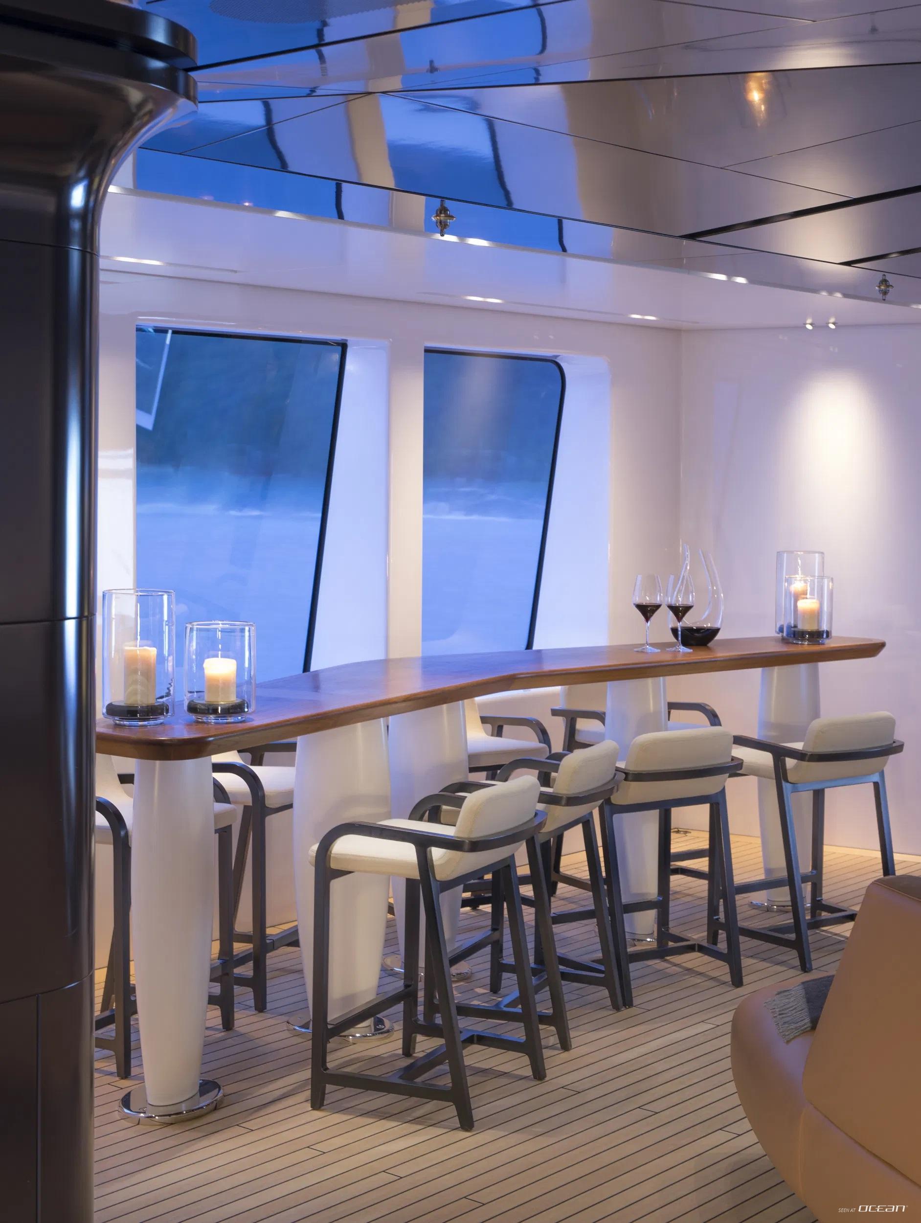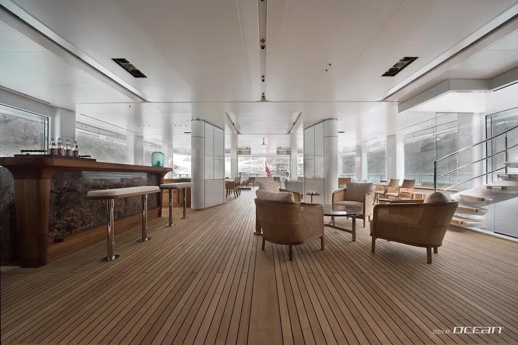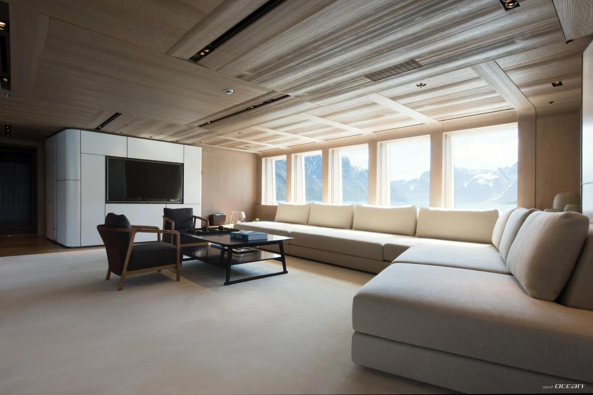 CLOUDBREAK presents a serene, full-height interior with natural textures, expansive windows, and an inviting mountain lodge ambiance. The main salon features a signature fireplace for cosy evenings after a day of exploration. A winter garden on the bridge deck provides a tranquil retreat in all climates, while the eagle nest observation tower offers panoramic views during navigation. Her wellness center and gym open to a generous balcony for fresh-air workouts and relaxation. Every area has been designed to enhance the guest experience across seasons and destinations.