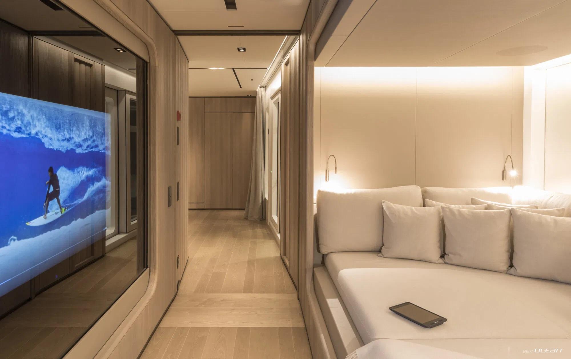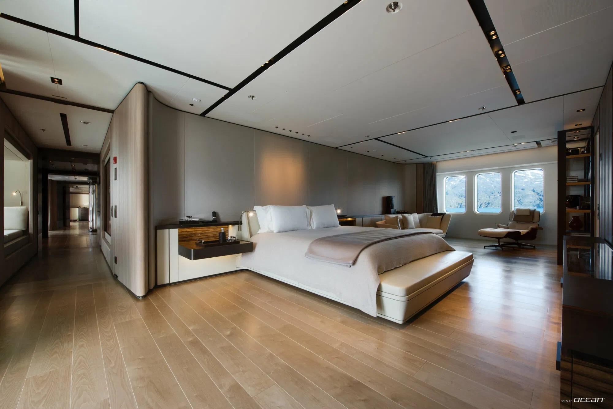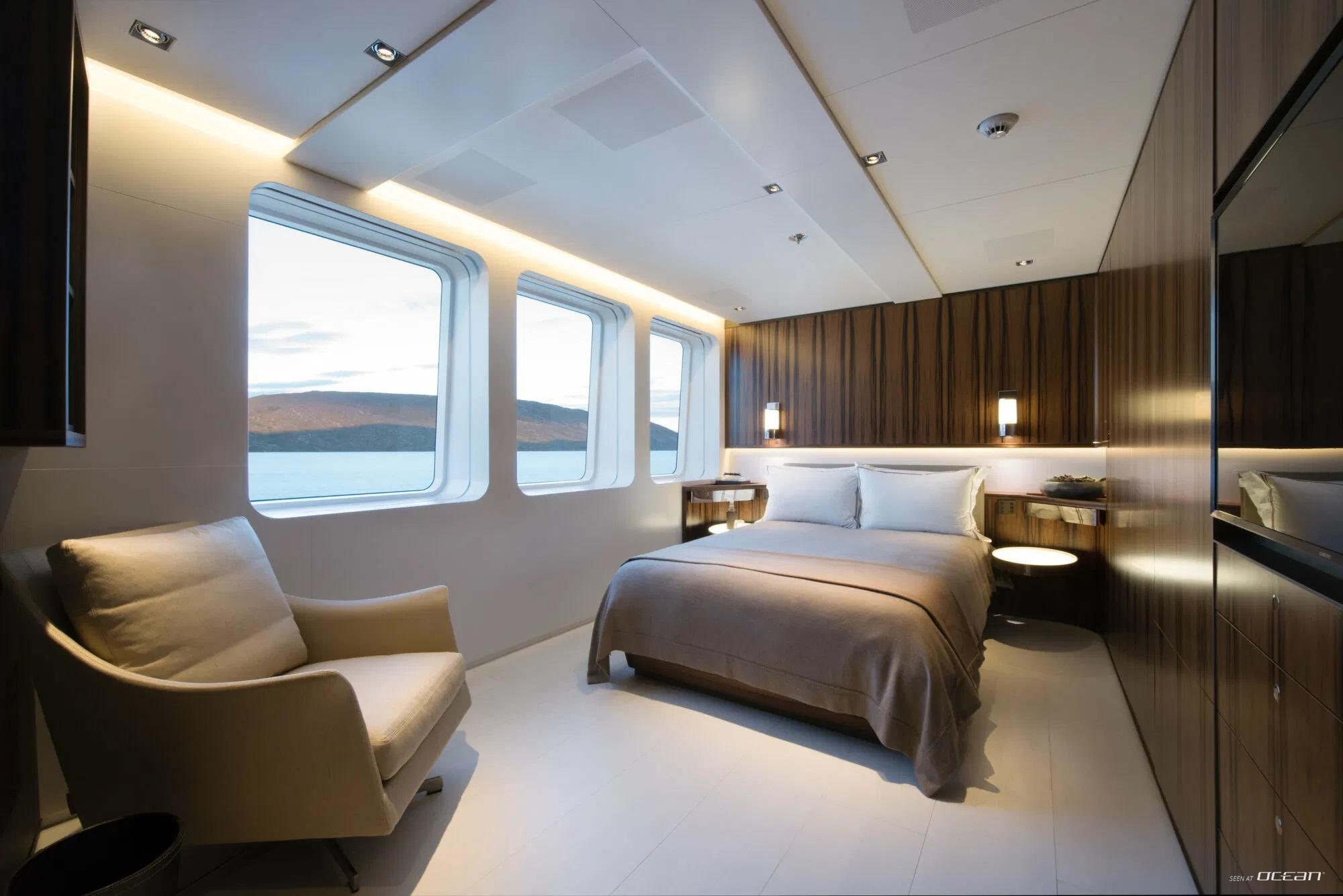 CLOUDBREAK luxury explorer megayacht for charter welcomes up to 12 guests in beautifully appointed suites crafted for privacy and comfort. The master cabin stands out with two balconies, one enclosed and one completely open, delivering a rare connection to the sea. Each stateroom features refined materials, curated artwork, and calming tones inspired by alpine residences. An elevator links the lower, main, upper, and sun decks, ensuring seamless movement throughout the yacht. With her attentive crew of 22, every detail of the stay is handled with discretion and precision.