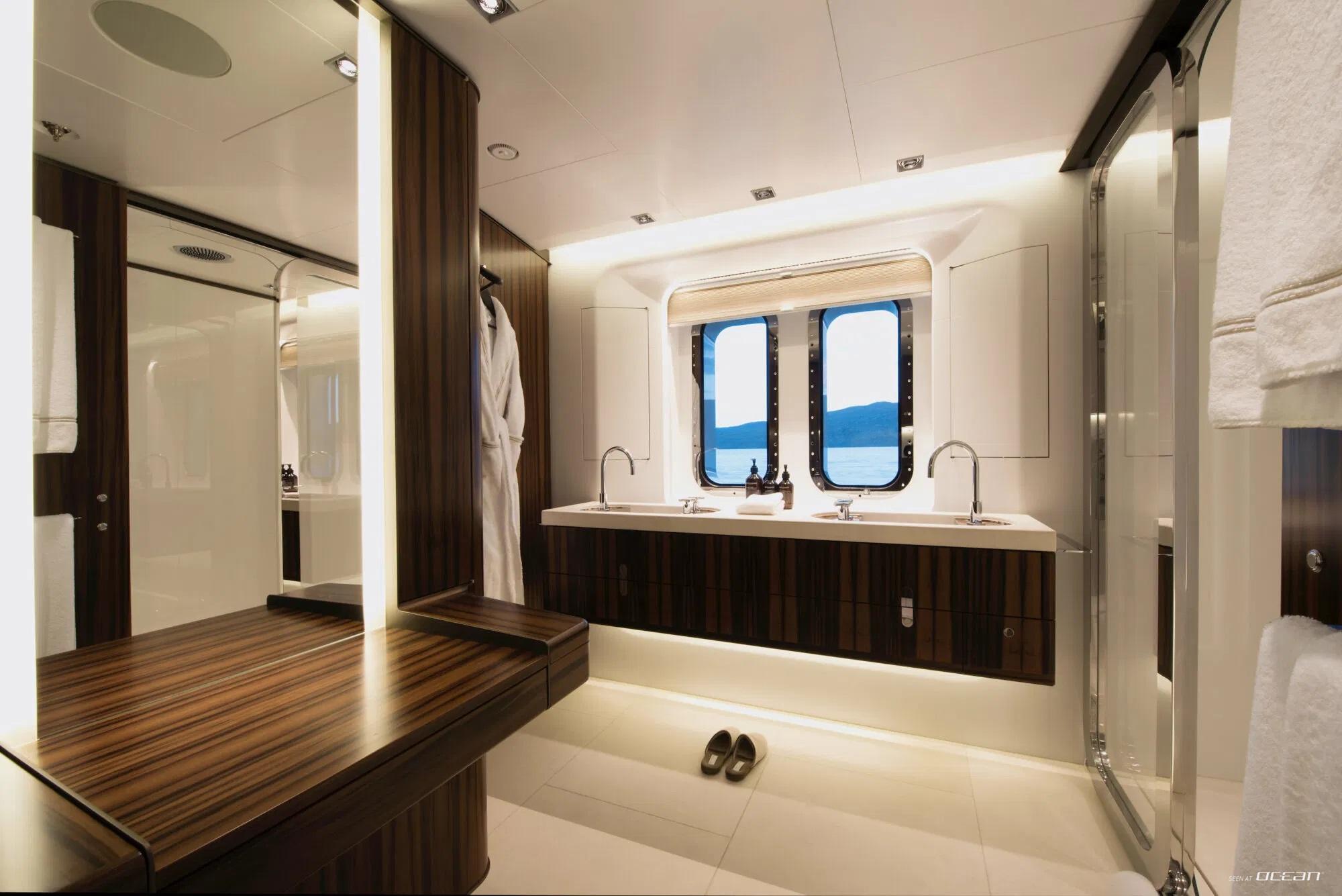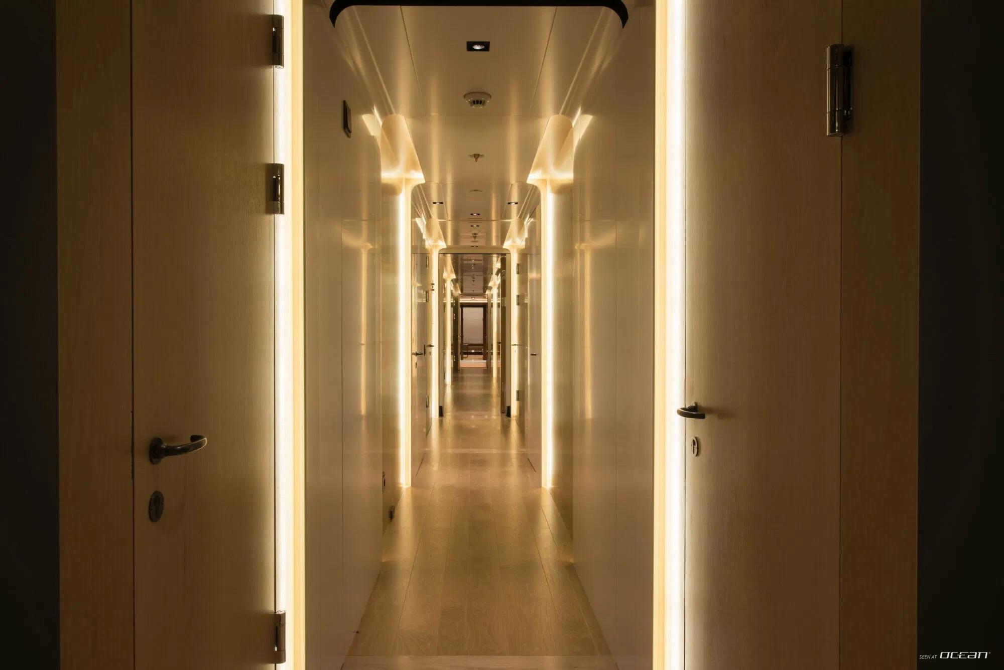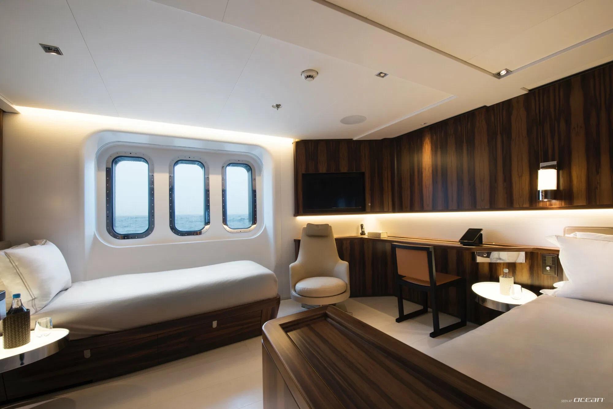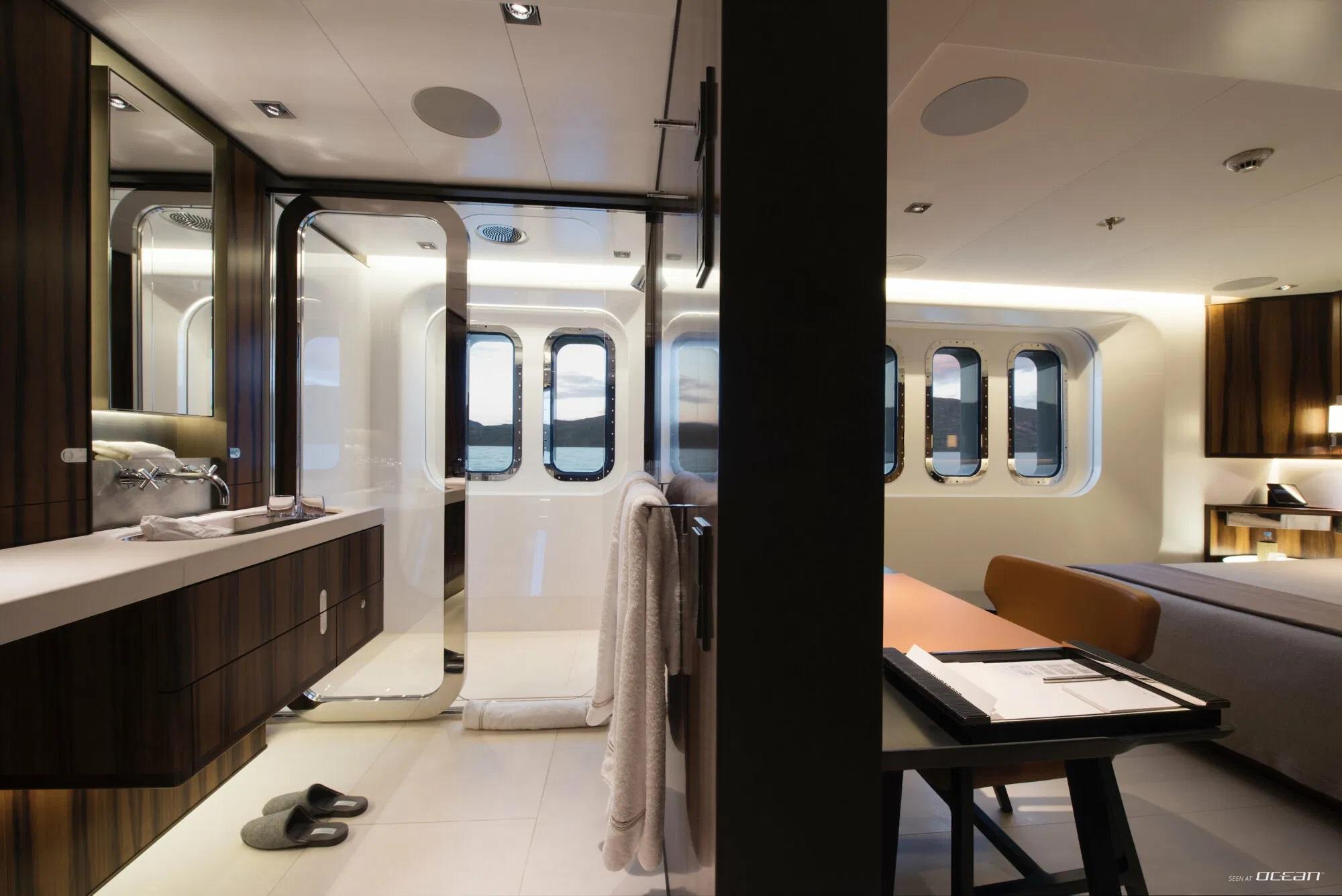 CLOUDBREAK luxury explorer megayacht for charter welcomes up to 12 guests in beautifully appointed suites crafted for privacy and comfort. The master cabin stands out with two balconies, one enclosed and one completely open, delivering a rare connection to the sea. Each stateroom features refined materials, curated artwork, and calming tones inspired by alpine residences. An elevator links the lower, main, upper, and sun decks, ensuring seamless movement throughout the yacht. With her attentive crew of 22, every detail of the stay is handled with discretion and precision.