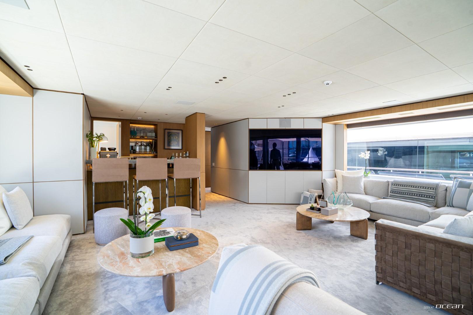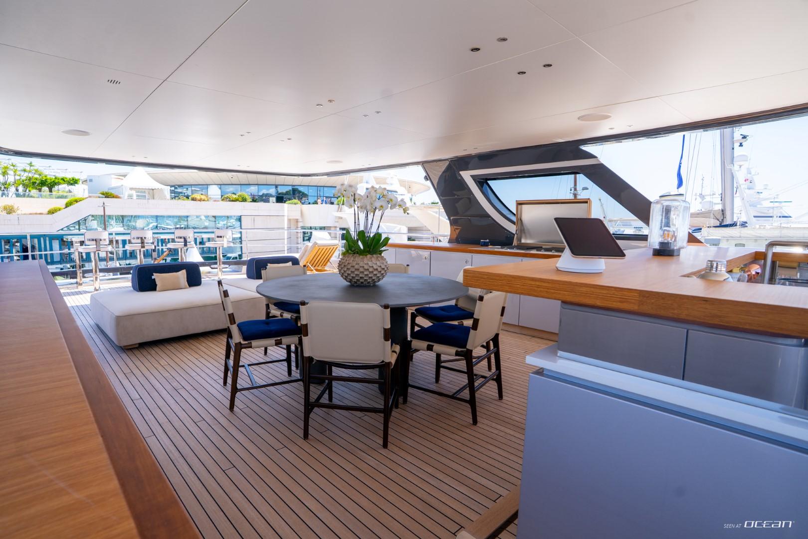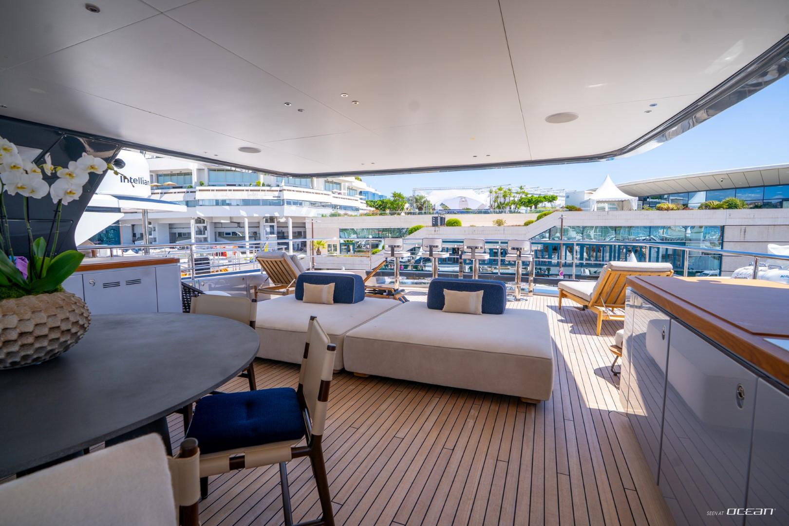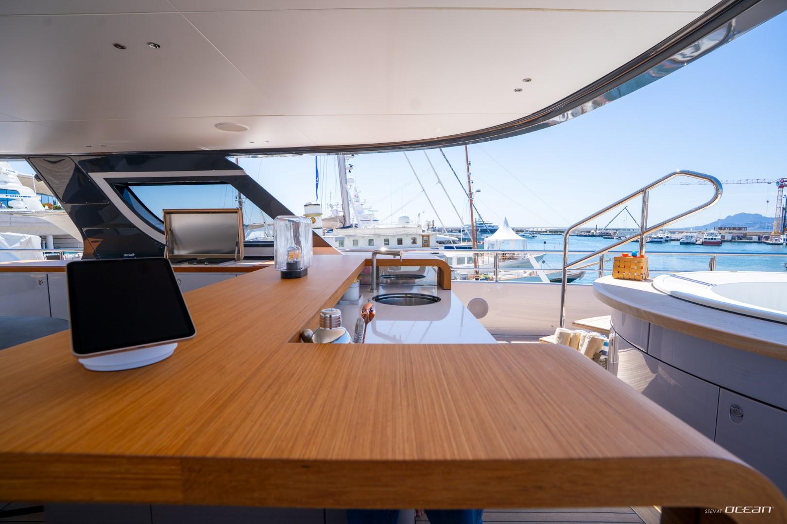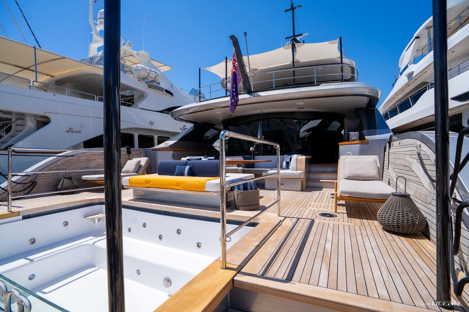 En-suite bathrooms in all cabins, air condition throughout, generators, stabilizers at anchor, stabilizers underway, Wi-Fi internet, smart TV in salon and all cabins, outdoor sound system, deck jacuzzi, beach club with infinity pool and fold-down side terraces, and a variety of water toys.