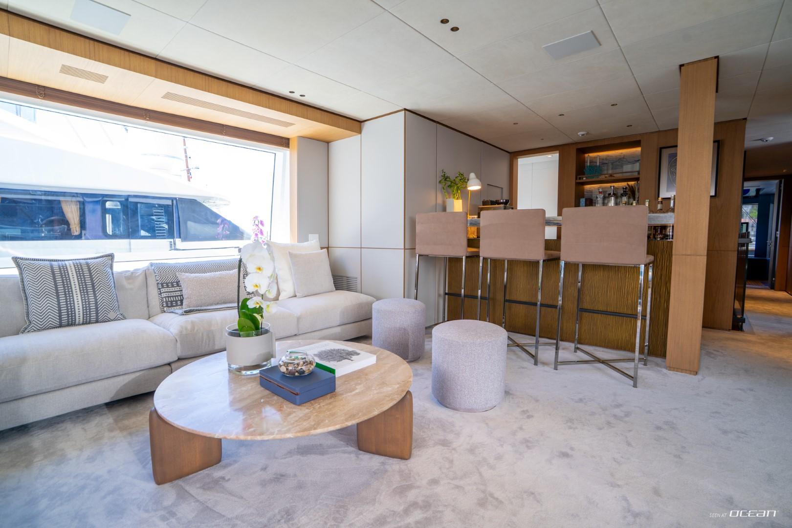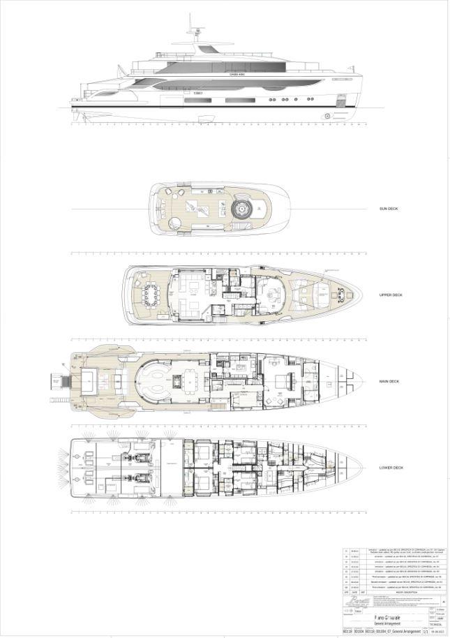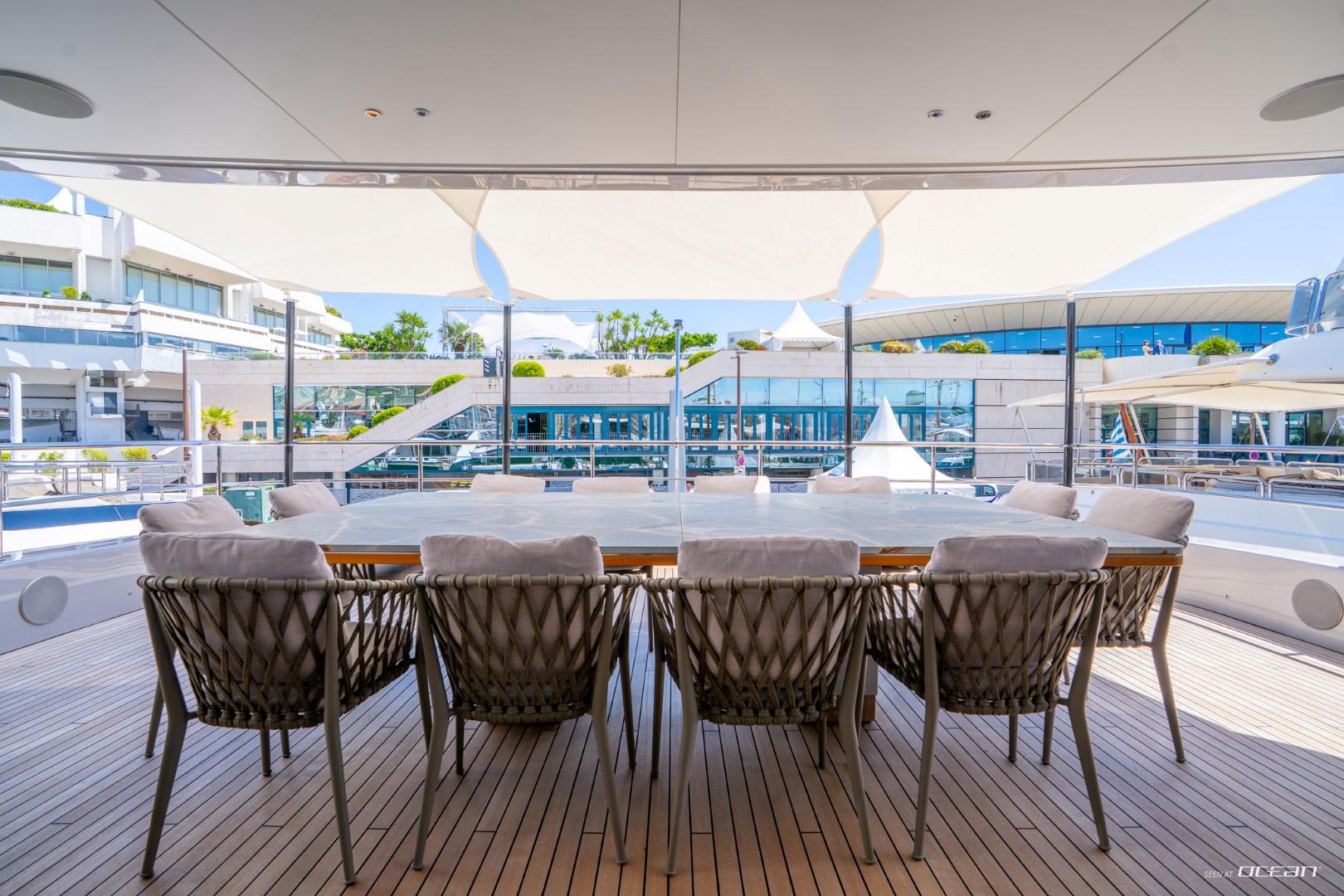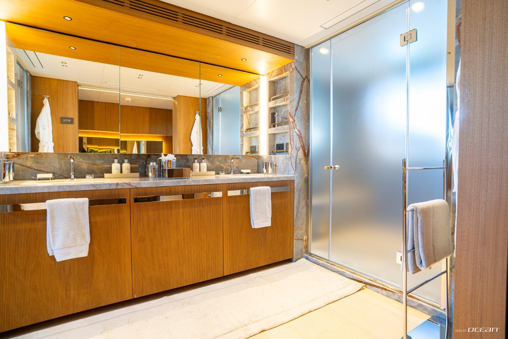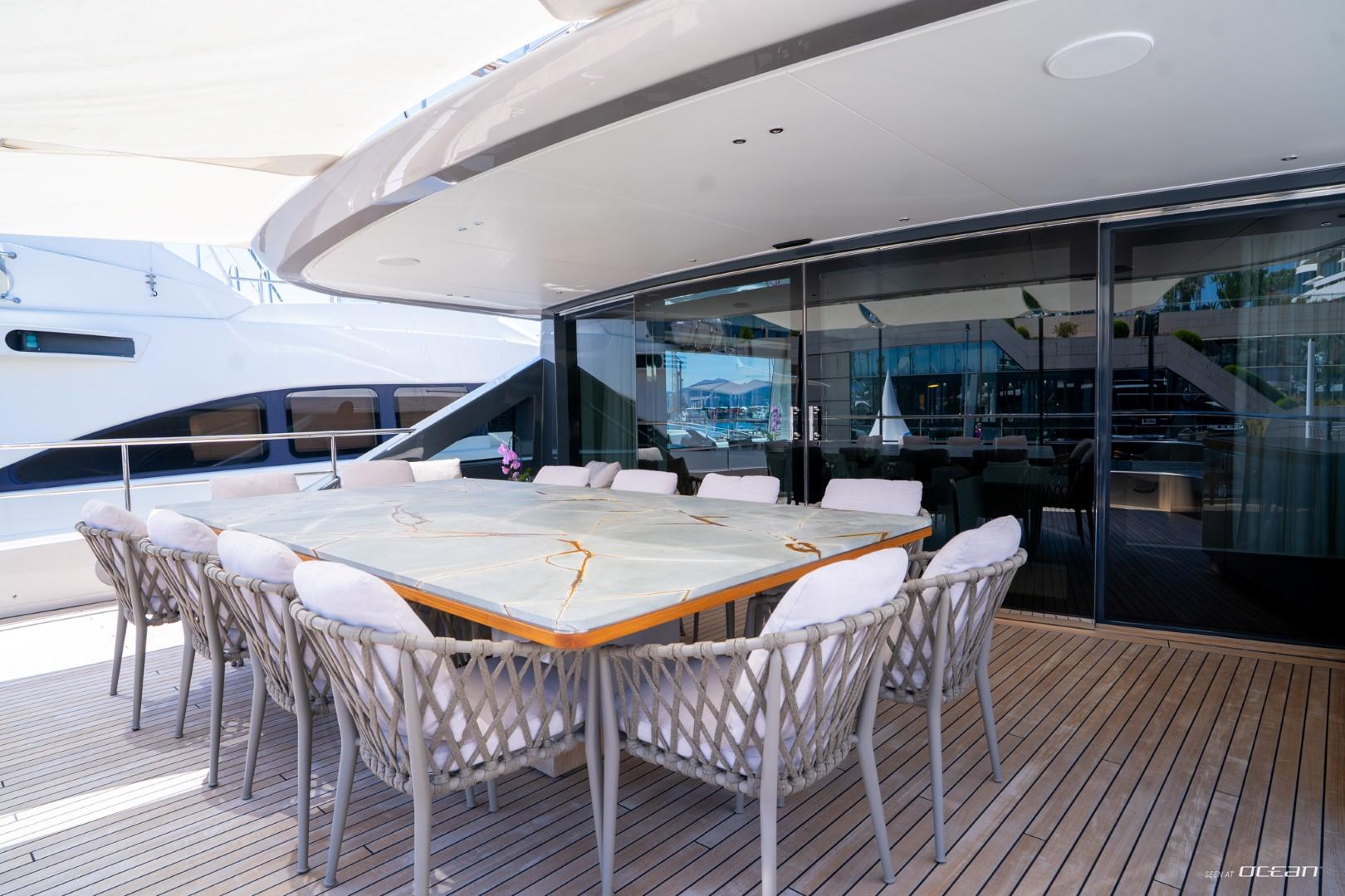 En-suite bathrooms in all cabins, air condition throughout, generators, stabilizers at anchor, stabilizers underway, Wi-Fi internet, smart TV in salon and all cabins, outdoor sound system, deck jacuzzi, beach club with infinity pool and fold-down side terraces, and a variety of water toys.