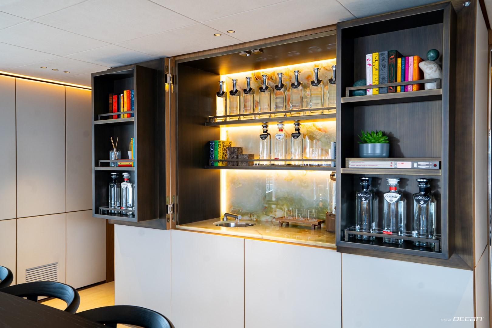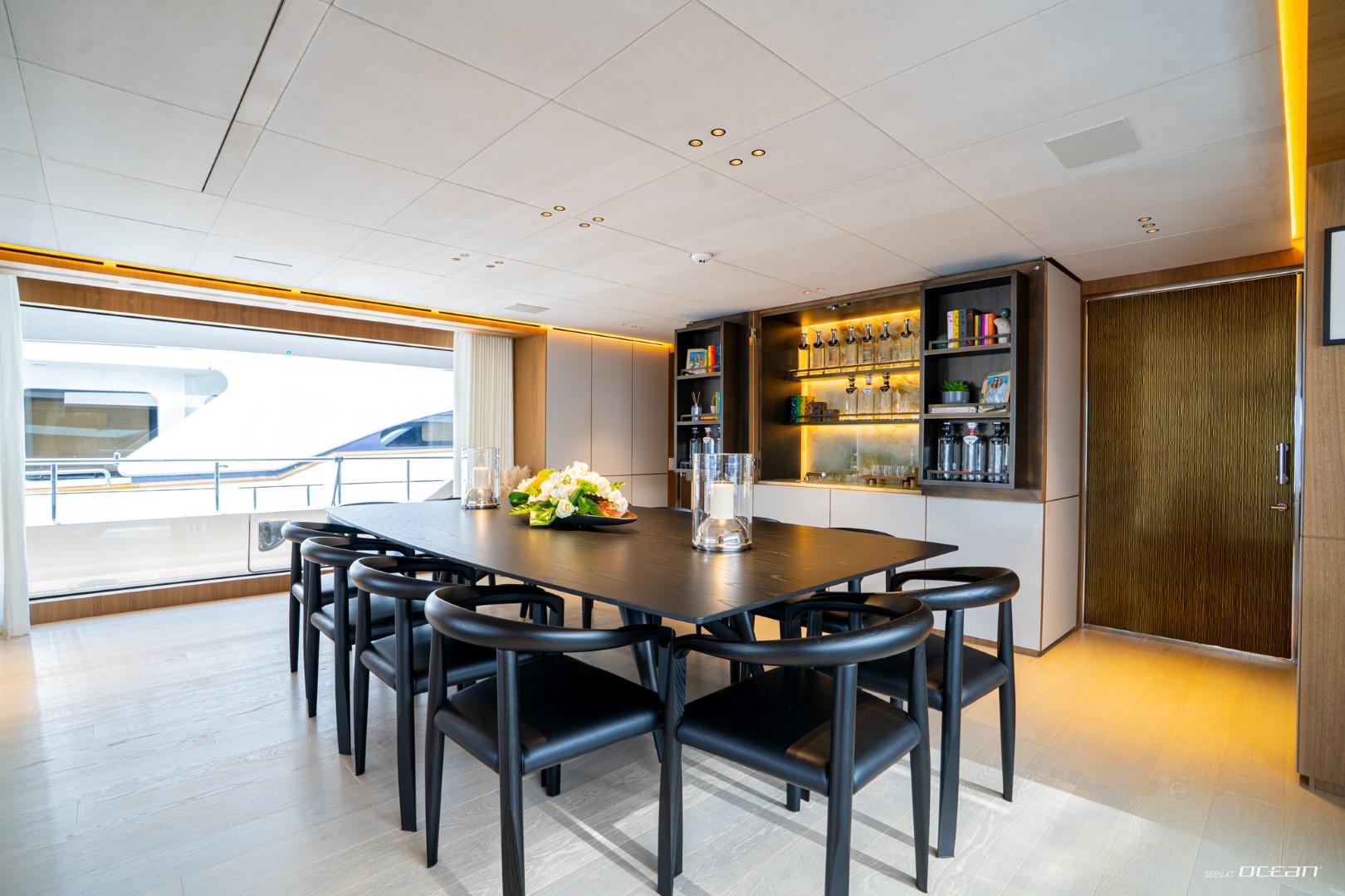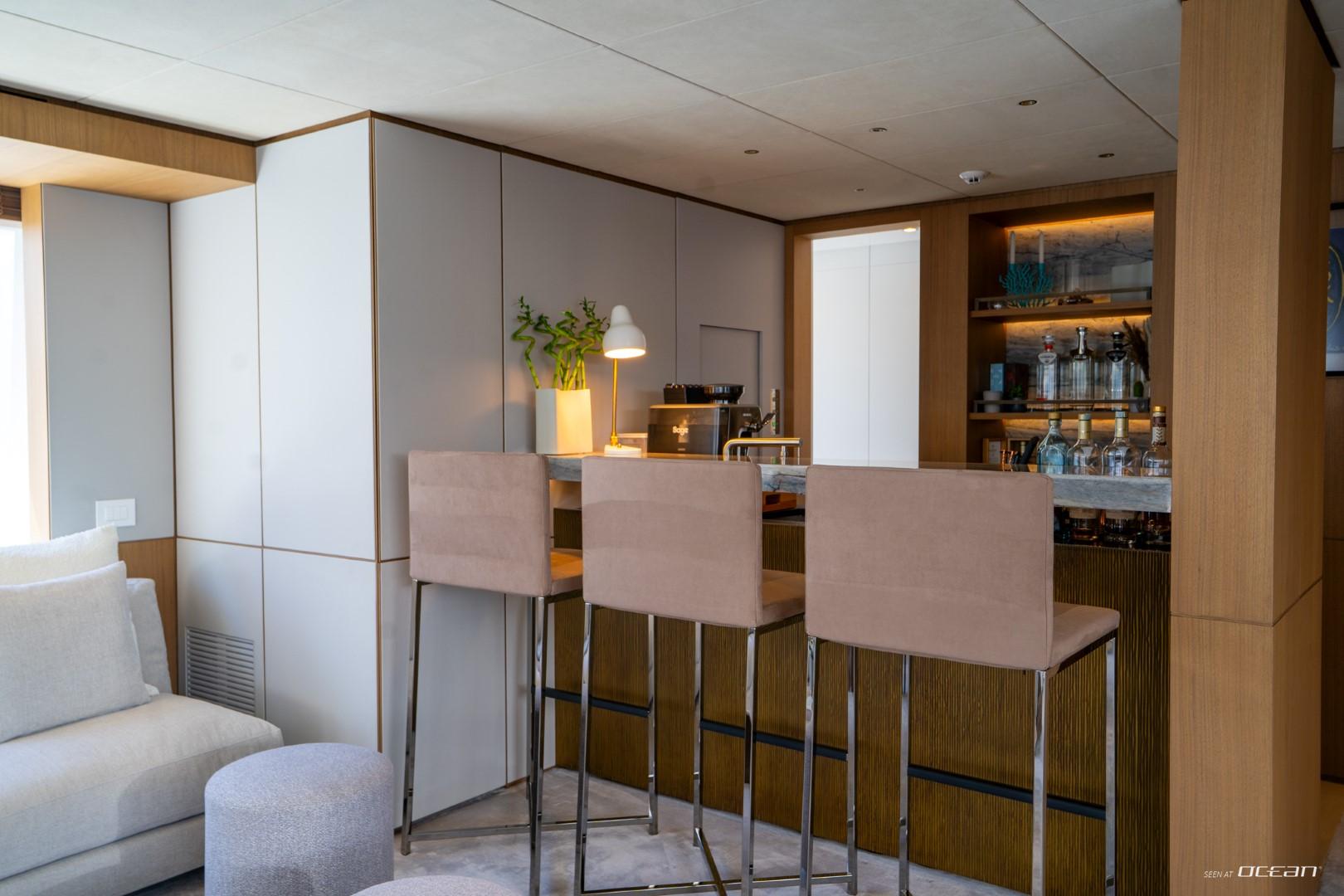 Charter Yacht COSMICO showcases Benetti’s renowned Oasis Deck, transforming the stern into a private waterfront terrace complete with infinity pool and fold-out sea balconies. The upper deck provides an ideal setting for alfresco dining, while the sun deck Jacuzzi delivers elevated relaxation above the coastline. Advanced stabilizers enhance onboard comfort whether cruising between destinations or anchored in a secluded bay.