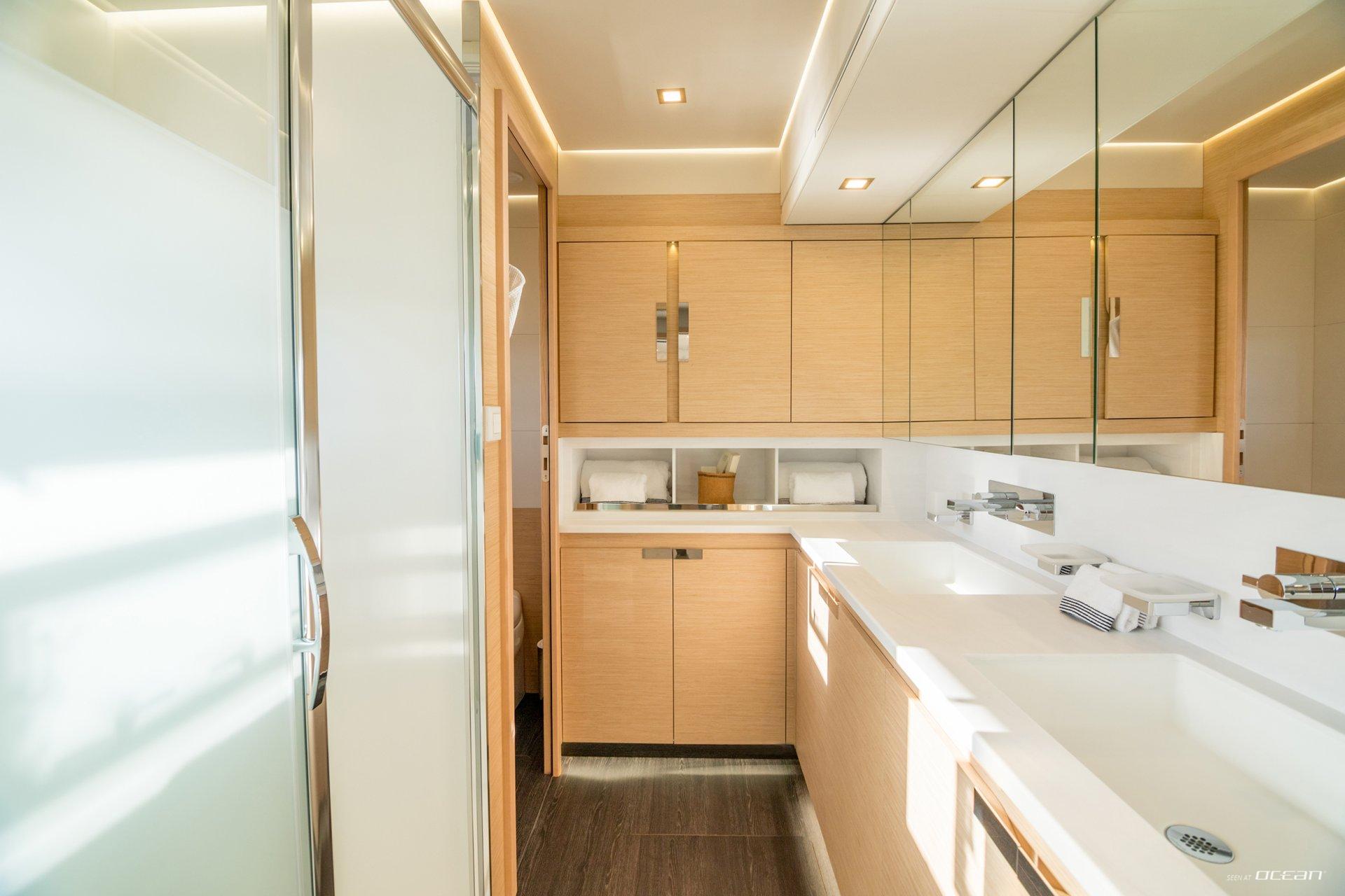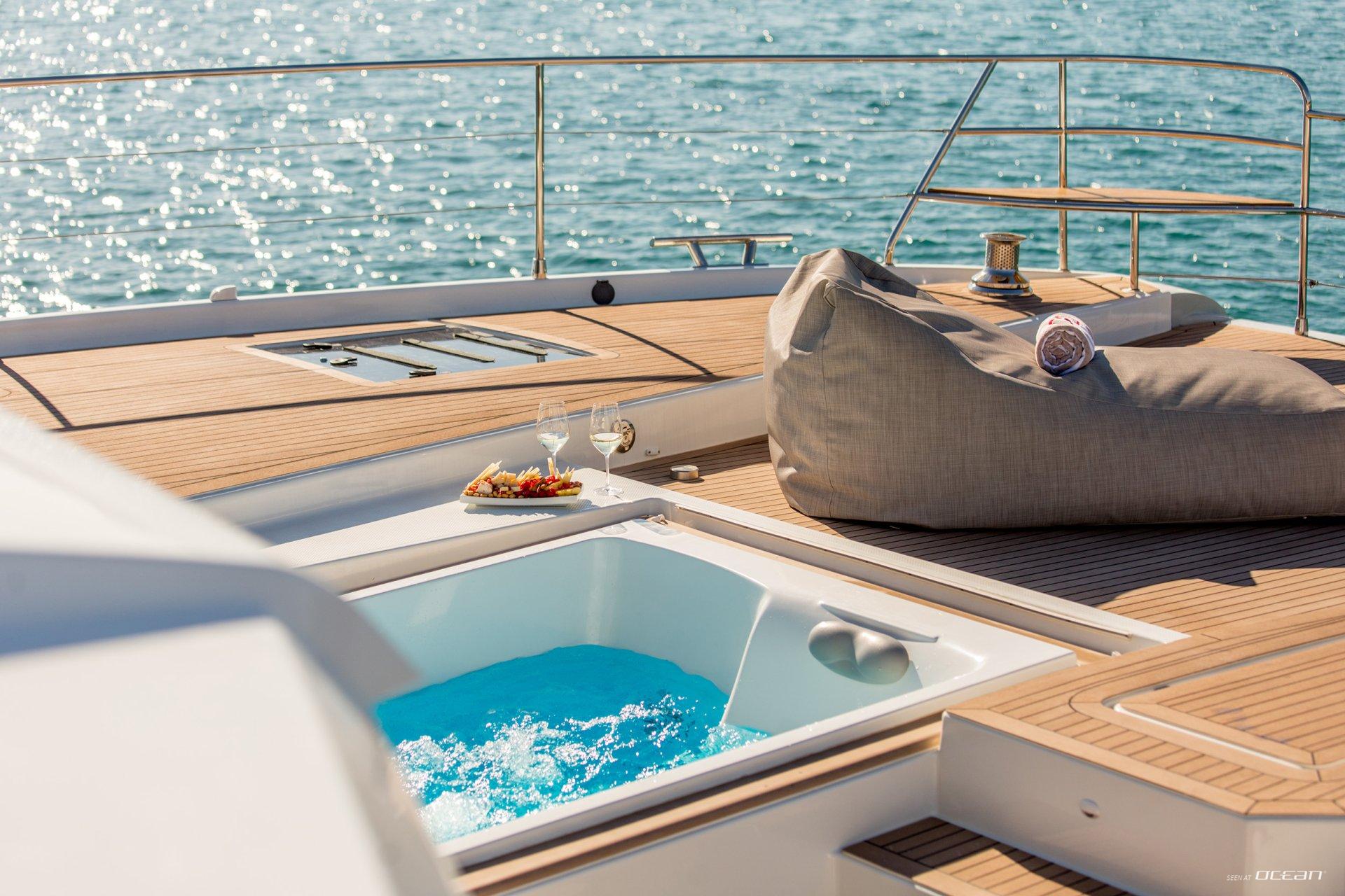 All cabins with en-suite bathrooms, air condition throughout, 2 generators, deck jacuzzi, water maker, teak deck, hydraulic gangway, outside speakers, latest A/V systems available in cabins and salon, Wi-Fi internet, ice maker, wine cellar, underwater lights, hydraulic swimming platform and a variety of water toys.