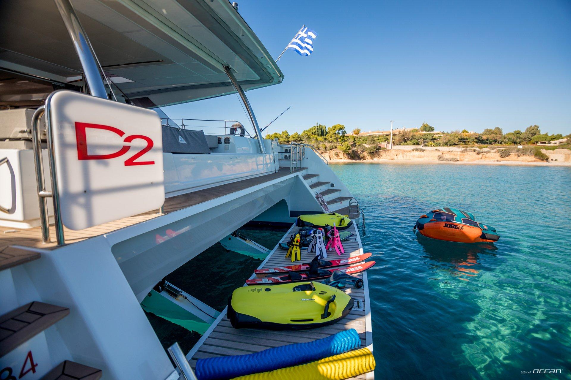 Based in Athens, D2 is open to bespoke itineraries through the Cyclades, Sporades, and Ionian Islands. Combining the fuel efficiency and stability of a catamaran with the freedom and power of a motor yacht, she offers the best of both worlds. Guests can enjoy an array of water toys, including seabobs, seascooters, SUPs, skis, and towables. With her balance of innovation, comfort, and adventure, D2 catamaran for charter defines a true Luxury Yacht Charter Greece experience.