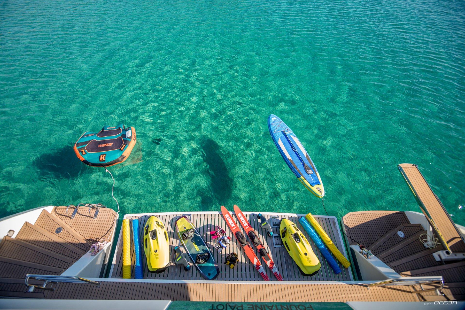 Highfield 460SP tender with 60hp outboard engine, water-skis, 2 stand-up paddleboards, 2 sea scooters, wakeboard, kayak, tubes, towable toys, fishing and snorkeling gear