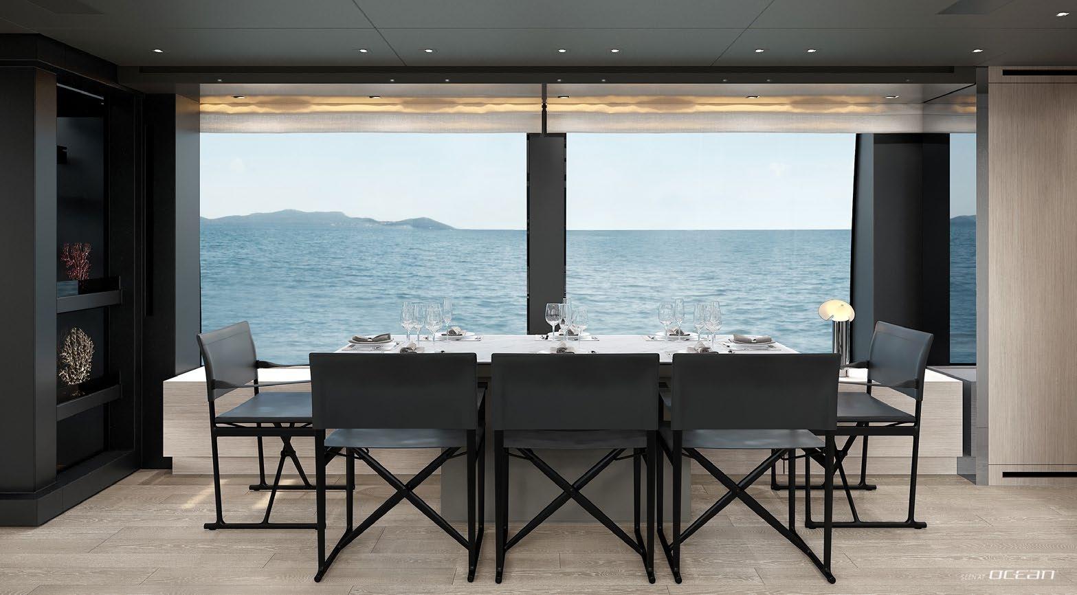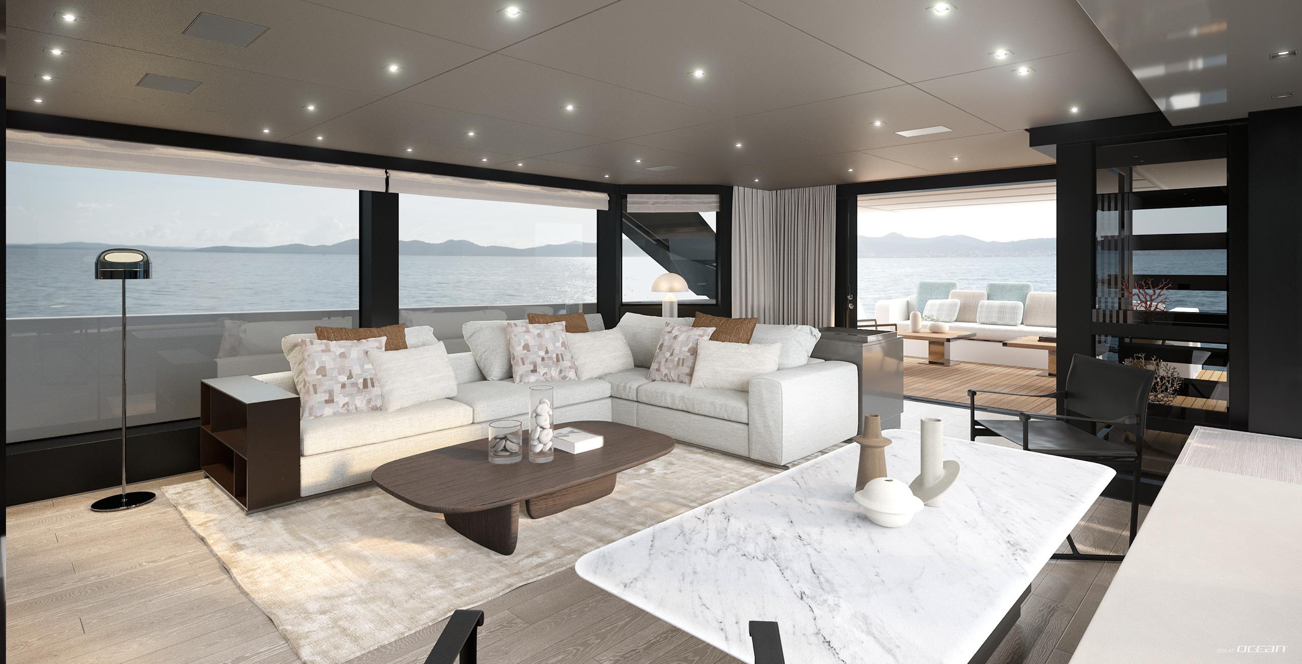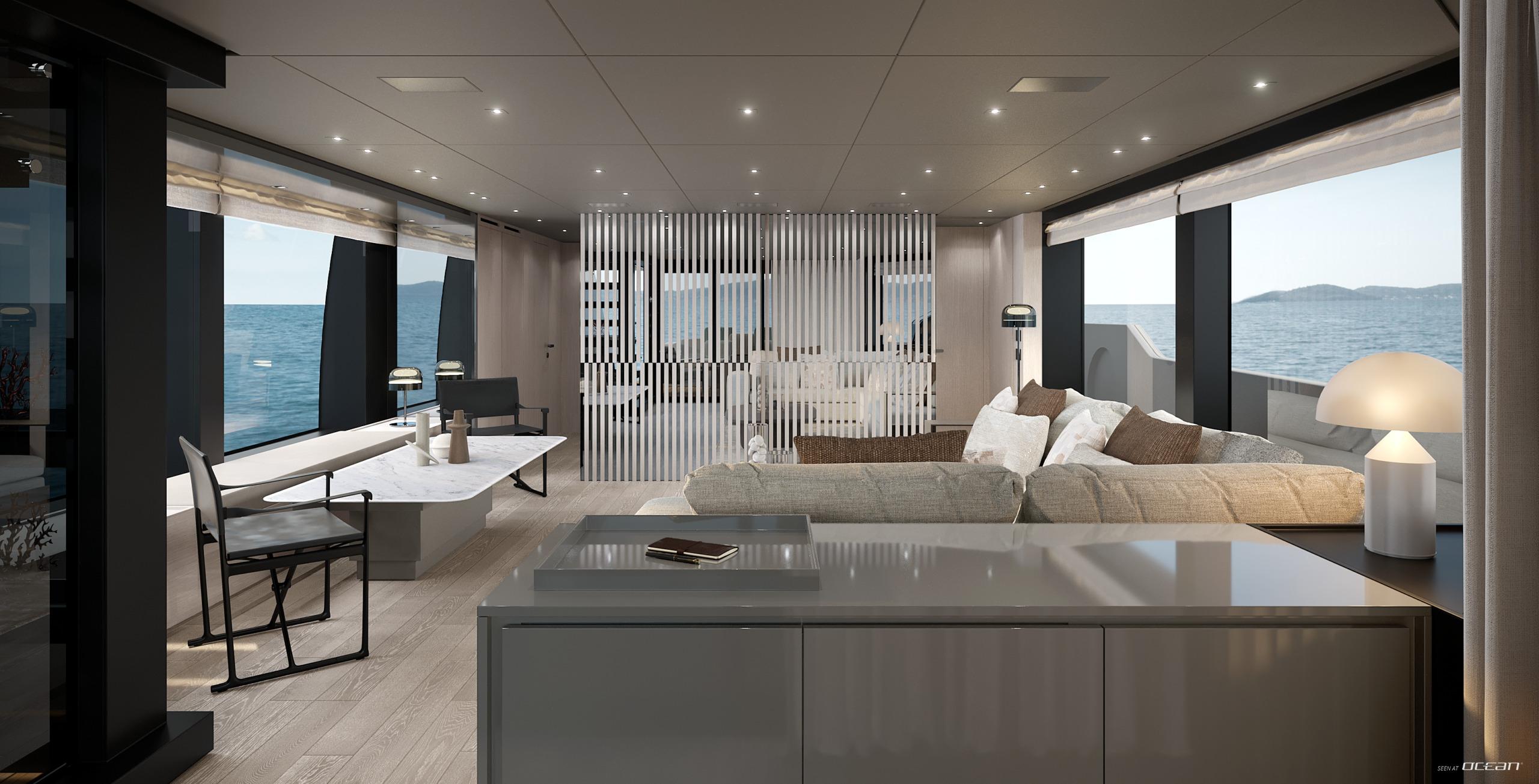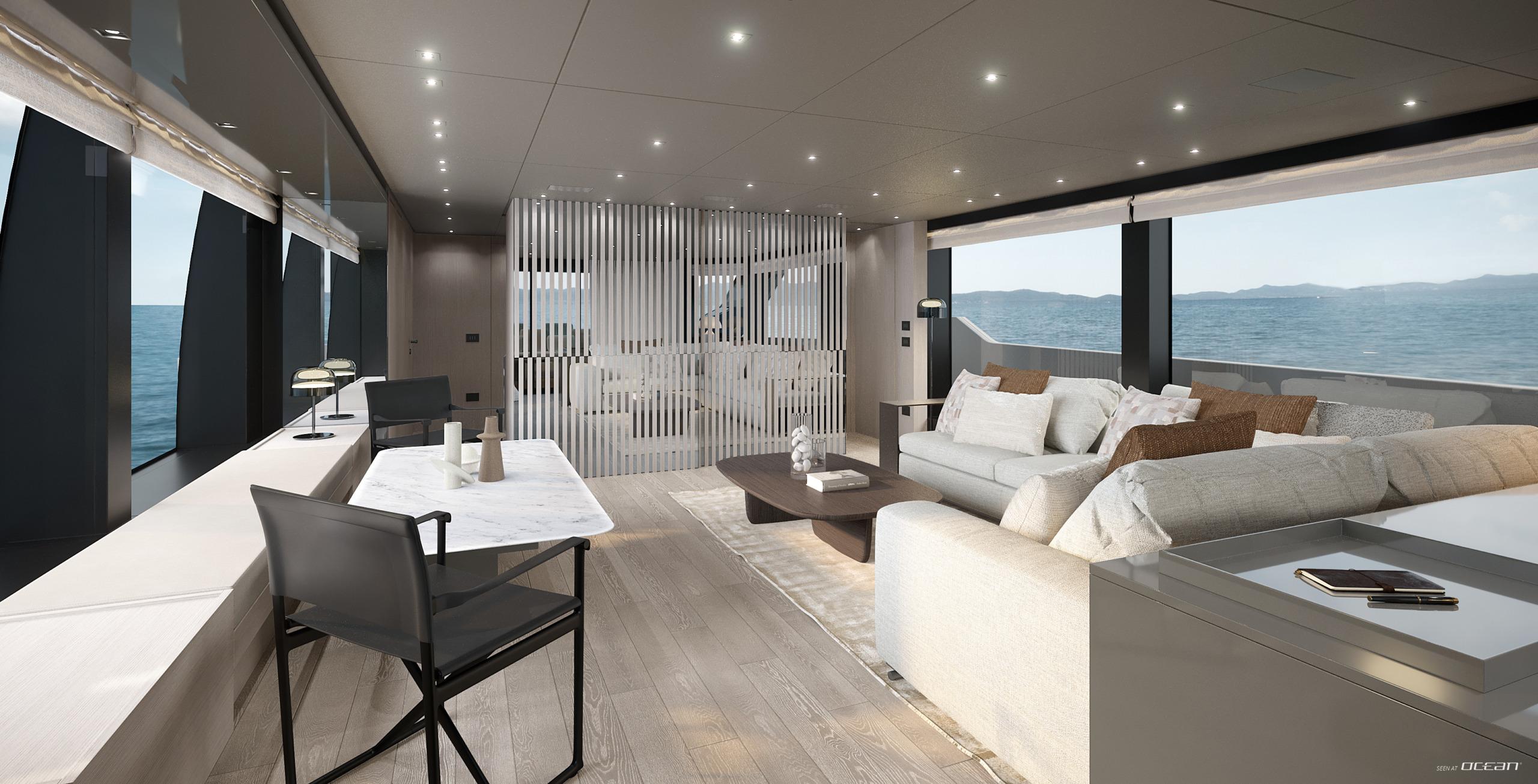 The asymmetric layout places the exterior walkway on one side only, freeing up space inside and opening the salon to expansive windows and panoramic views. This architectural approach enhances light, flow, and privacy, giving Sanlorenzo yacht DANLOU a calm, open atmosphere that feels both modern and timeless.
