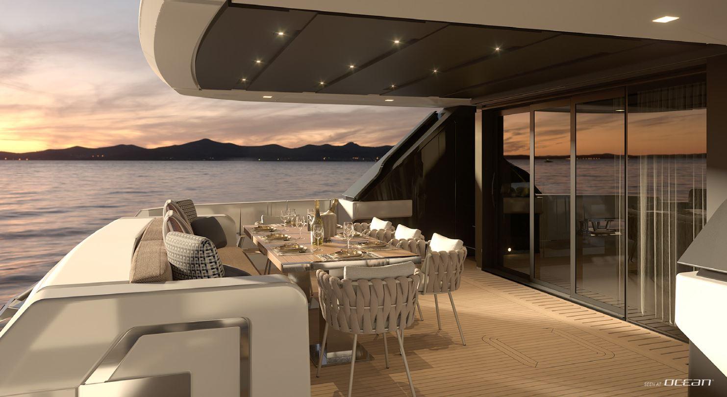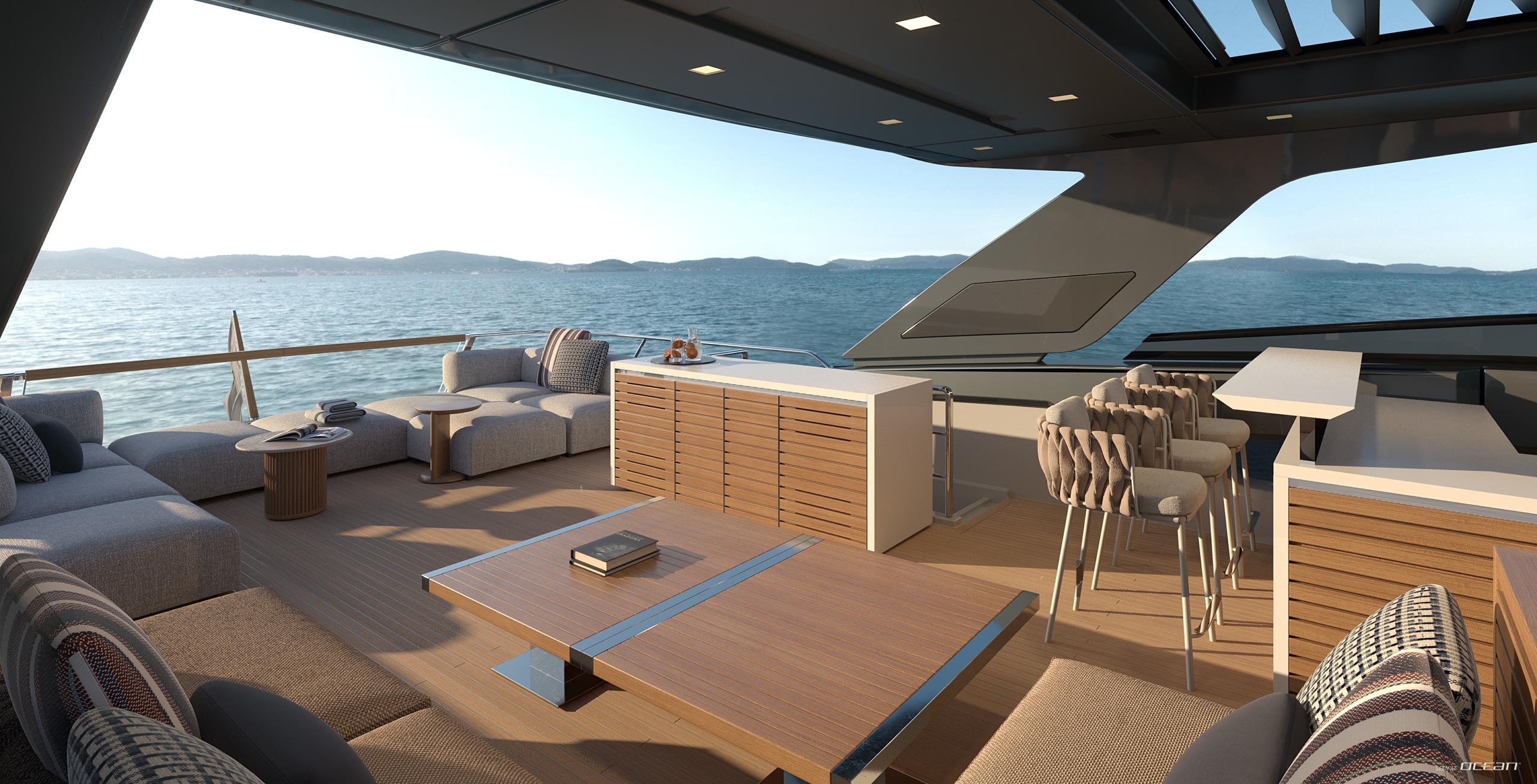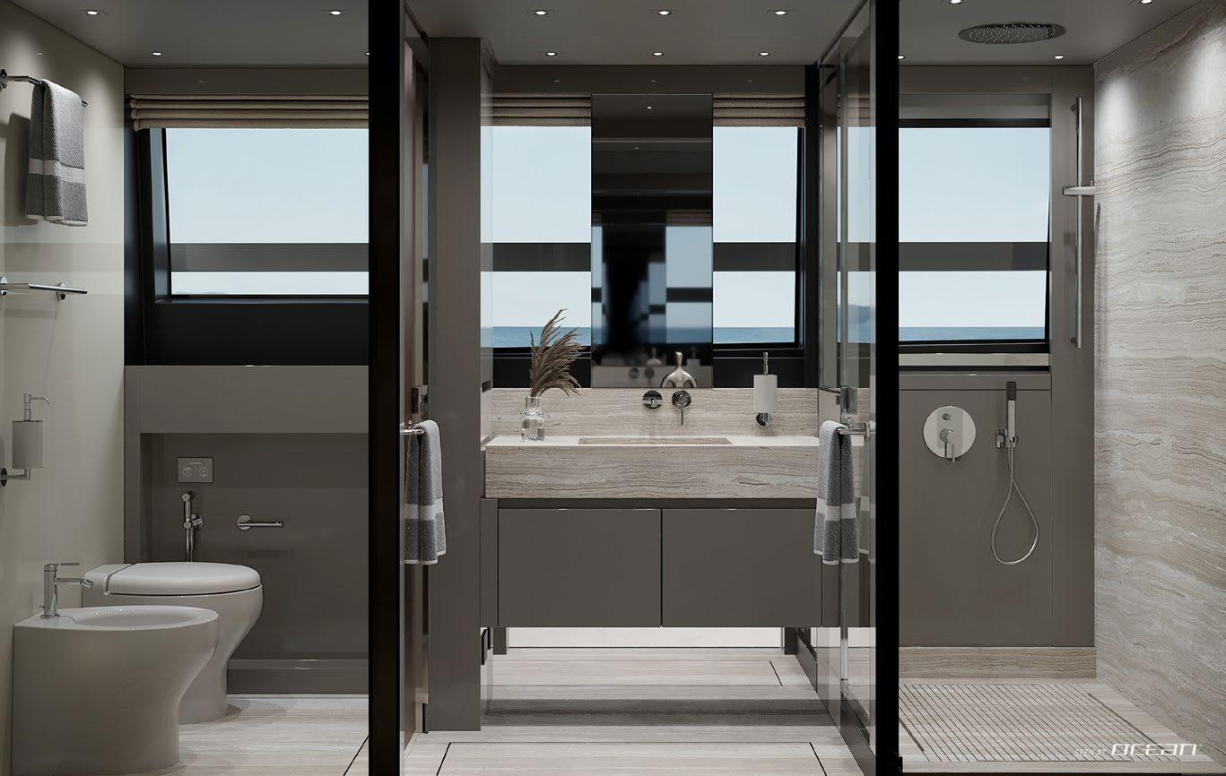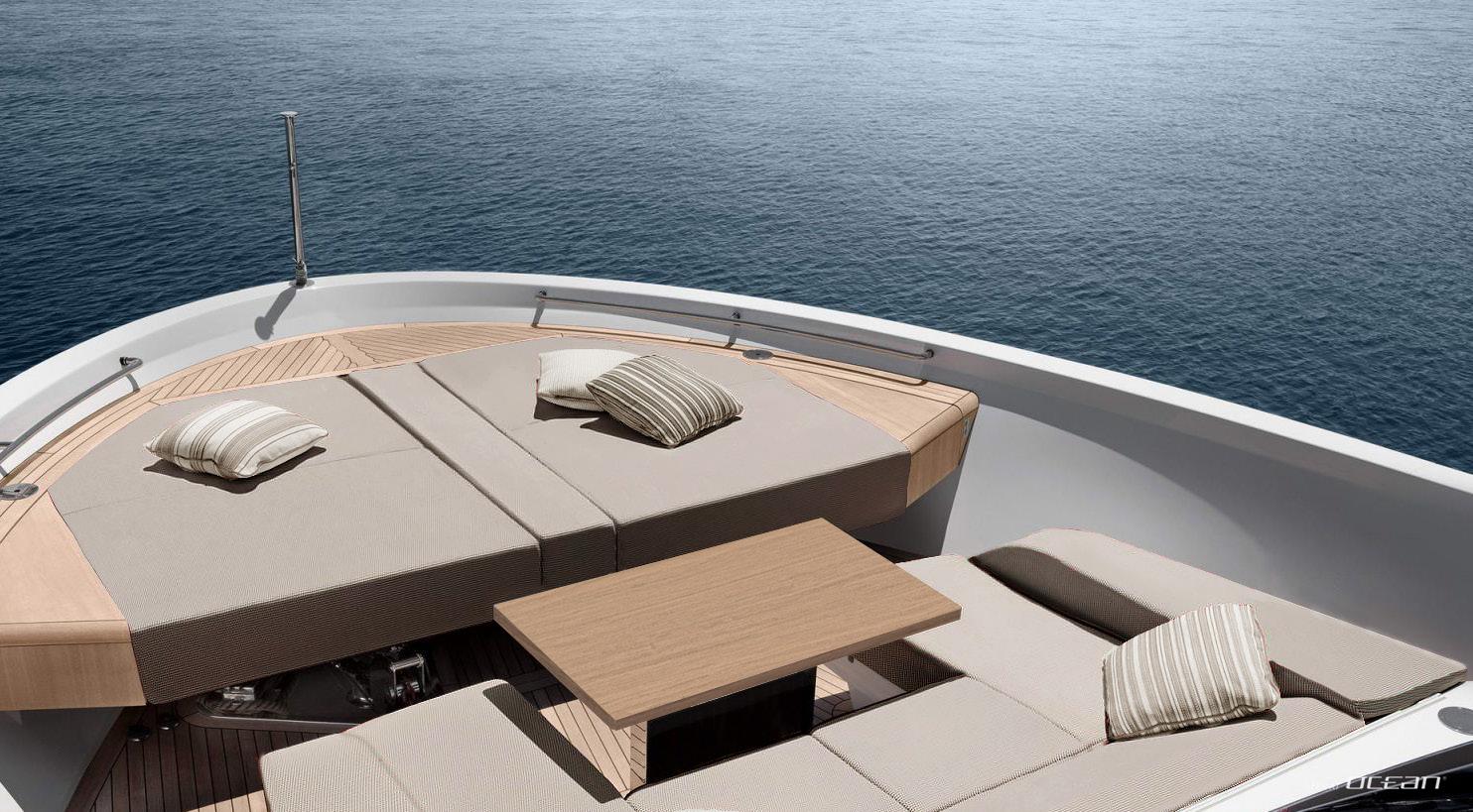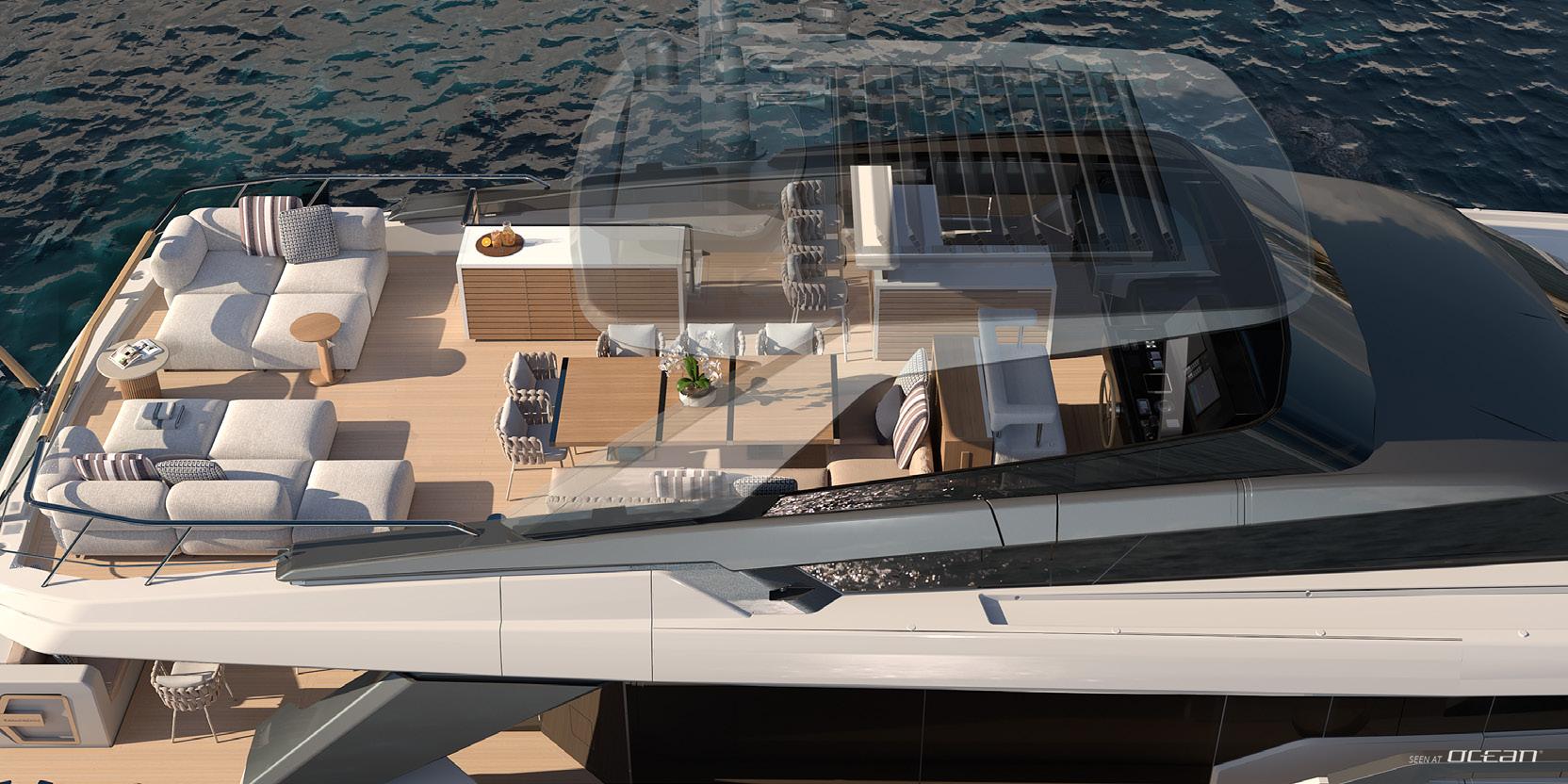 The asymmetric layout places the exterior walkway on one side only, freeing up space inside and opening the salon to expansive windows and panoramic views. This architectural approach enhances light, flow, and privacy, giving Sanlorenzo yacht DANLOU a calm, open atmosphere that feels both modern and timeless.