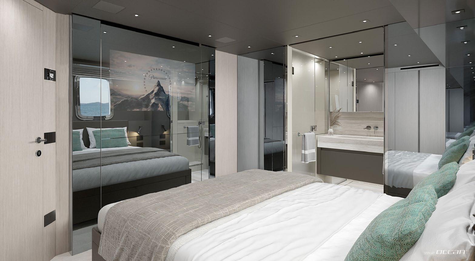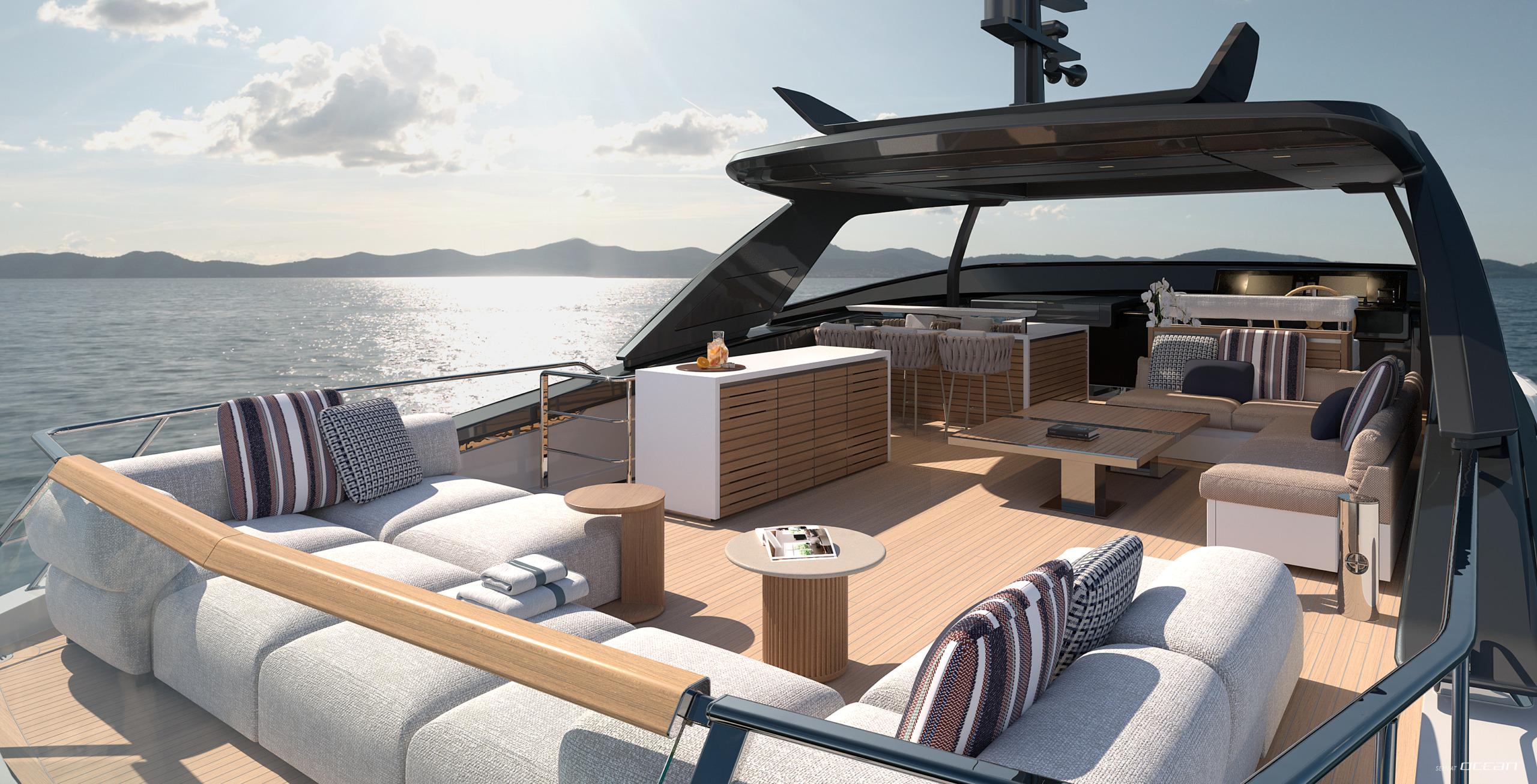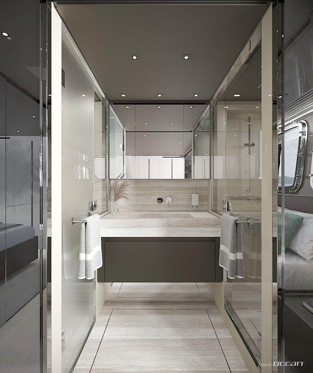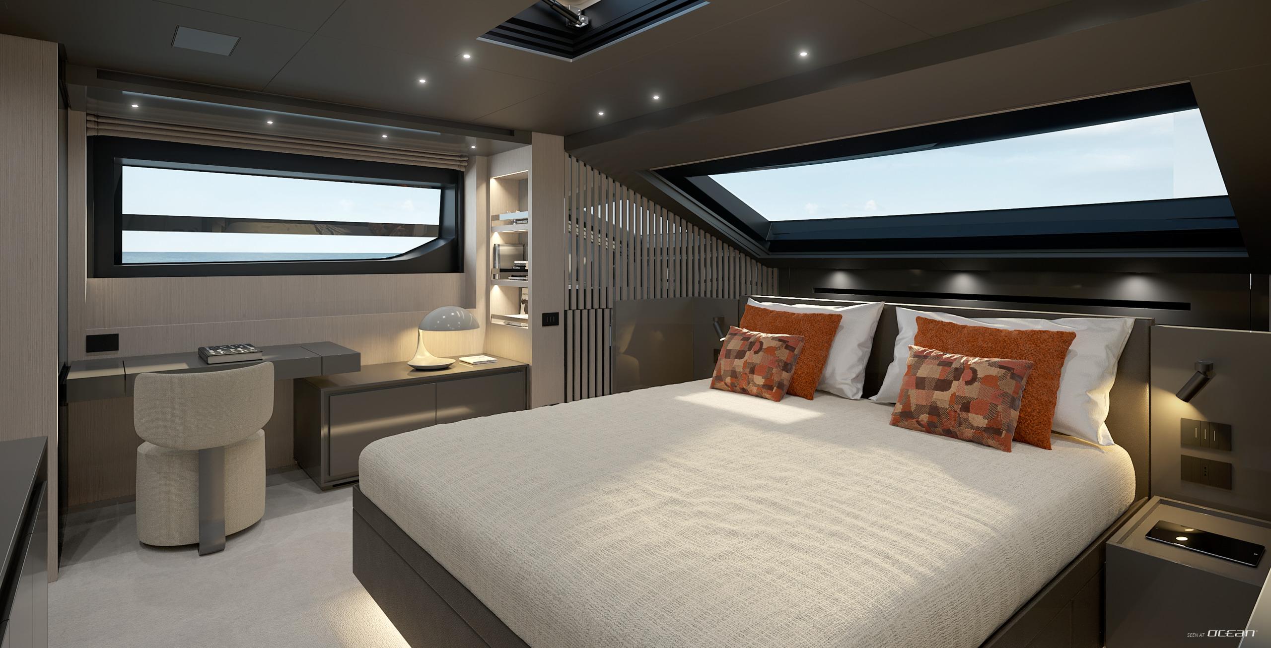 The asymmetric layout places the exterior walkway on one side only, freeing up space inside and opening the salon to expansive windows and panoramic views. This architectural approach enhances light, flow, and privacy, giving Sanlorenzo yacht DANLOU a calm, open atmosphere that feels both modern and timeless.