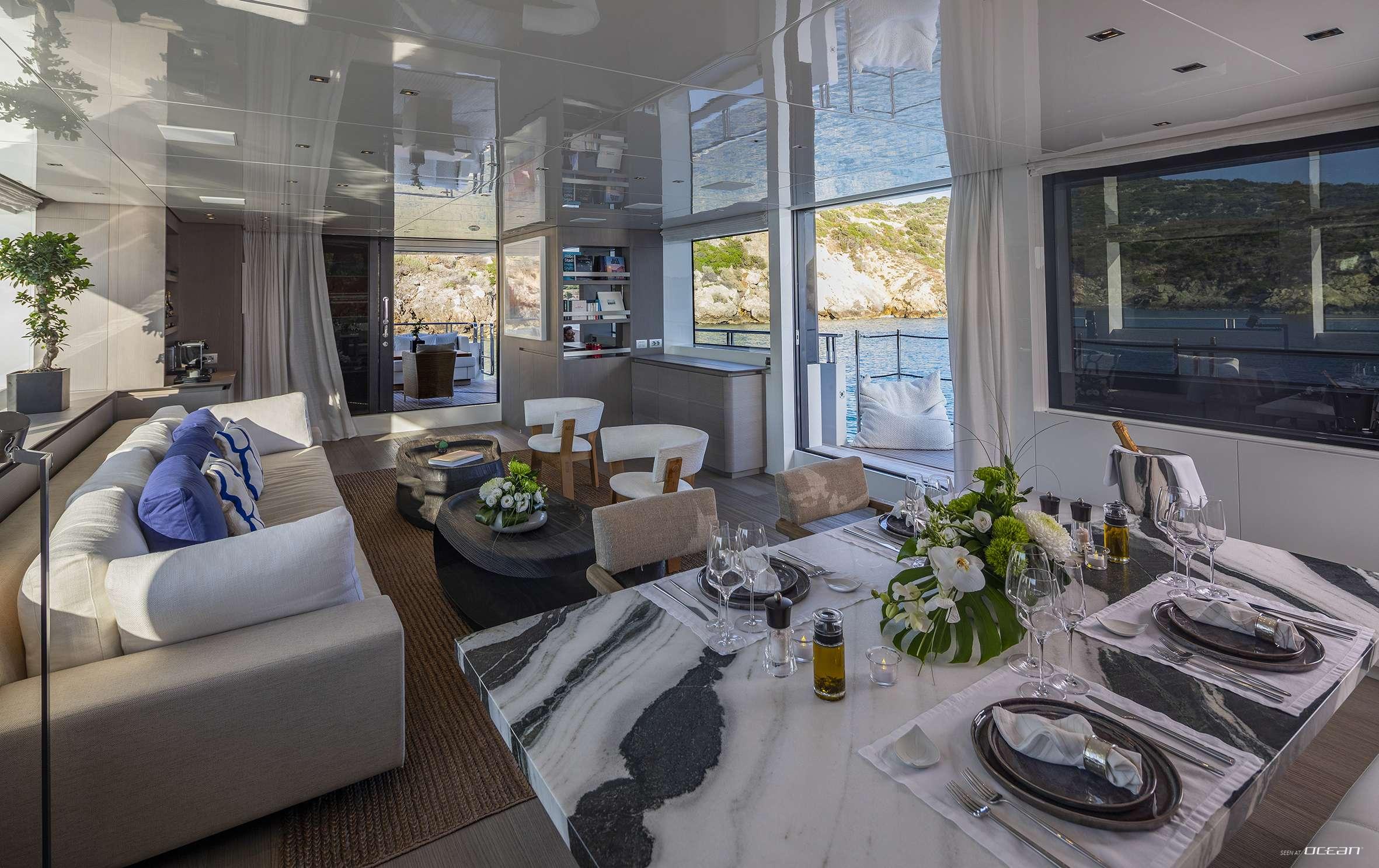 The interior of DINAIA luxury motor yacht for charter in Greece features a harmonious mix of modern materials, soft textures, and carefully selected furnishings. Large windows flood the main salon with natural light, enhancing the open-plan lounge and dining area. A hydraulic fold-down balcony on the main deck extends the living space toward the sea, offering a unique connection to the surrounding views. Stabilizers, both underway and at anchor, ensure smooth comfort throughout the journey.