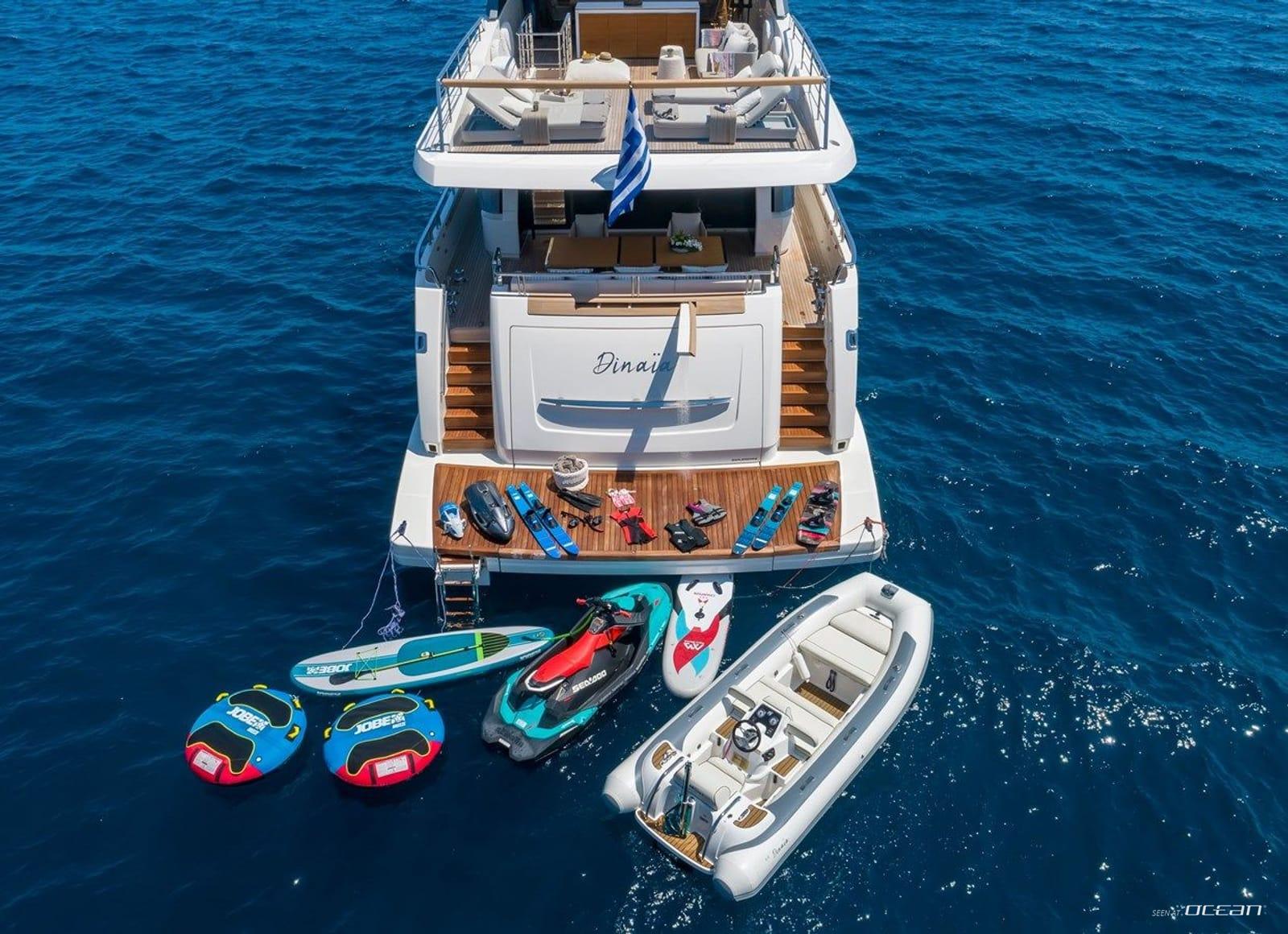 4.5m Williams tender with 120hp engine, waterskis, 3-seater jet ski Sea Doo SPARK TRIXX, SeaNXT sea scooter, monoski, 2-person kayak, 2 stand-up paddleboards, windsurf, 2 donuts, 2 carbon bicycles, fishing, spearfishing and snorkeling gear.