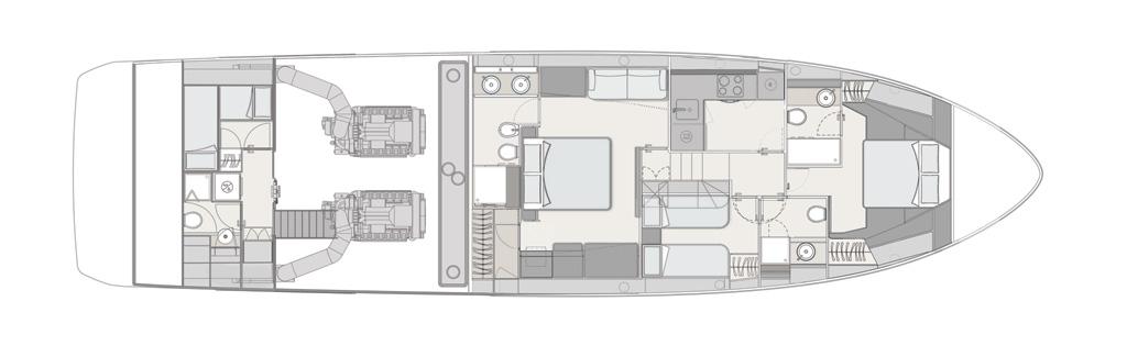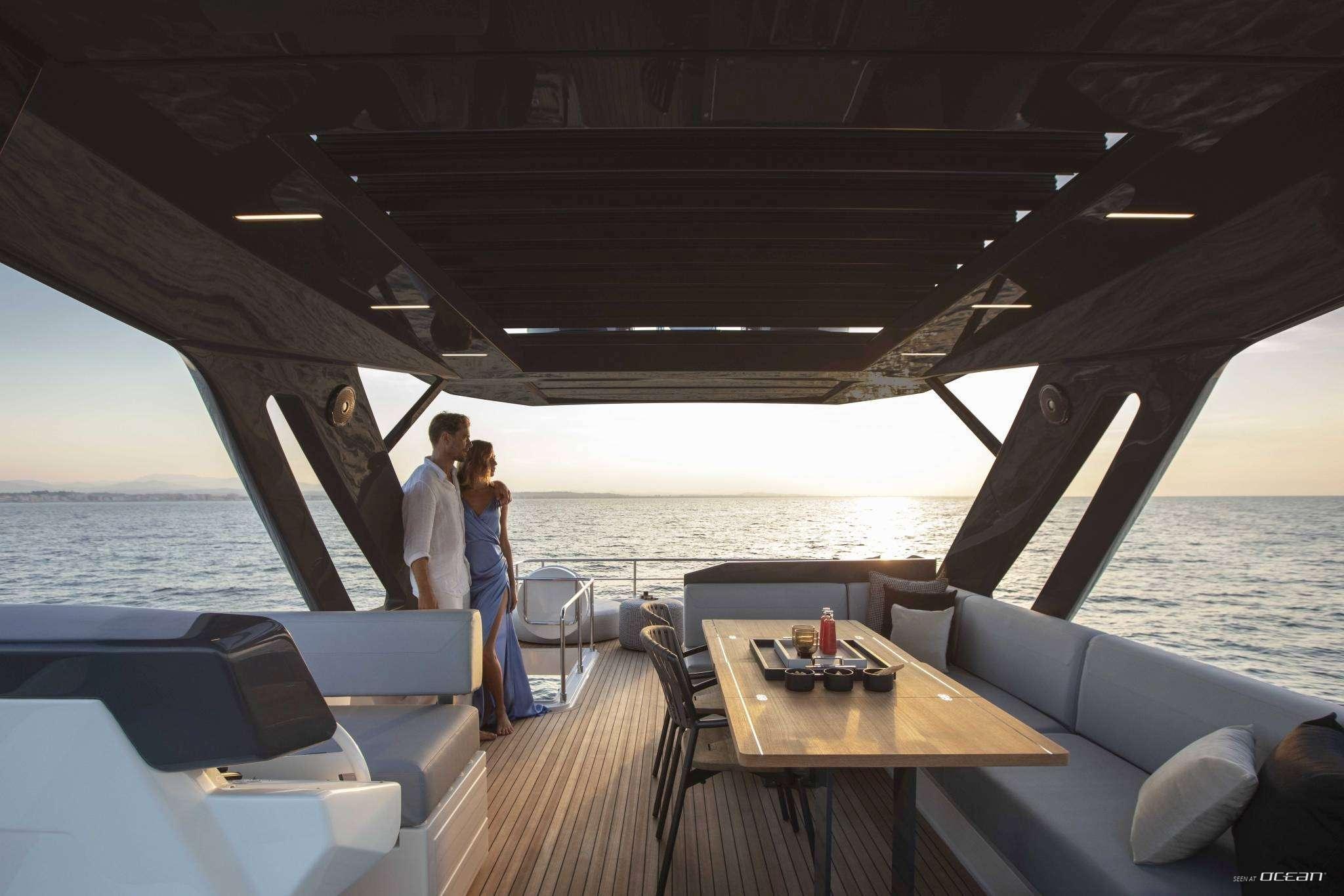 The Ferretti 720 is celebrated for one of the best flybridges in her class, thoughtfully arranged into distinct zones for sunbathing, dining, and helm operation. This elevated space becomes the social heart of the yacht, perfect for long lunches, sunset aperitivi, and relaxed cruising along the coast. A spacious aft cockpit with dining further enhances outdoor living, with smooth flow down to the swim platform, reinforcing the yacht’s focus on open-air social spaces and effortless enjoyment.