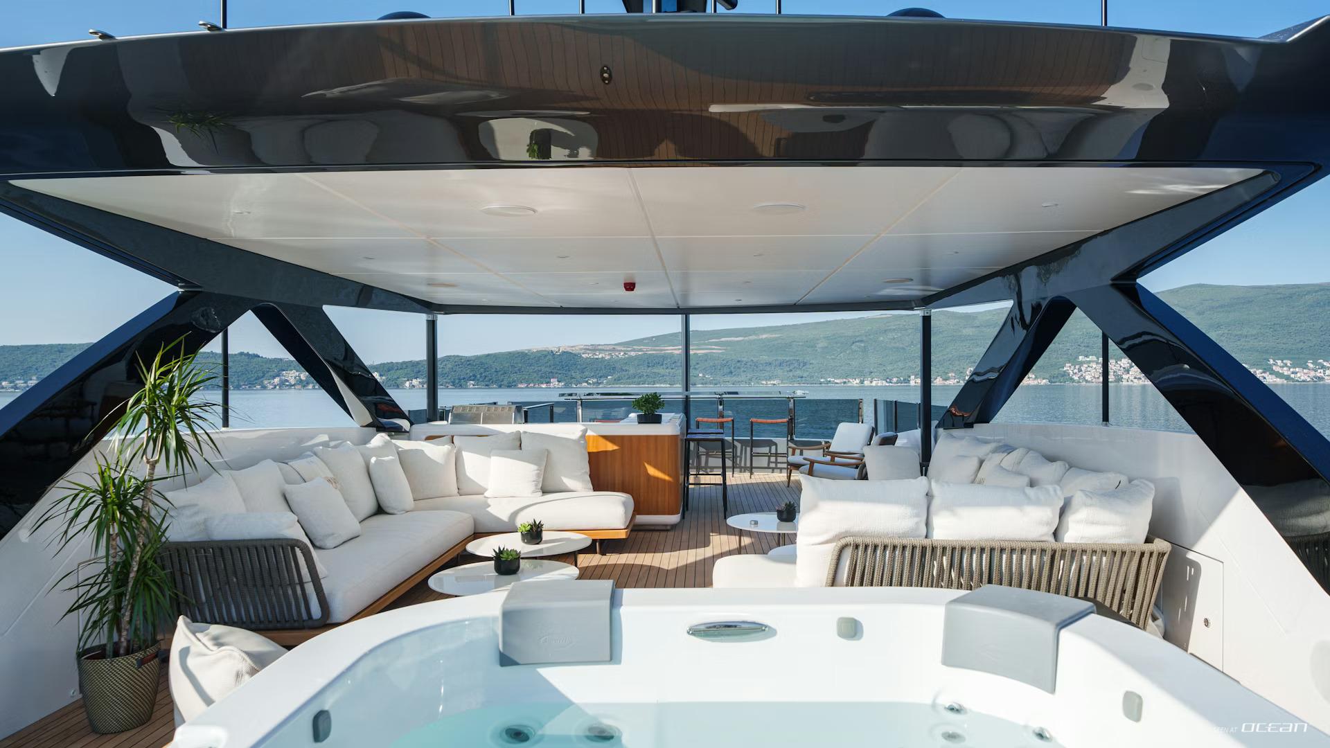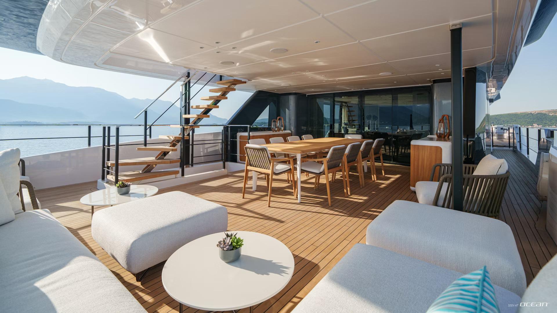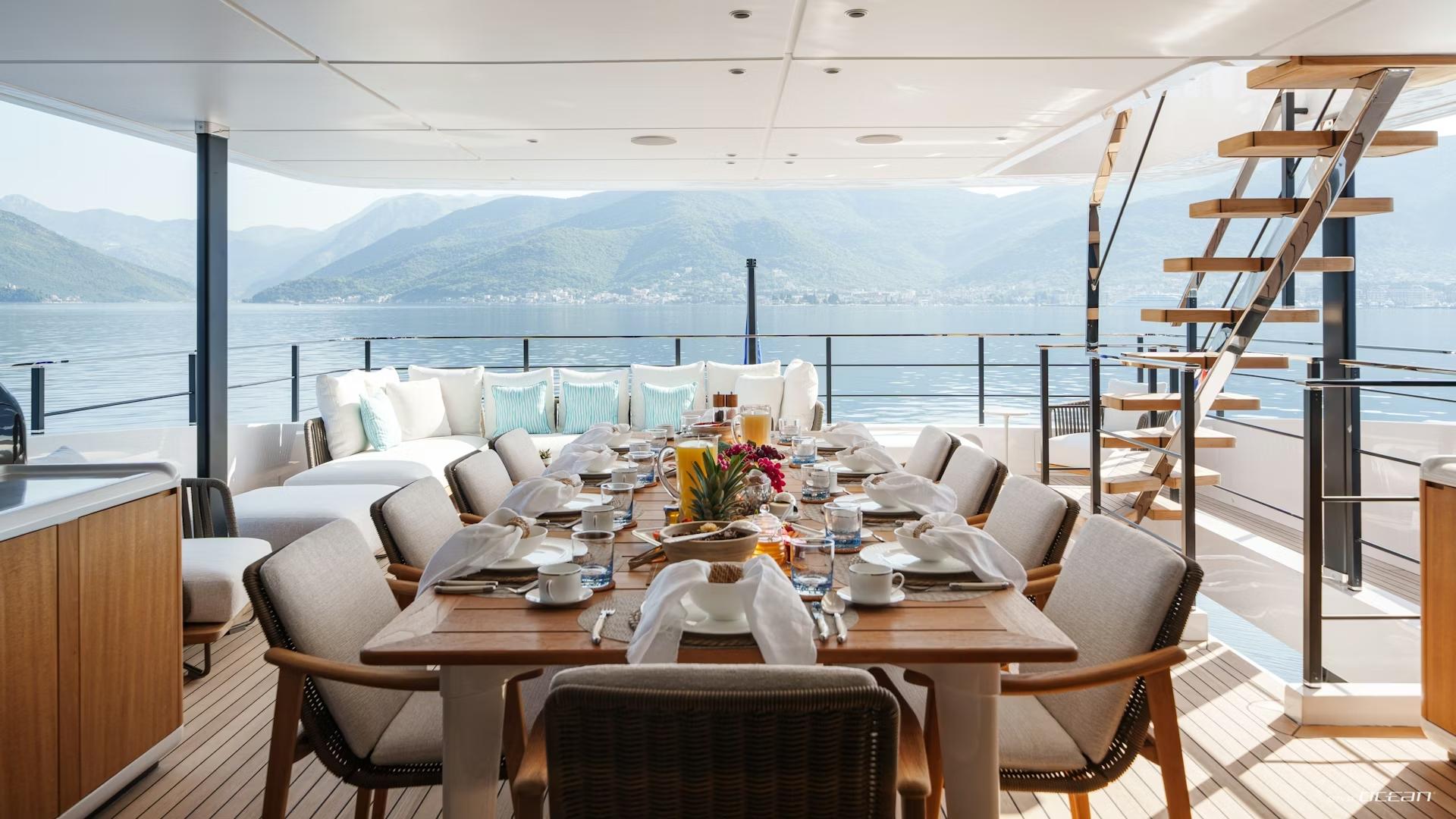 Charter Yacht FIFI is designed for life outside, where each deck offers a distinct setting to relax or socialize. The sundeck features a jacuzzi, bar, and generous lounge areas, while the skylounge aft connects seamlessly to an elegant outdoor dining space through full-height cascading doors. Forward, a private bow lounge creates a quieter retreat, while aft the beach club and swim platform extend the experience directly to the water.