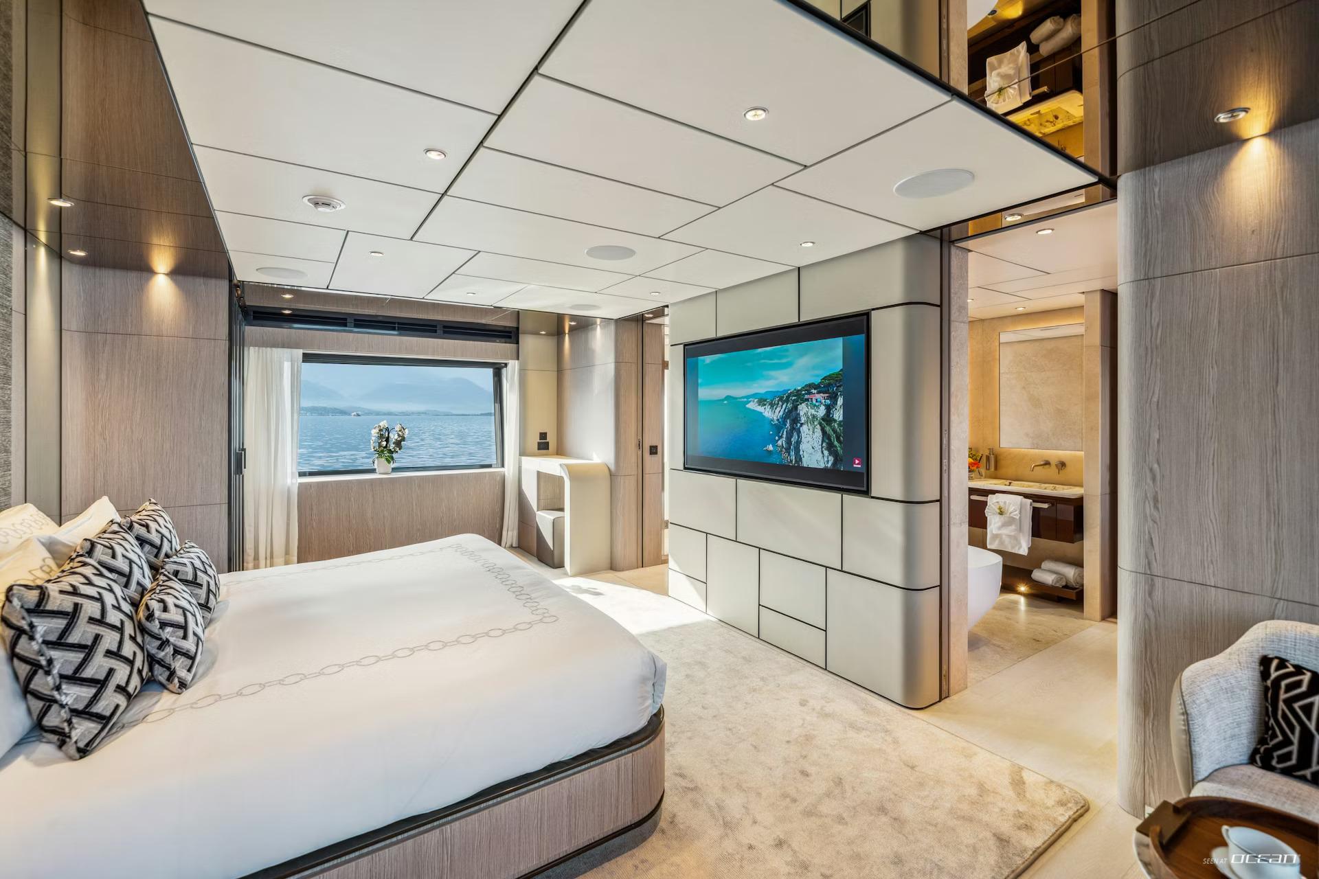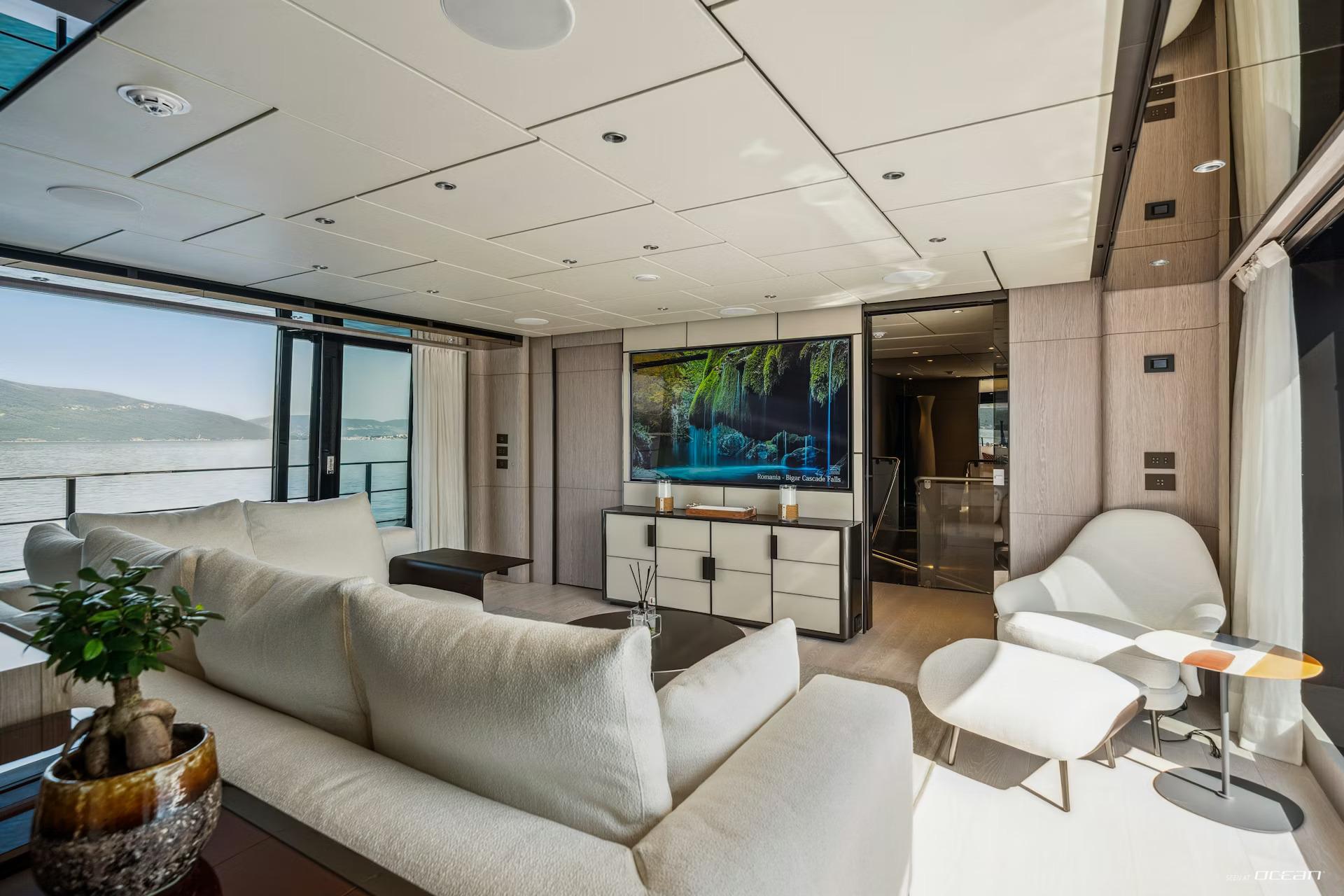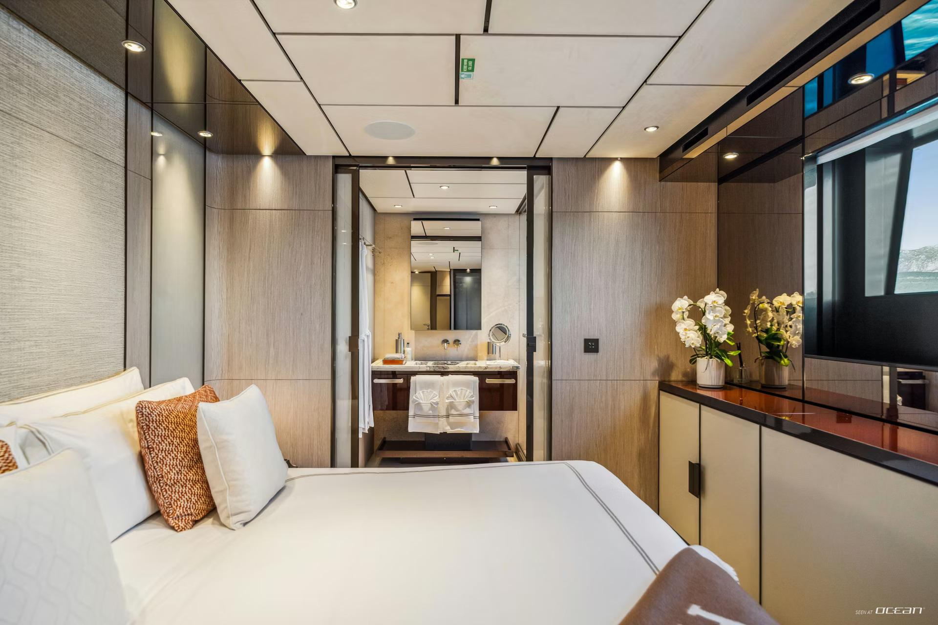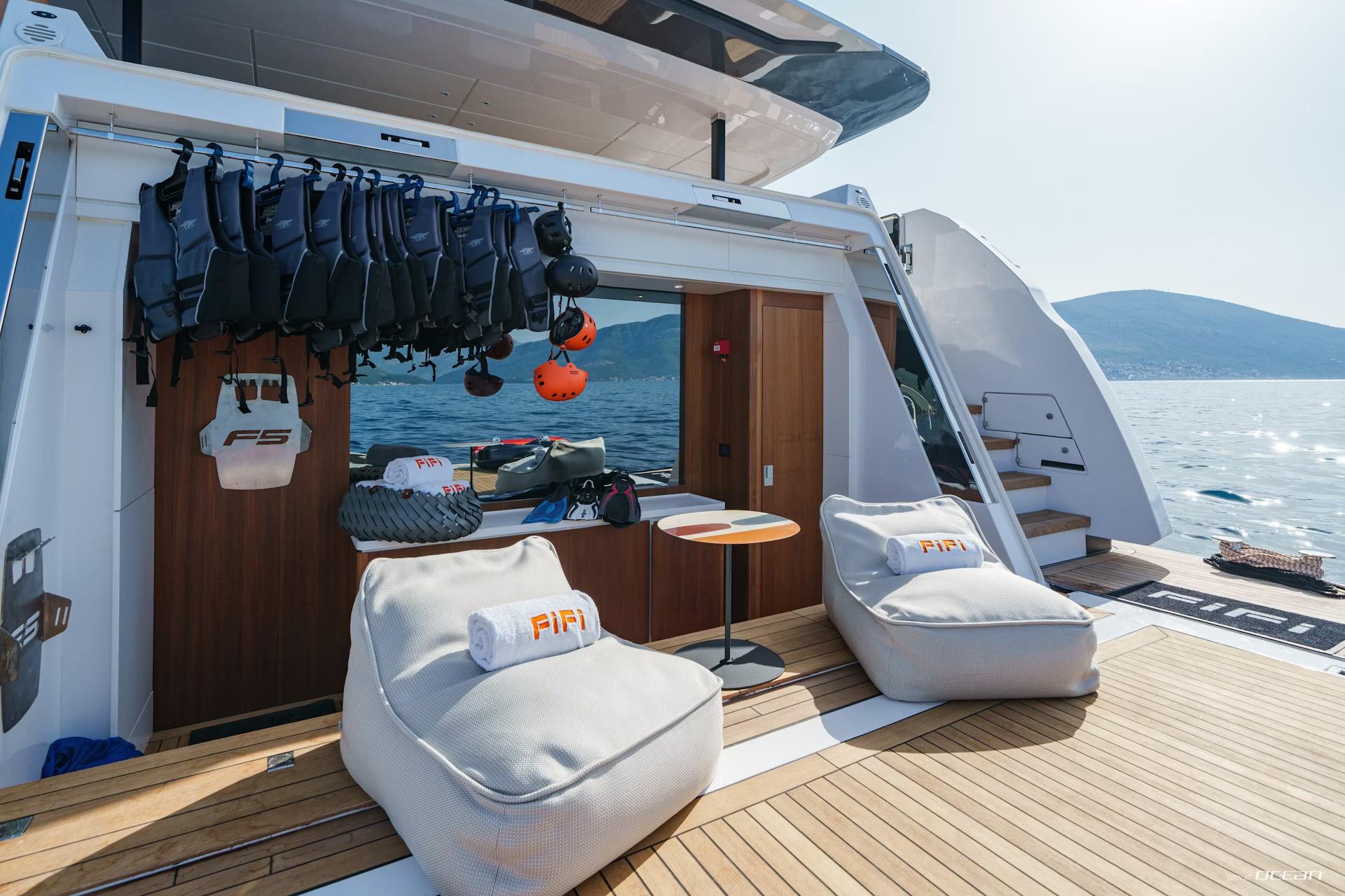 Up to 10 guests are accommodated across 5 well-appointed cabins, including a main deck master suite and a flexible arrangement of double and twin cabins below. On board, M/Y FIFI for charter combines contemporary design with everyday comfort, featuring Starlink internet, smart TVs, integrated sound systems, and a curated music and movie library. Stabilization systems ensure a smooth and relaxing experience both underway and at anchor.