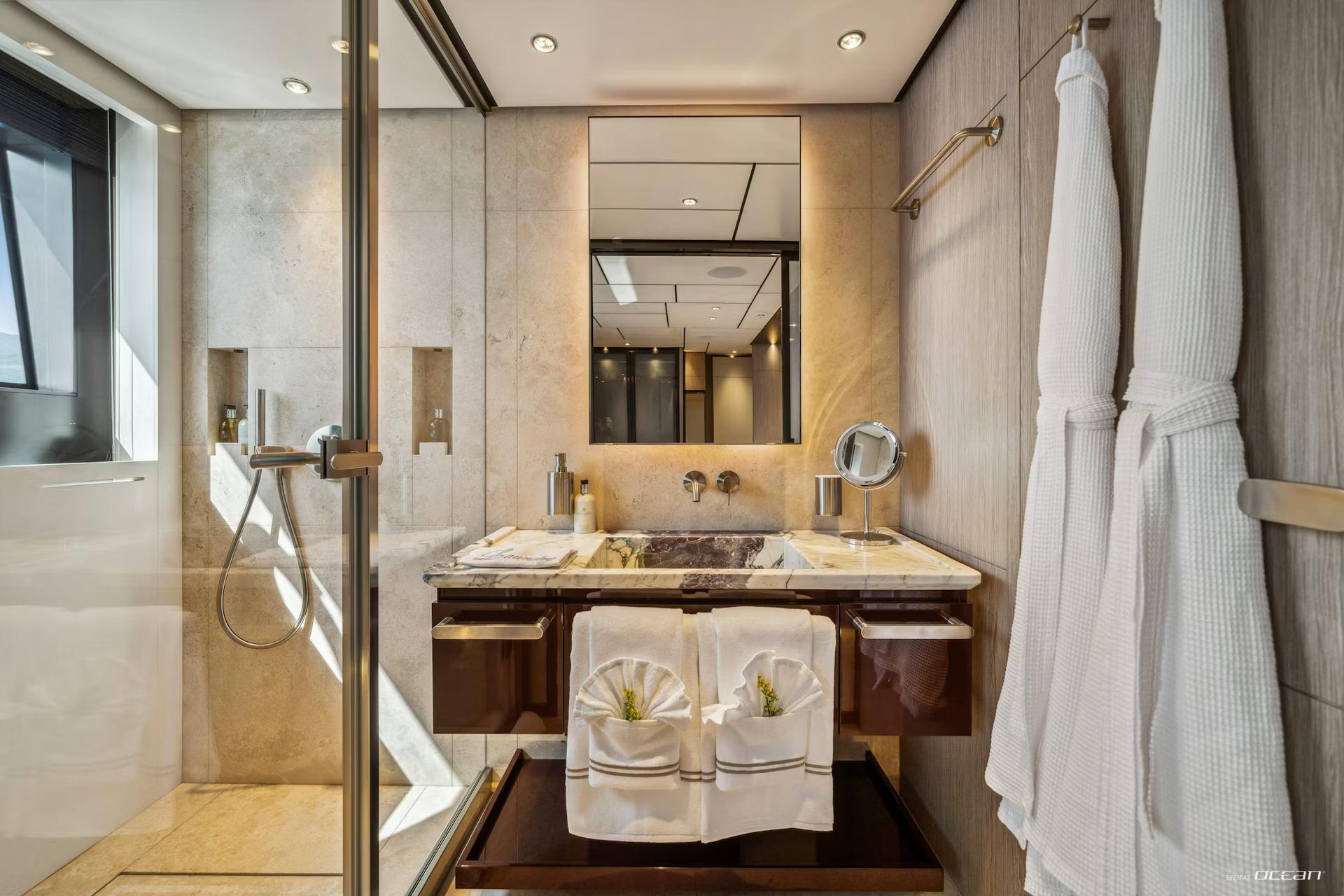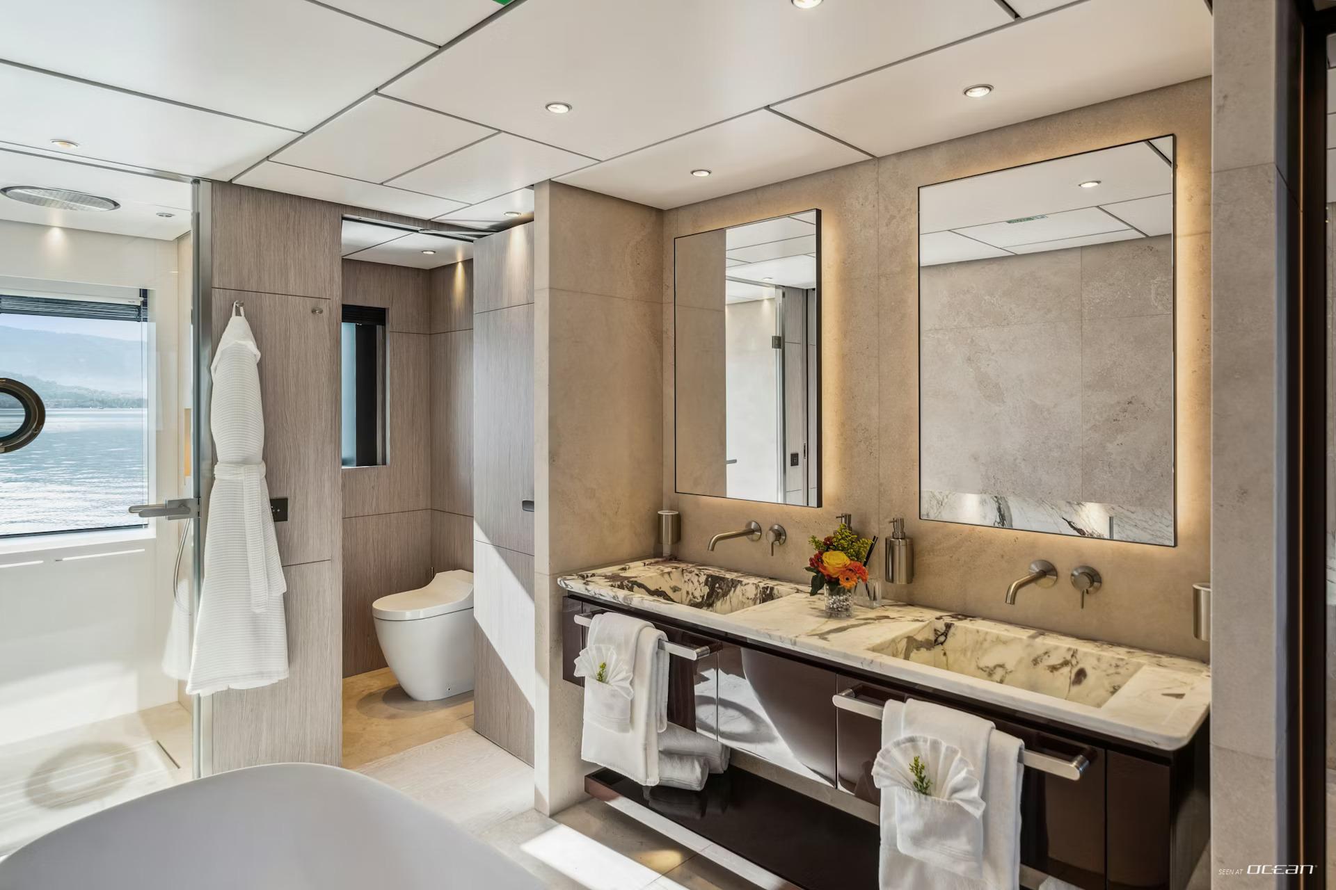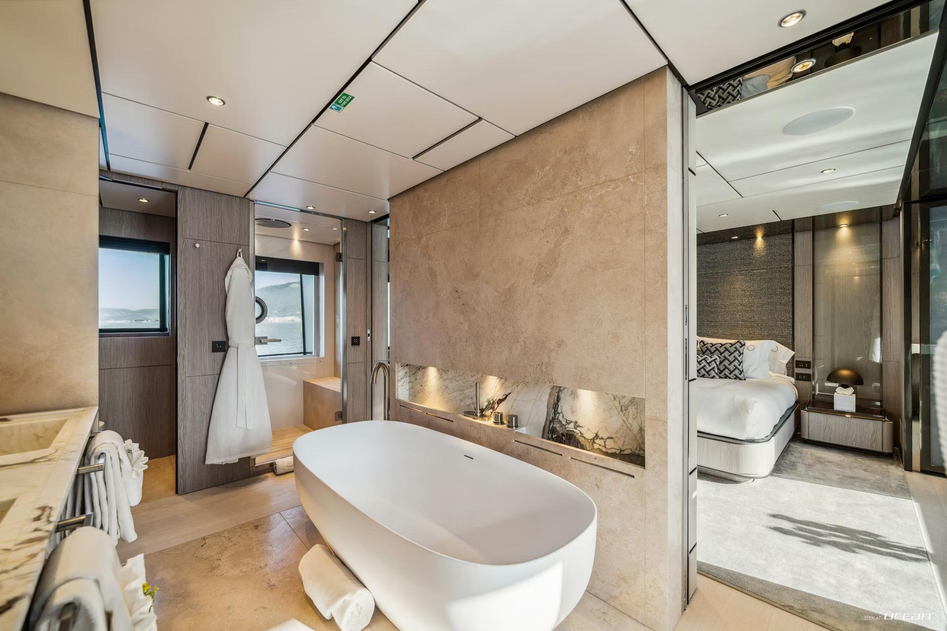 All cabins with en-suite bathrooms, air condition throughout, 2 generators, watermakers, deck jacuzzi, stabilizers at anchor and underway, TV in salon and all cabins, Starlink Wi-Fi internet, Bluetooth sound system throughout the yacht with outdoor speakers, music and movie library, gym gear, beach club, and a variety of water toys.